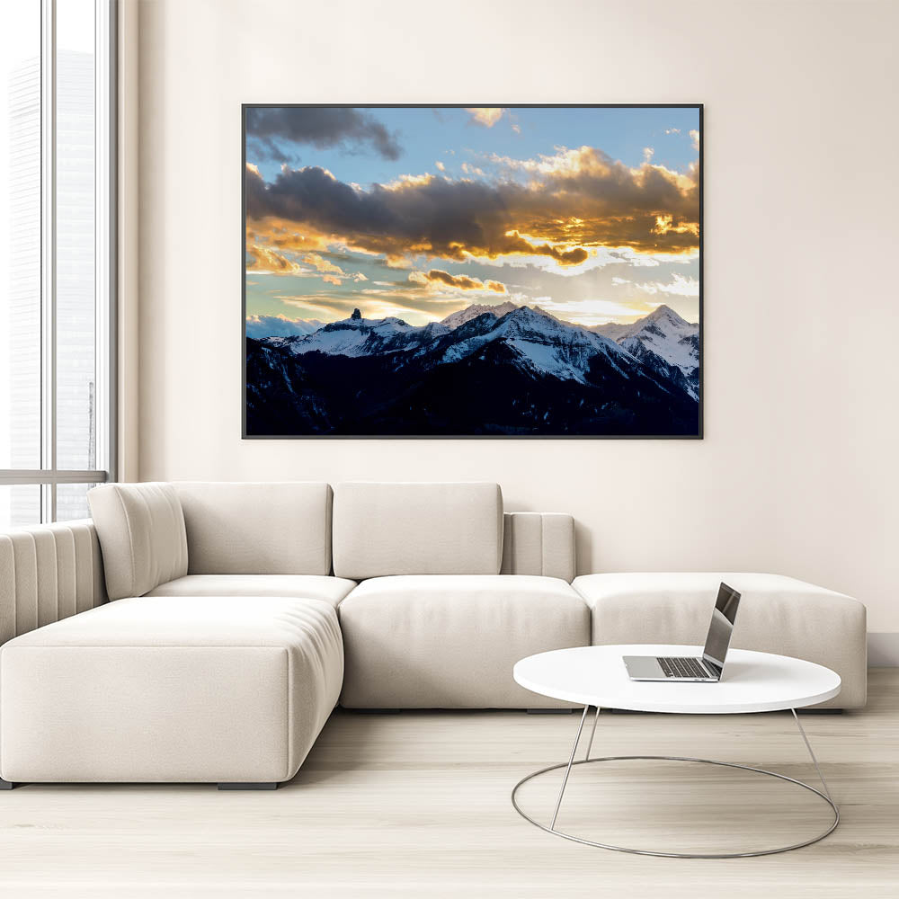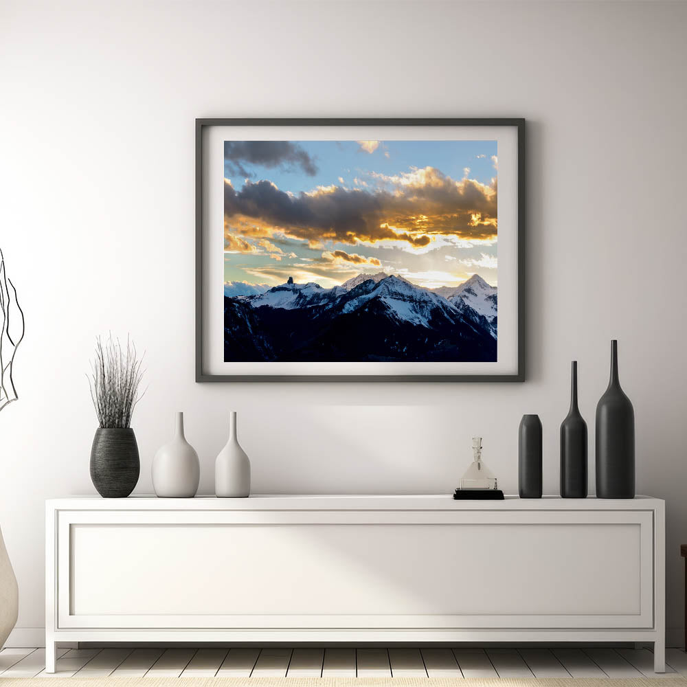 Experience the breathtaking beauty of Telluride's mountains with this stunning sunset wall art. This photograph captures the iconic Colorado peaks bathed in the warm glow of a vibrant sunset, with clouds drifting across the sky. The contrast between the snow-capped mountains and the golden hues of the sky creates a mesmerizing scene, perfect for adding a touch of nature’s tranquility to your space.