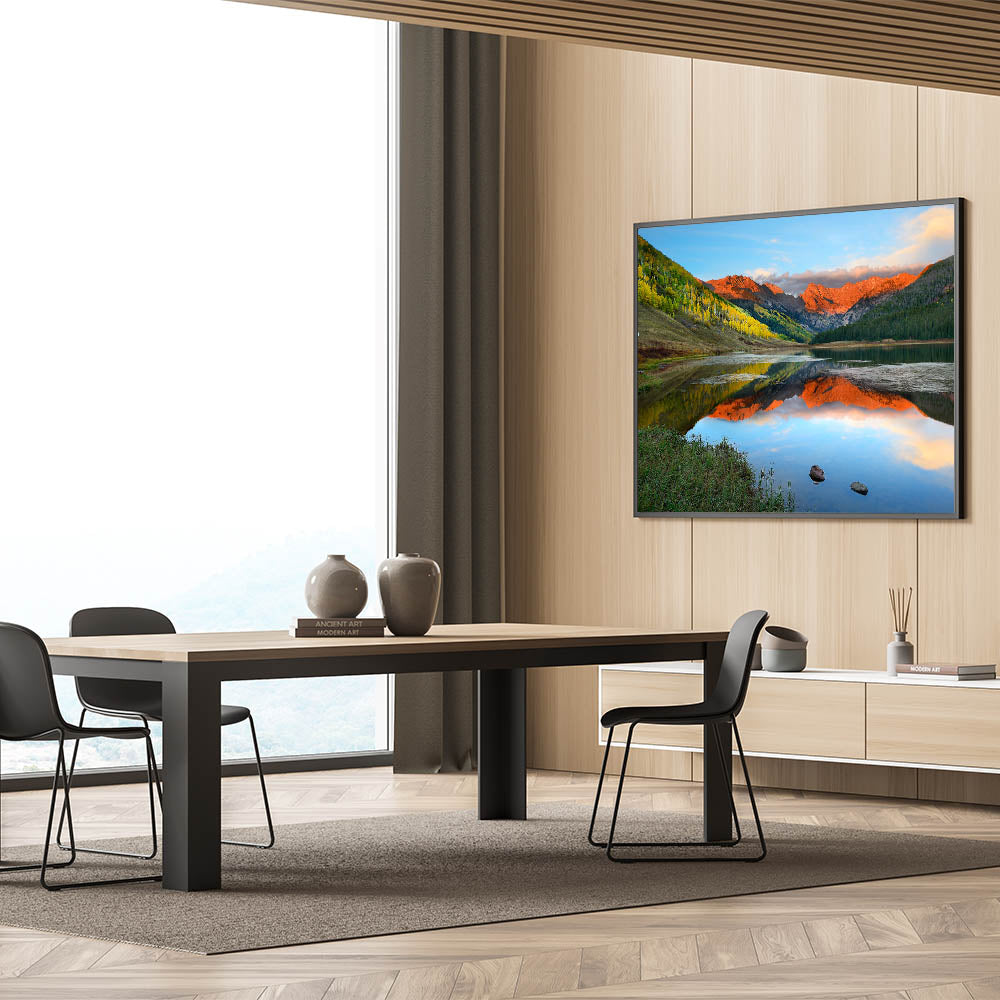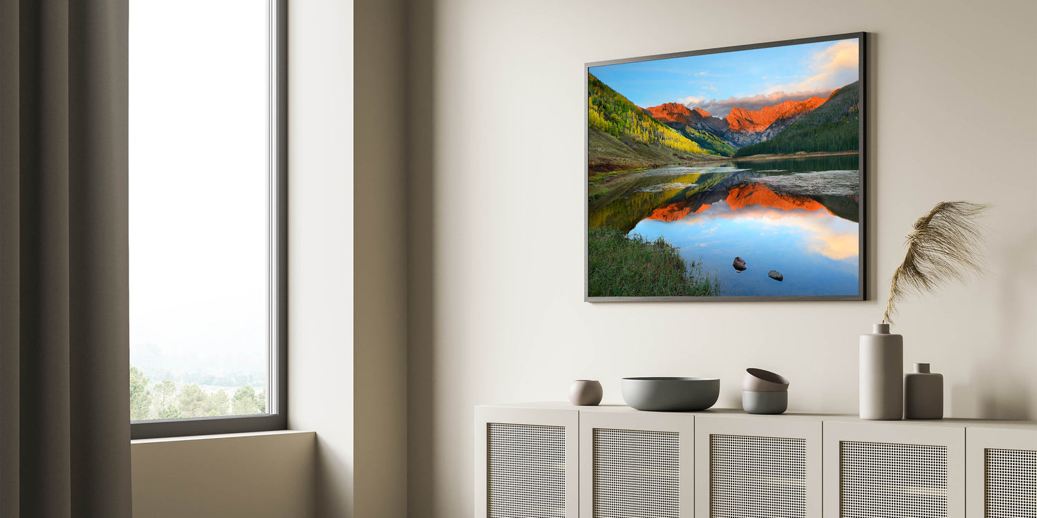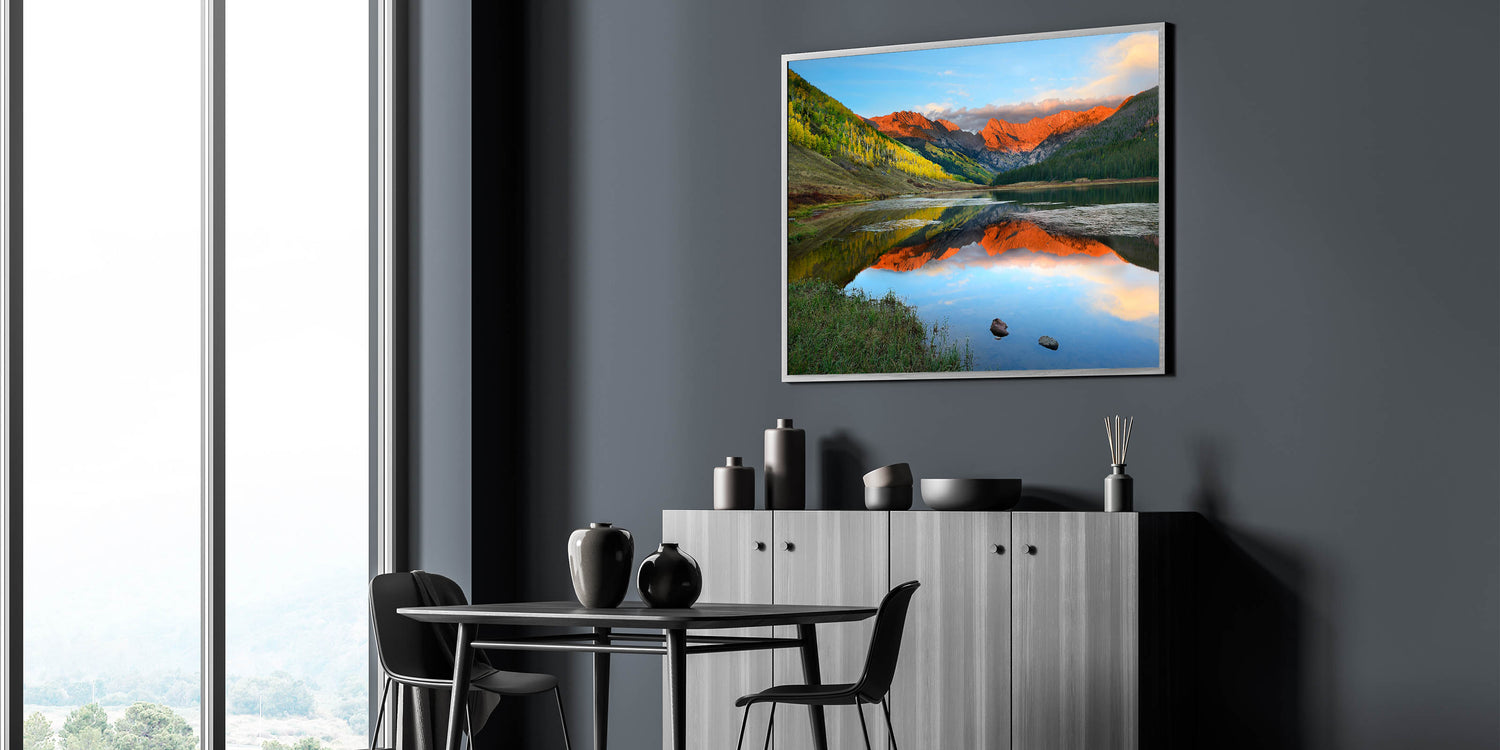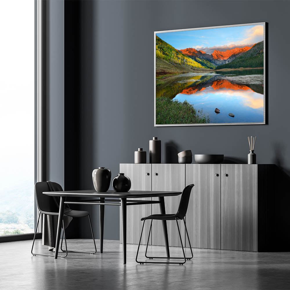 Immerse yourself in the vibrant beauty of Vail, Colorado, with this stunning wall art showcasing a breathtaking sunset reflected over serene mountain lakes. The vivid colors of the landscape bring a sense of calm and beauty to any space, making it perfect for nature lovers and mountain enthusiasts. This piece of art is available in multiple formats, ensuring the perfect fit for your home decor.