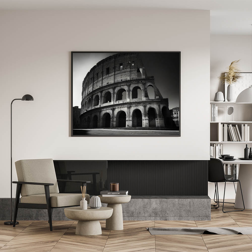 This stunning black and white Colosseum print captures the iconic structure in a dramatic and moody light. The deep shadows and sharp contrasts highlight the architectural beauty of this ancient Roman landmark, making this piece a powerful statement for any space. Whether you are a history lover or simply appreciate minimalist decor, this artwork will bring a timeless elegance to your home.