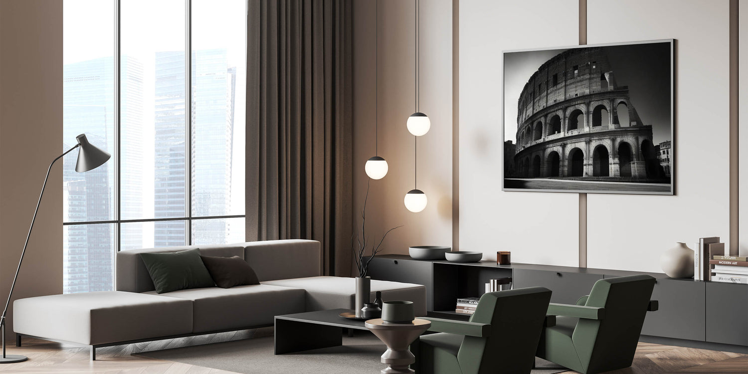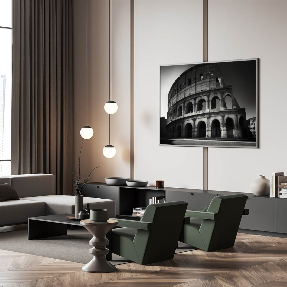- Moody Black and White: The dramatic contrasts of this black and white art bring out the architectural details of the Colosseum in an extraordinary way.
