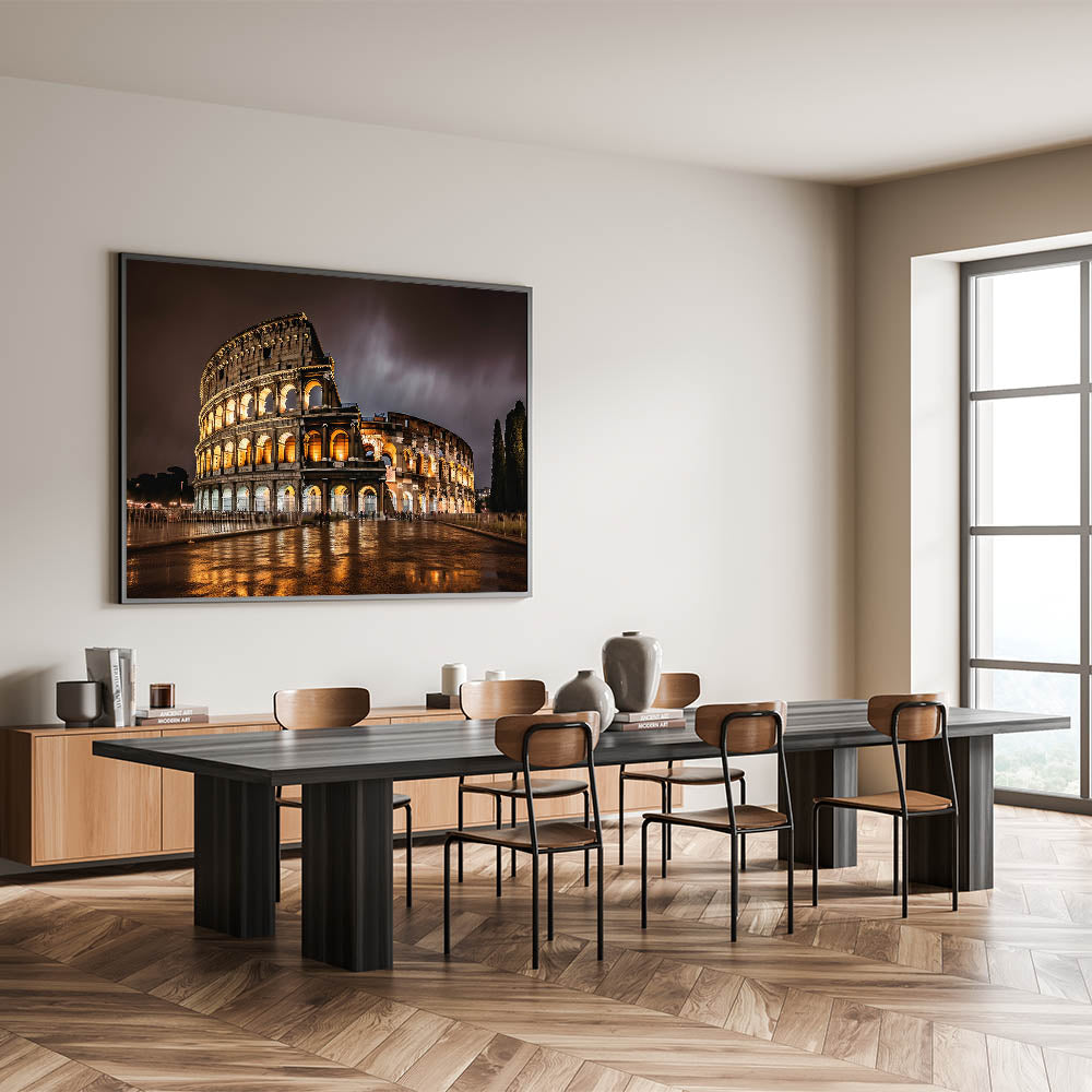 Bring the dramatic beauty of Rome’s Colosseum at night into your home with this captivating canvas. The glowing arches of the Colosseum under a dark, moody sky create a stunning contrast, making this piece a perfect addition to any space. This striking artwork captures the timeless essence of Rome’s most famous landmark in a beautiful nighttime setting.