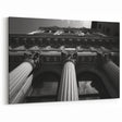 Add a dramatic touch to your space with this Architectural Columns Art Poster. This stunning black-and-white artwork captures the grandeur of classical architecture from a unique perspective, looking upward towards towering columns adorned with intricate details. The strong contrasts and sharp lines make this piece perfect for modern interiors, adding depth and sophistication to any room.