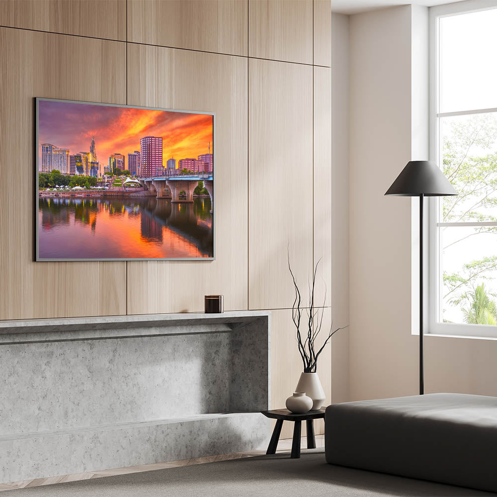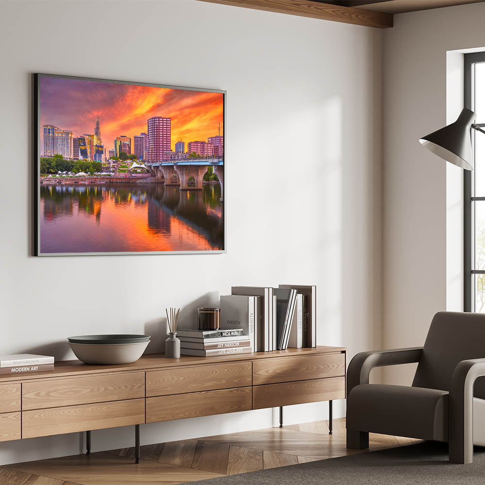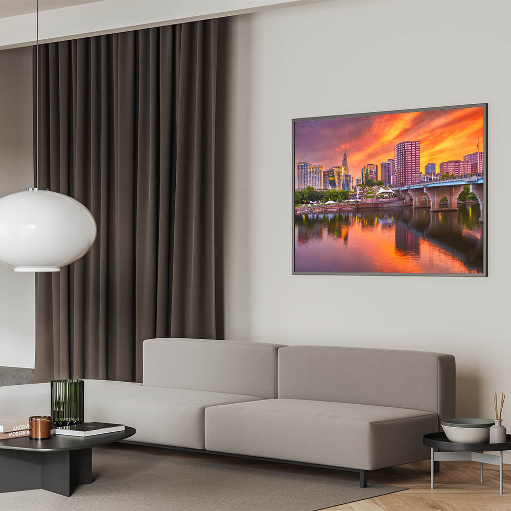 This stunning wall art captures the dramatic beauty of Hartford’s skyline as it’s bathed in the warm glow of a fiery sunset. The brilliant oranges and reds of the sky reflect off the tranquil waters of the Connecticut River, creating a mesmerizing and vibrant display. This Connecticut scenery print showcases the architectural elegance of the city and the natural beauty of its surroundings, making it the perfect addition to your home or office.