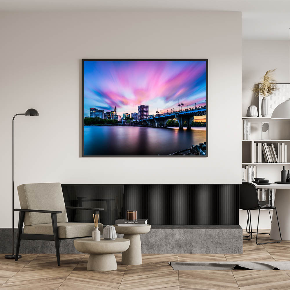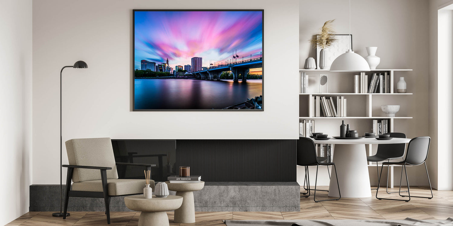 Capture the breathtaking beauty of the Connecticut capital with this stunning wall art depicting Hartford's skyline at sunset. This image highlights the iconic architecture of downtown Hartford with a captivating burst of color across the sky. The blend of rich pink, purple, and blue hues creates a sense of movement and tranquility that transforms any space.