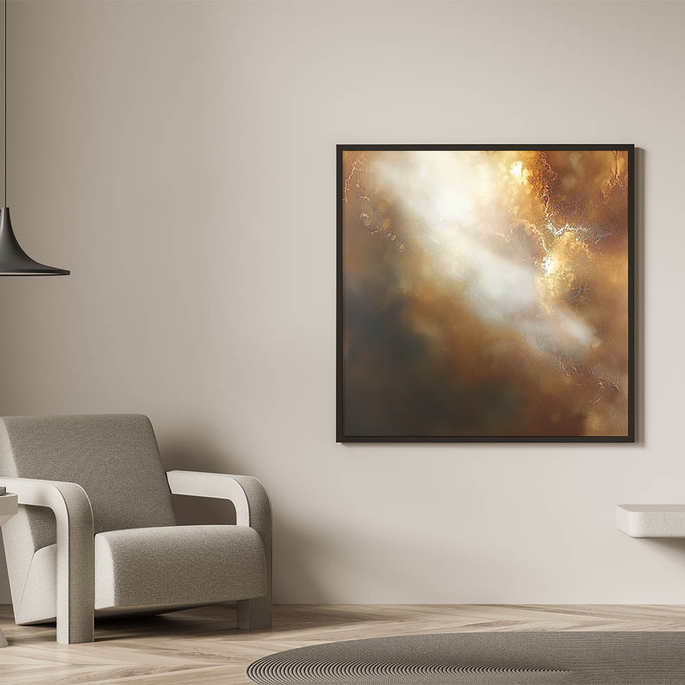 Embrace earthy elegance with this atmospheric piece from our abstract art prints collection. A part of the Modern Abstract series, this artwork evokes a cosmic, dreamlike quality with swirling tones of gold, brown, and soft white. The glowing central light effect contrasts beautifully with the rich shadowy tones, creating depth and emotion that draws the eye. Ideal for collectors seeking something soulful, moody, and sophisticated.