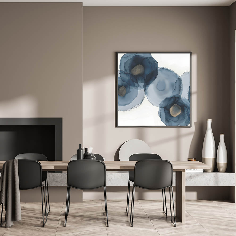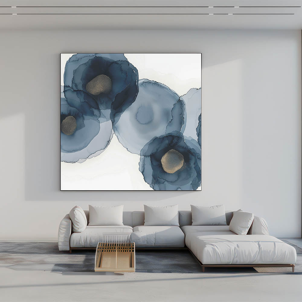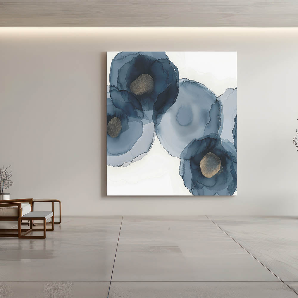 Bring depth and grace into your space with this striking piece from the Abstracts in Earthen Harmony collection. Featuring soft, layered navy blooms with golden centers, this abstract wall art blends fluid motion with sophisticated elegance. The organic watercolor effect creates a modern interpretation of floral forms, ideal for spaces that need a touch of harmony and luxury.