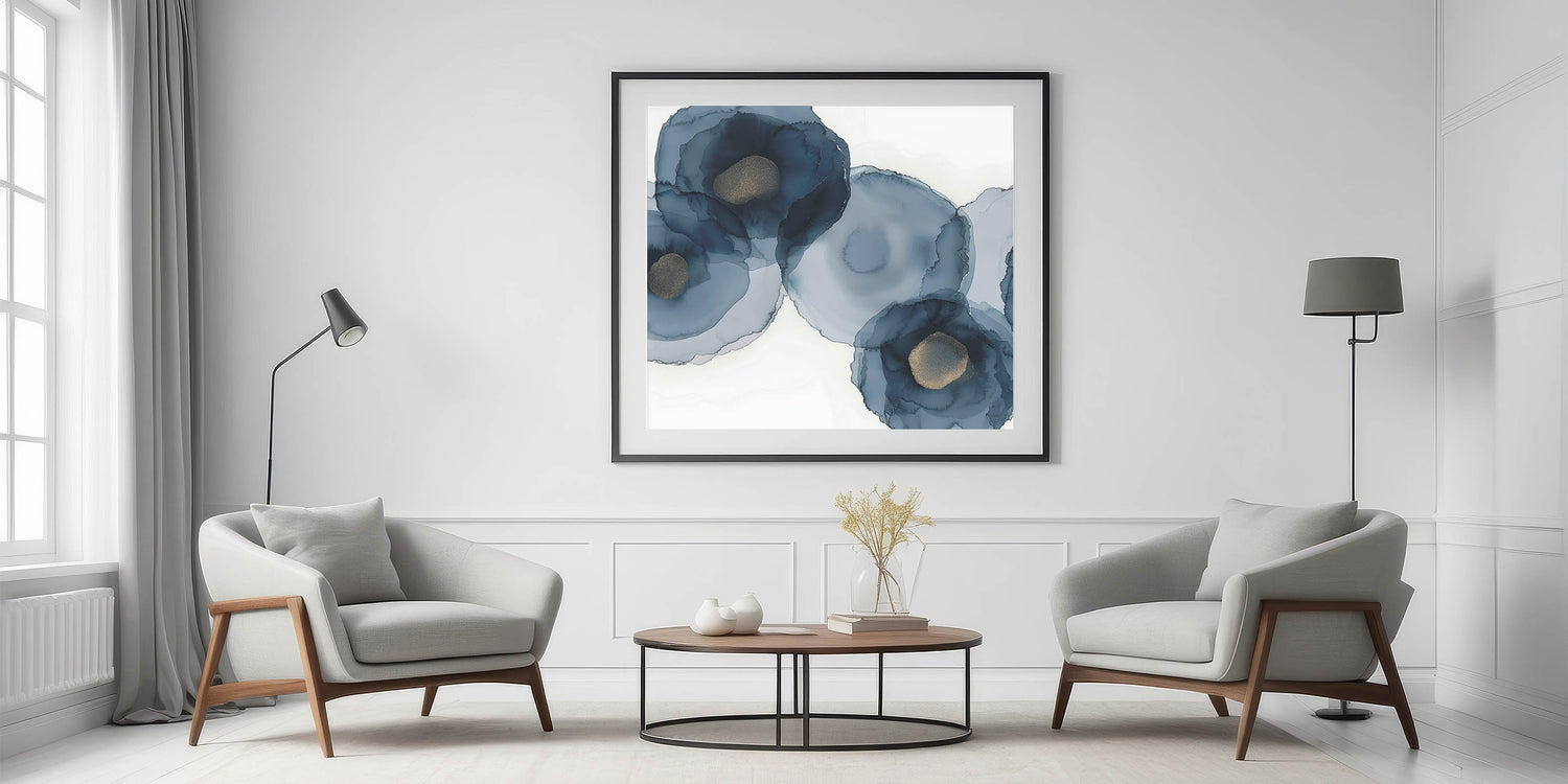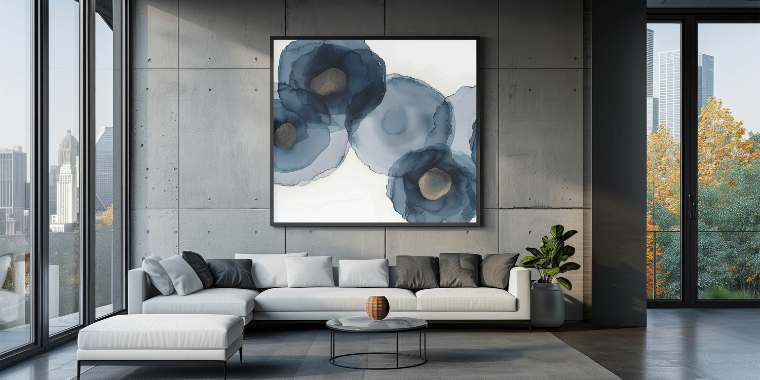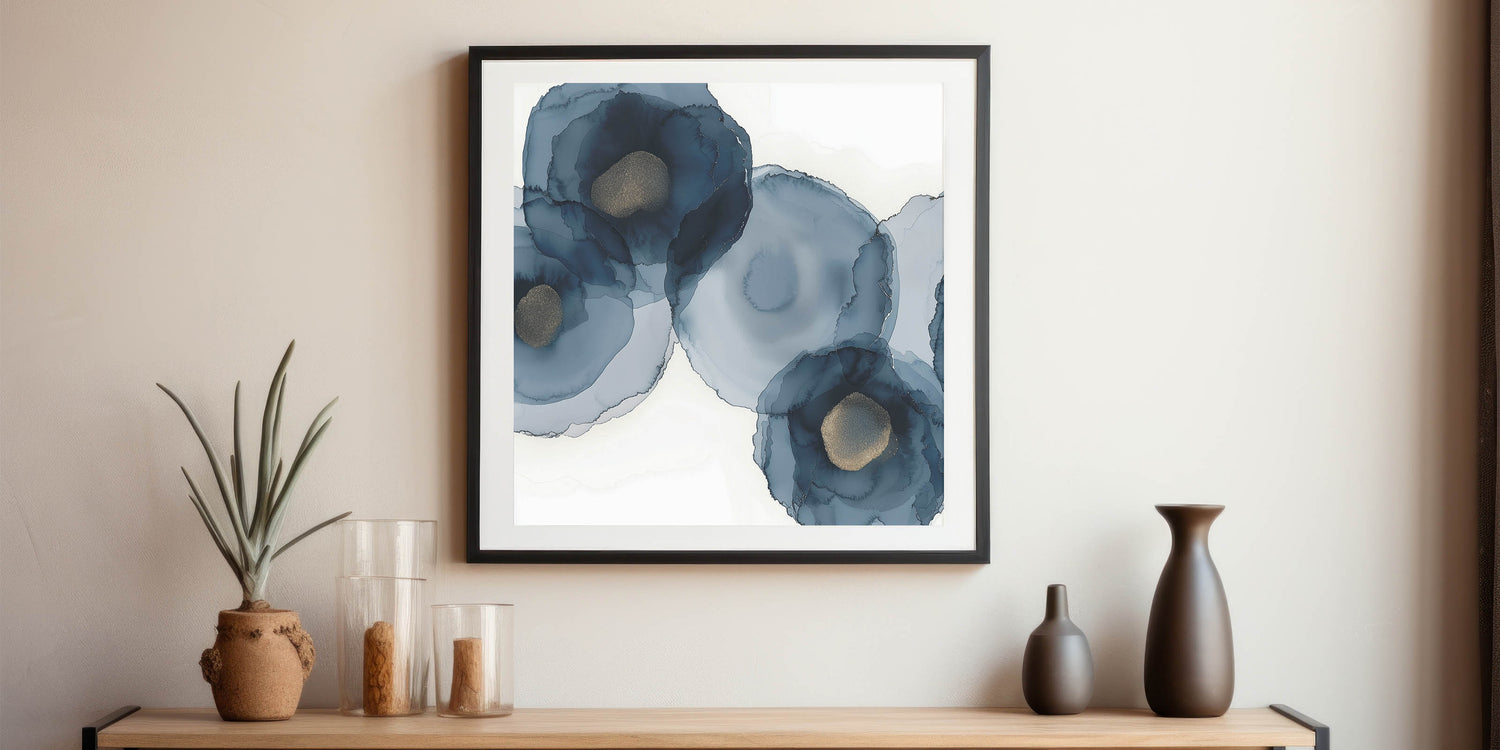 Bring depth and grace into your space with this striking piece from the Abstracts in Earthen Harmony collection. Featuring soft, layered navy blooms with golden centers, this abstract wall art blends fluid motion with sophisticated elegance. The organic watercolor effect creates a modern interpretation of floral forms, ideal for spaces that need a touch of harmony and luxury.