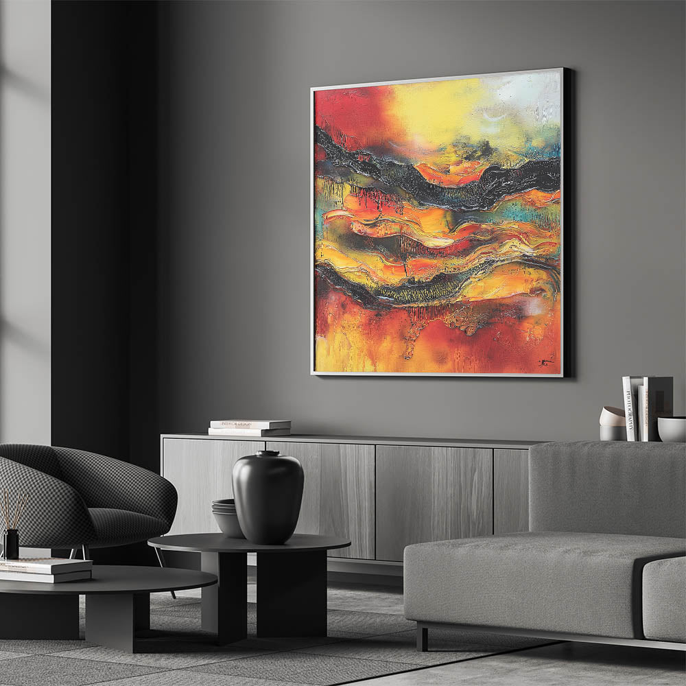 Raw and energetic, this piece from our Earthen Harmony Abstracts commands attention with textured depth and bold color. Featuring rich tones of black, burnt orange, beige, and soft white with cobalt highlights, this canvas wall art merges organic chaos with deliberate form. It’s ideal for bold yet grounded modern home decor.
