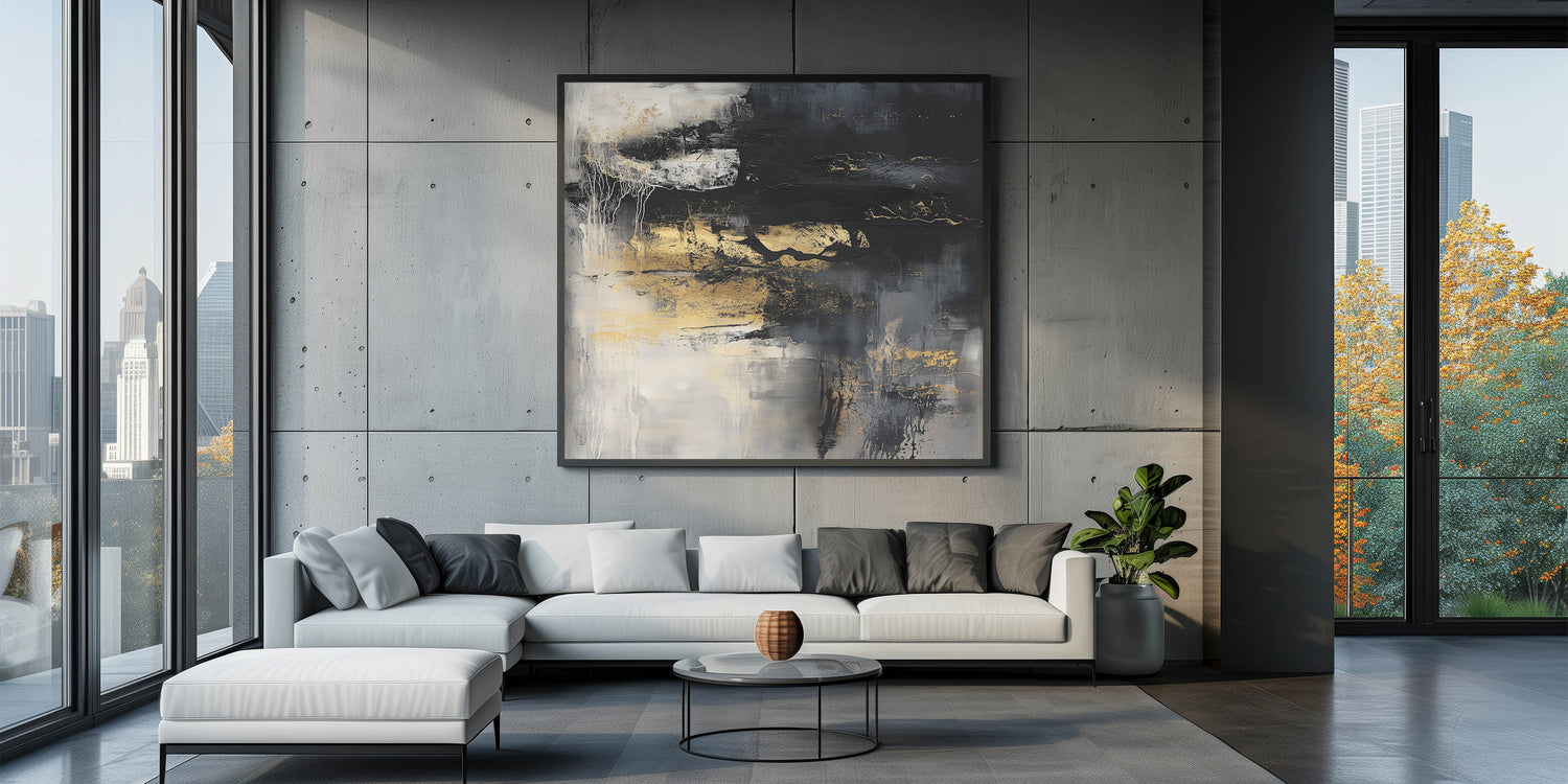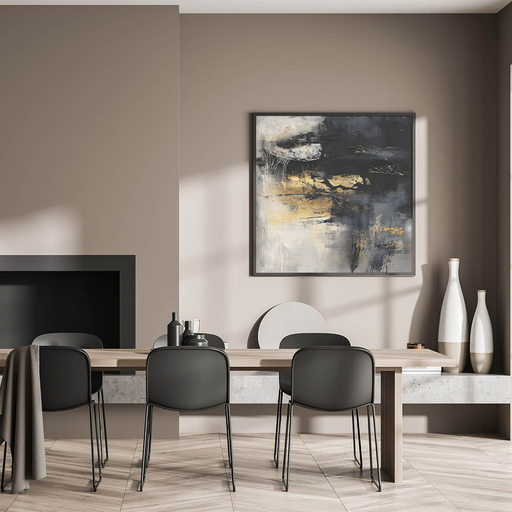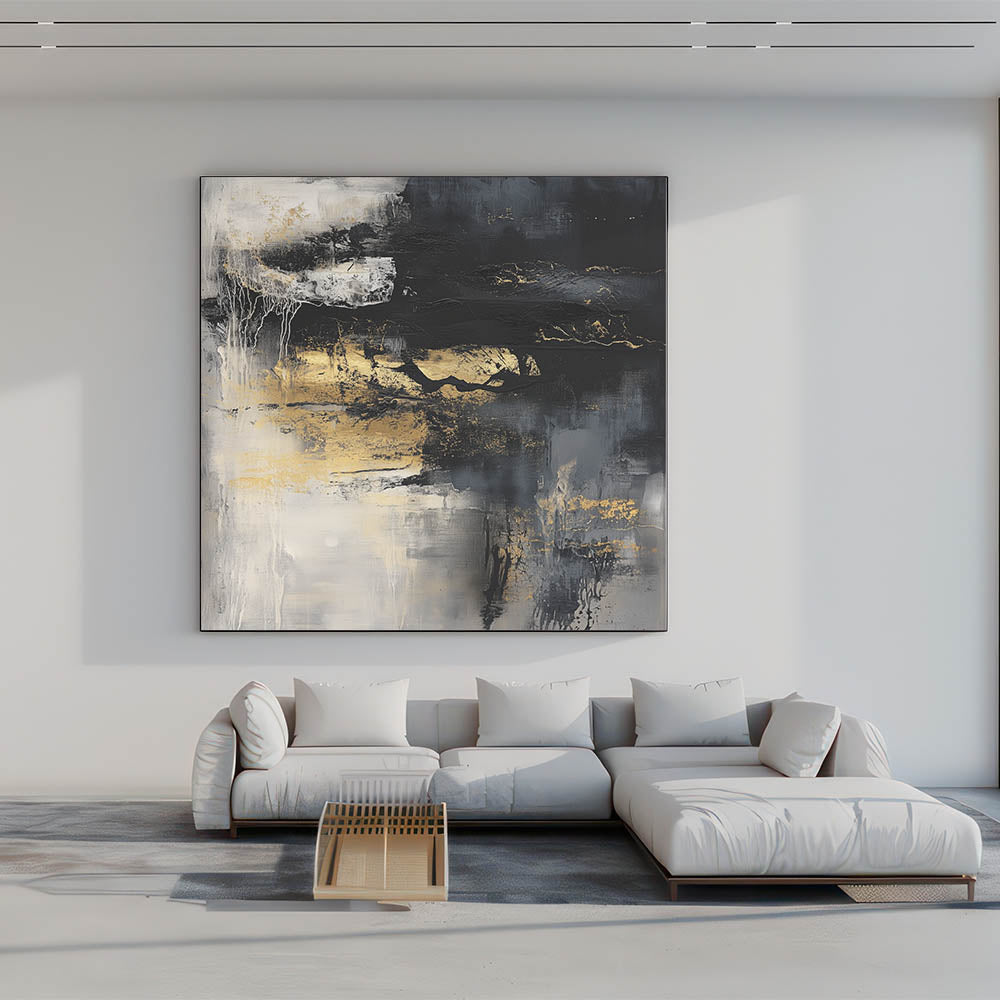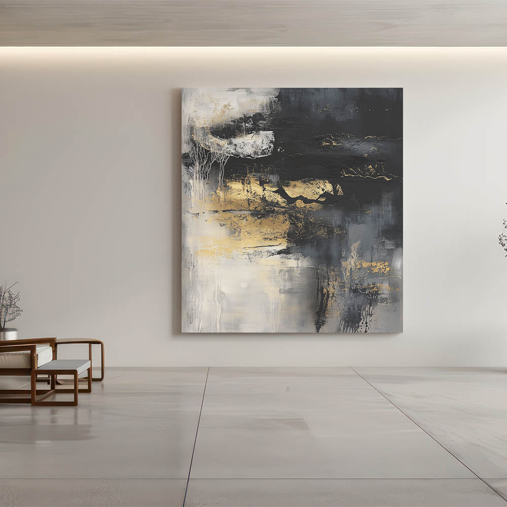 Add energy and sophistication to your walls with this colorful abstract wall art. Part of our Modern Abstract collection, this dramatic piece features a dynamic mix of deep black, rich gold, smoky gray, and soft white tones. Textured layers and raw brushstrokes create bold movement, offering visual intrigue and depth to any space.