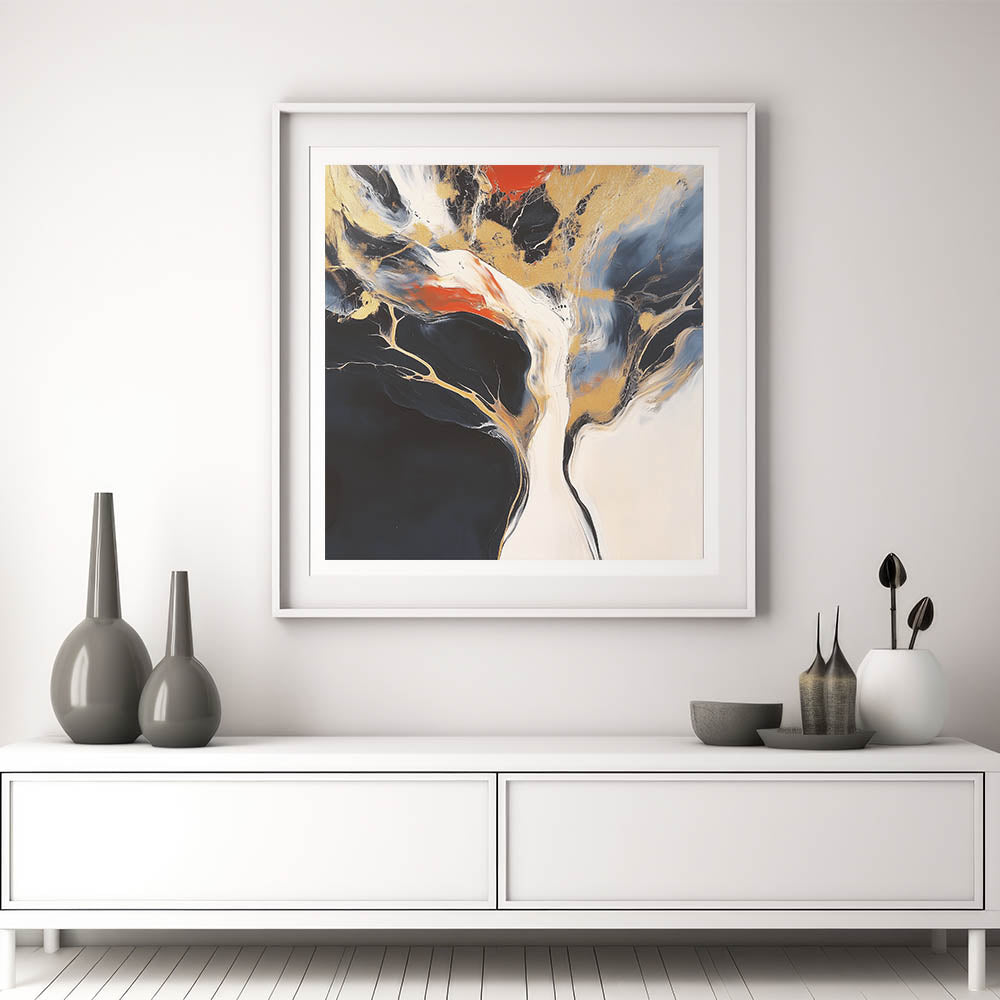 Enhance your space with this contemporary abstract canvas, where form and motion come together. The flowing lines and layered textures create artistic depth. Rich gold, soft white, and intense black contrast with fiery red and blue. A perfect addition to any modern or minimalist interior.