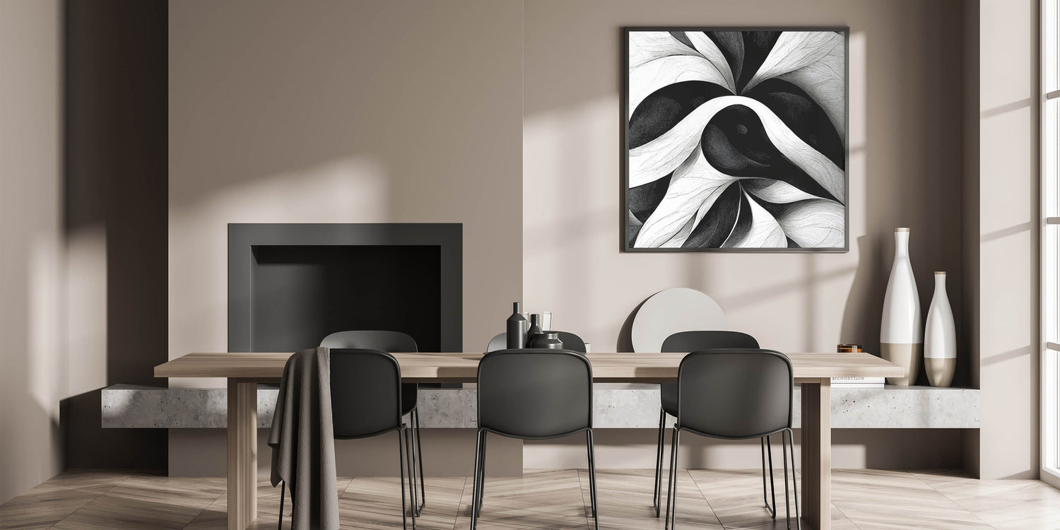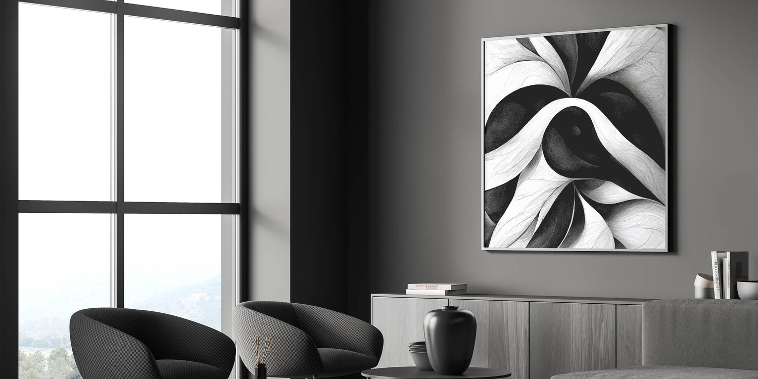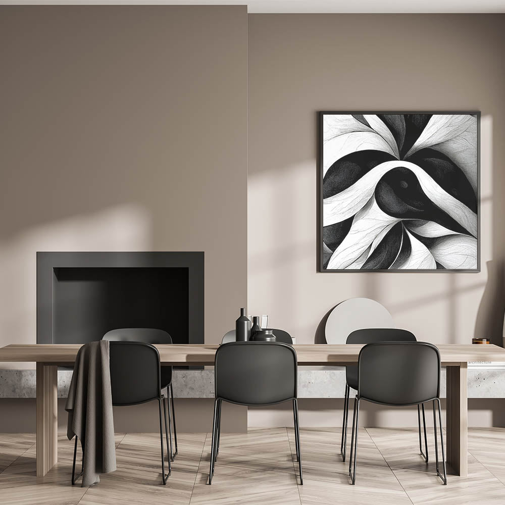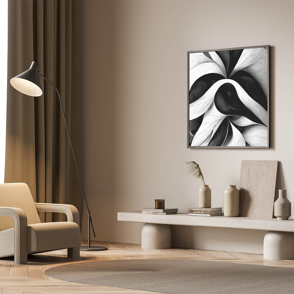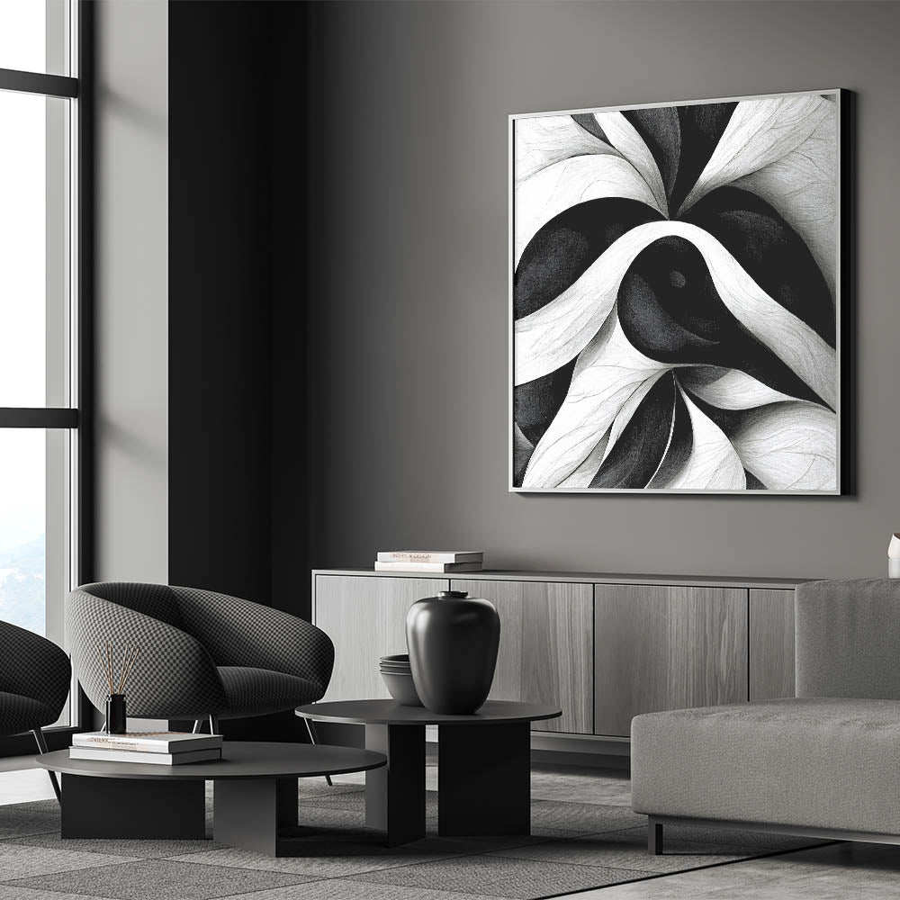 Enhance your interior decor with this contemporary black and white abstract canvas. This elegant monochrome art piece features a mesmerizing pattern of swirling lines and shapes in shades of black and white, creating a dynamic and sophisticated visual impact that will transform any space.