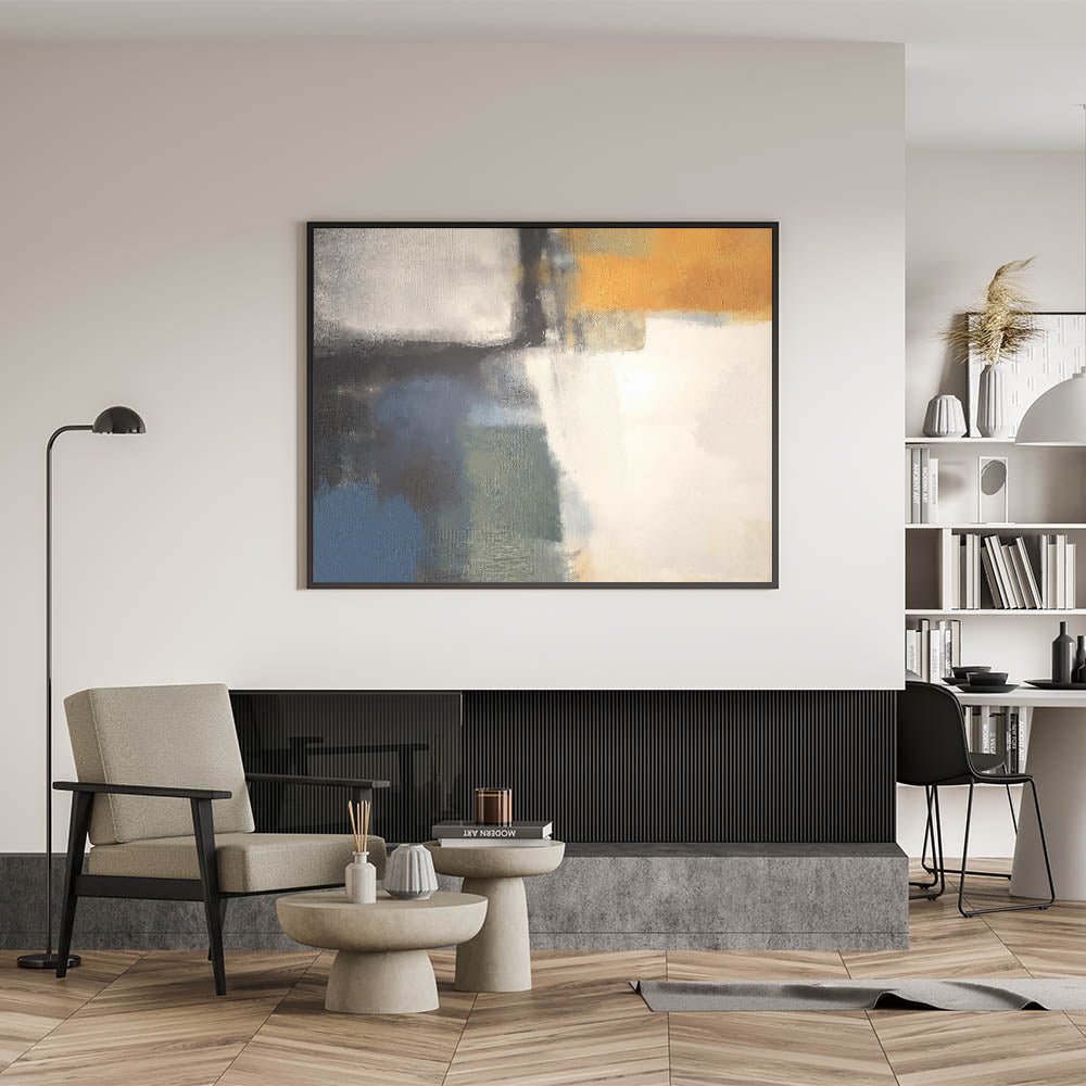 Add expressive depth to your space with this Contemporary Framed Abstract Art from our Timeless Textures collection. This bold design features structured, textured color blocks in mustard yellow, deep blue, forest green, and layered shades of gray and off-white. Perfect for modern, industrial, or creative spaces that embrace strong yet refined visuals.