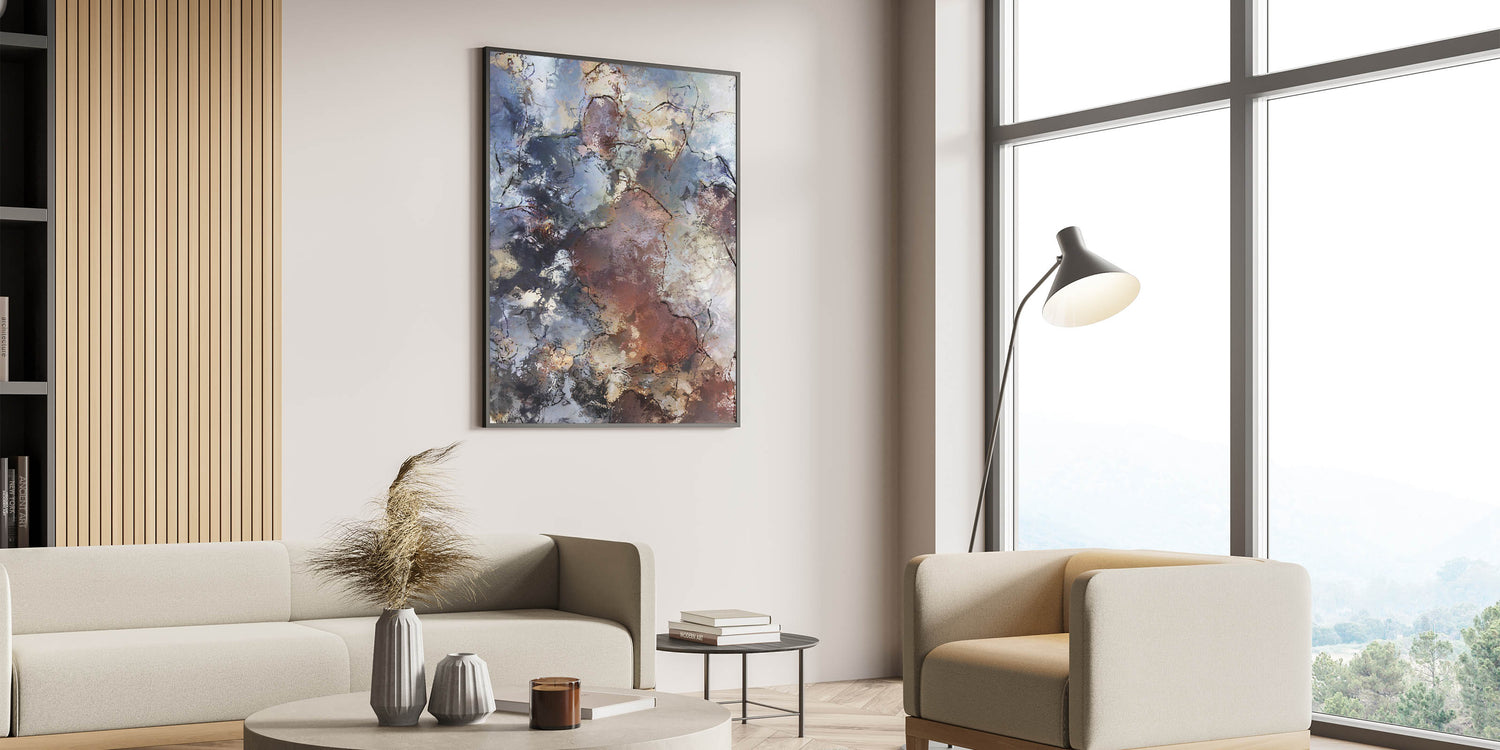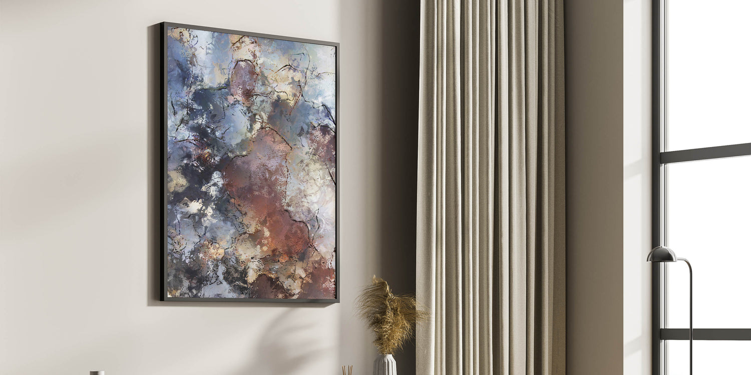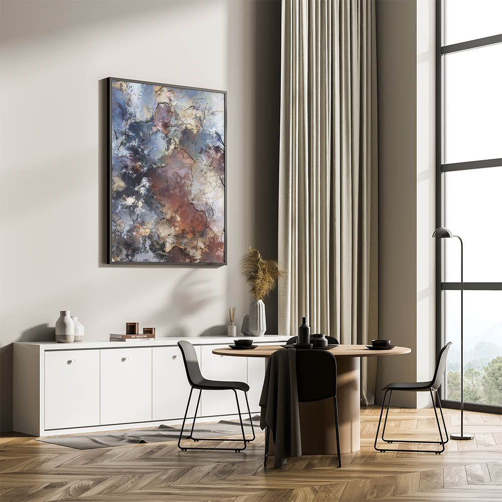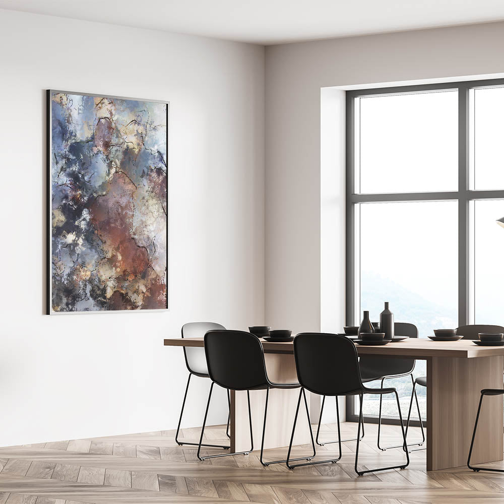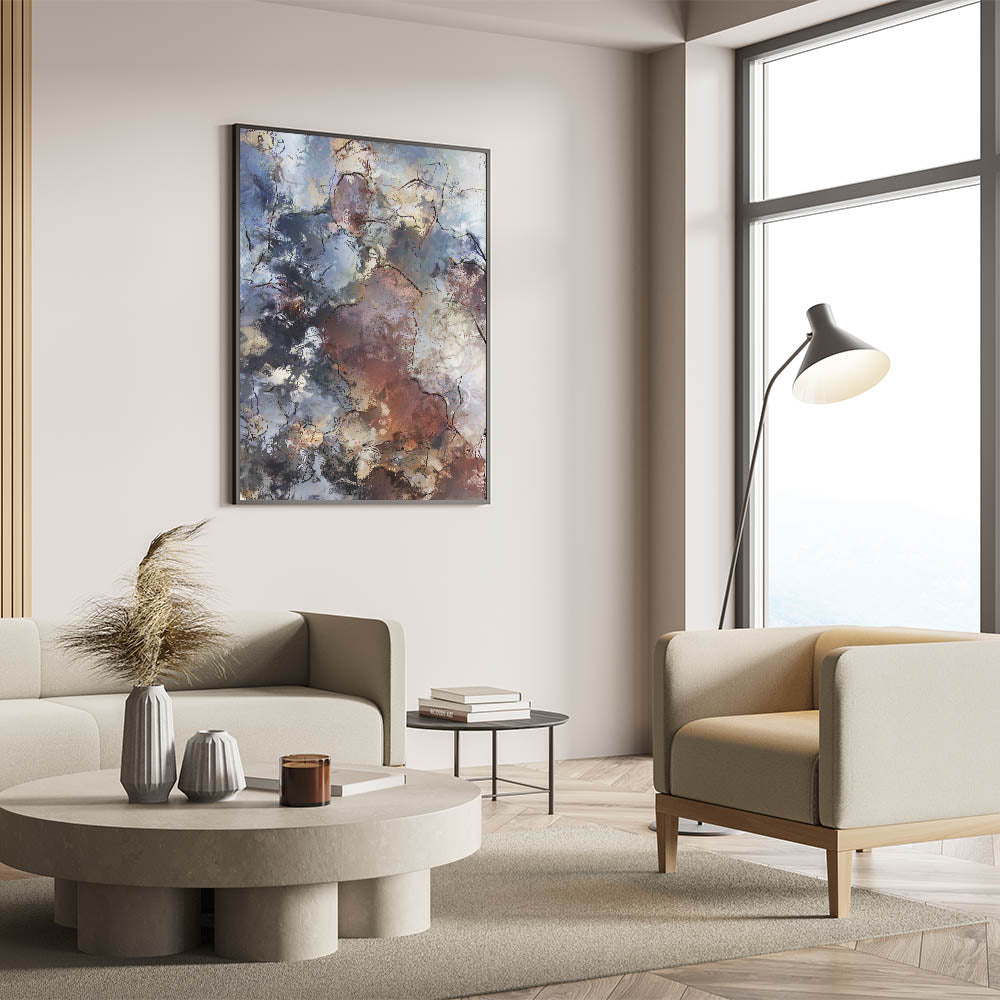From the Earthen Harmony Abstracts collection, this design captures raw energy and natural movement through layered texture and earthy contrast. Rich brown tones flow into deep grays and soft blues, creating an atmospheric depth that draws the eye. The piece evokes a weathered, marbled look that blends effortlessly into modern interiors. Ideal for minimalist wall decor with a bold, moody edge.