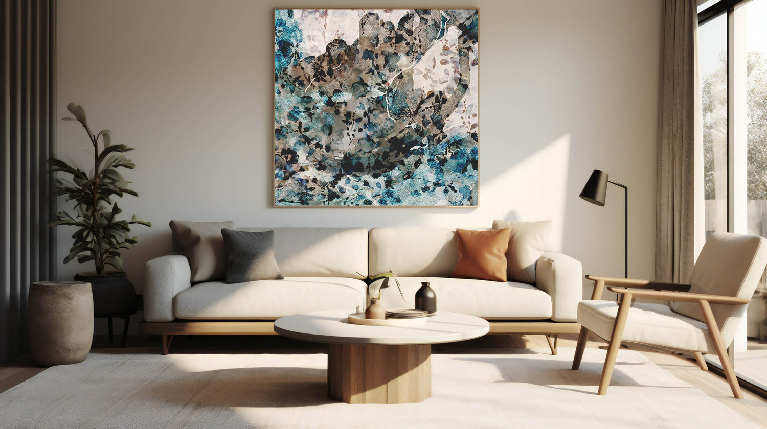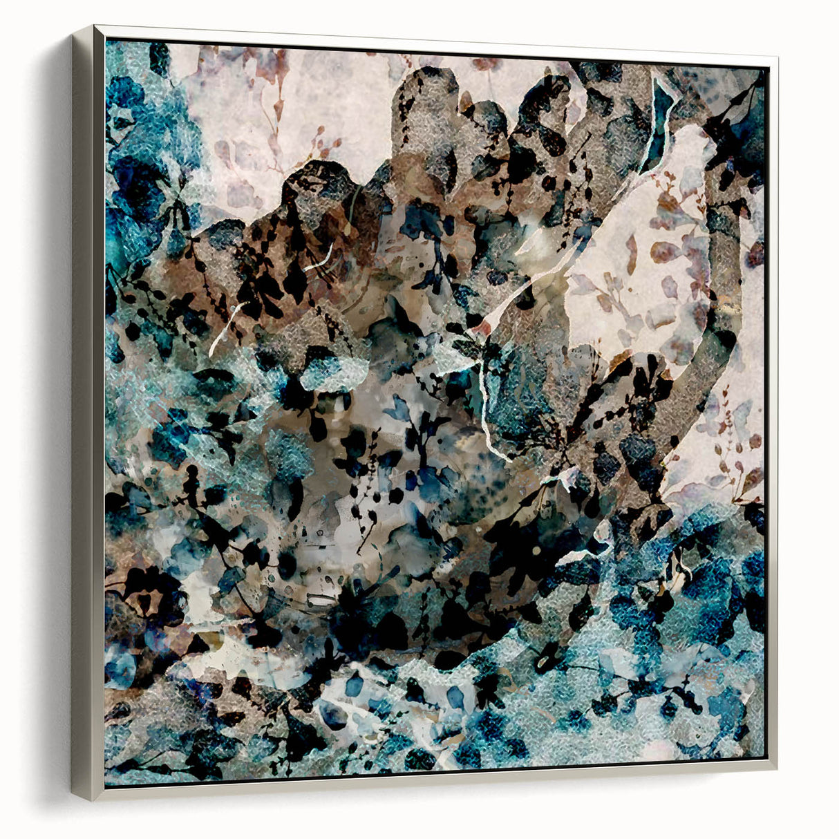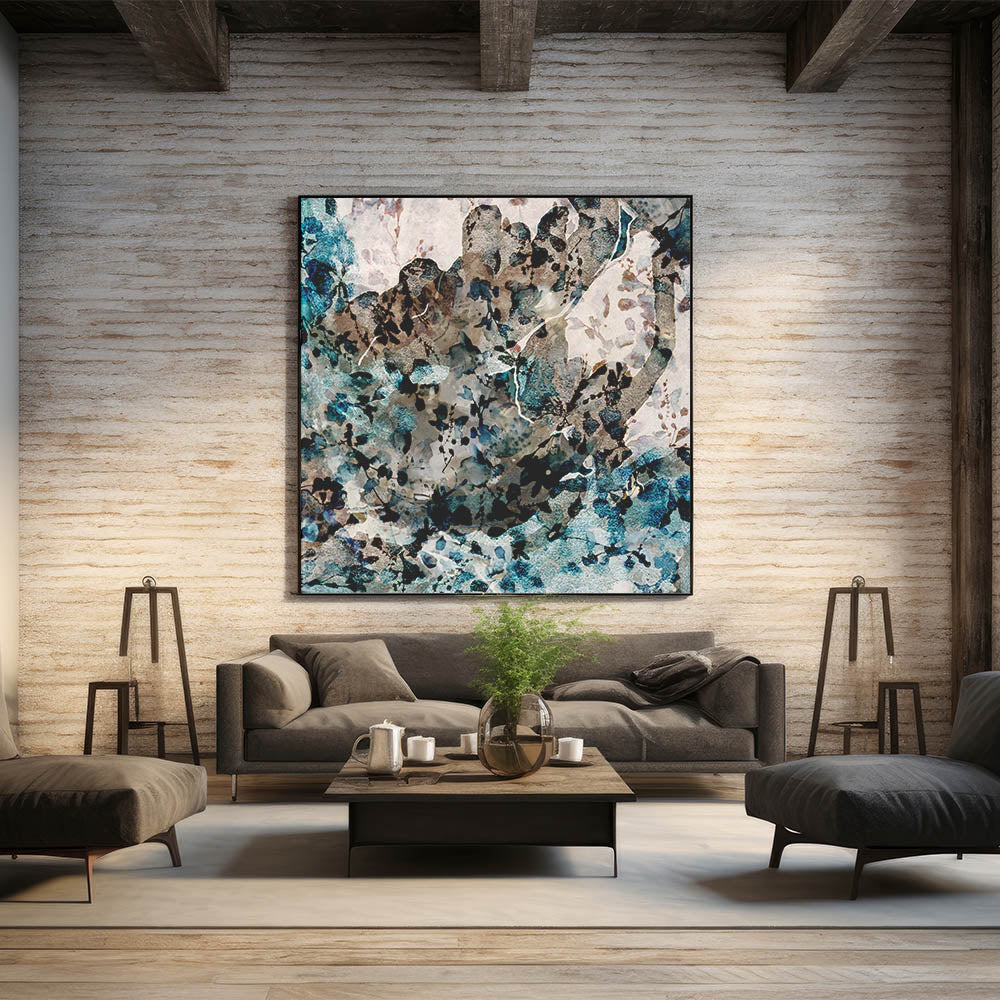 This piece from the Earthen Harmony Abstracts collection is an intricate blend of movement, color, and organic texture. Soft teal, layered beige, and charcoal tones form an abstract floral-inspired pattern with depth and emotion. Its neutral abstract design adds sophistication without overpowering your space. Perfect for those seeking minimalist wall decor with expressive modern detail.