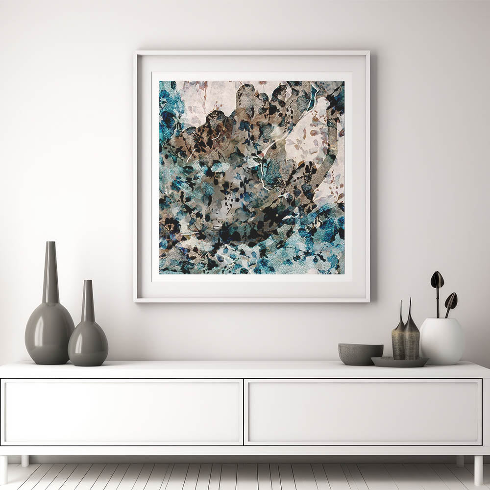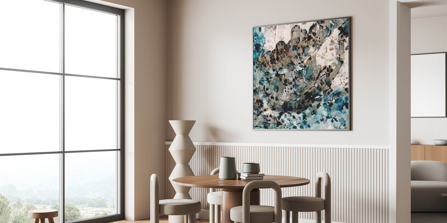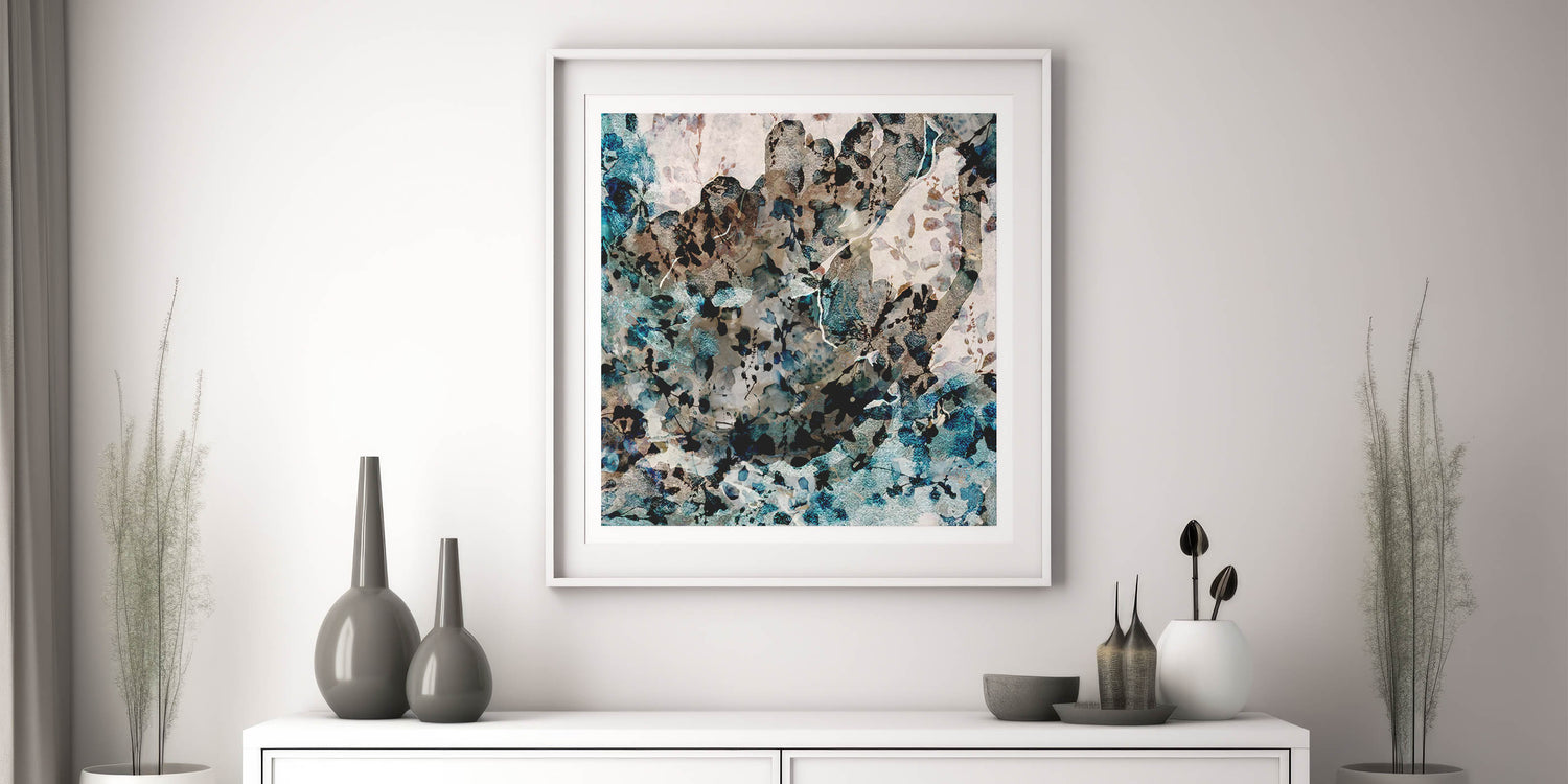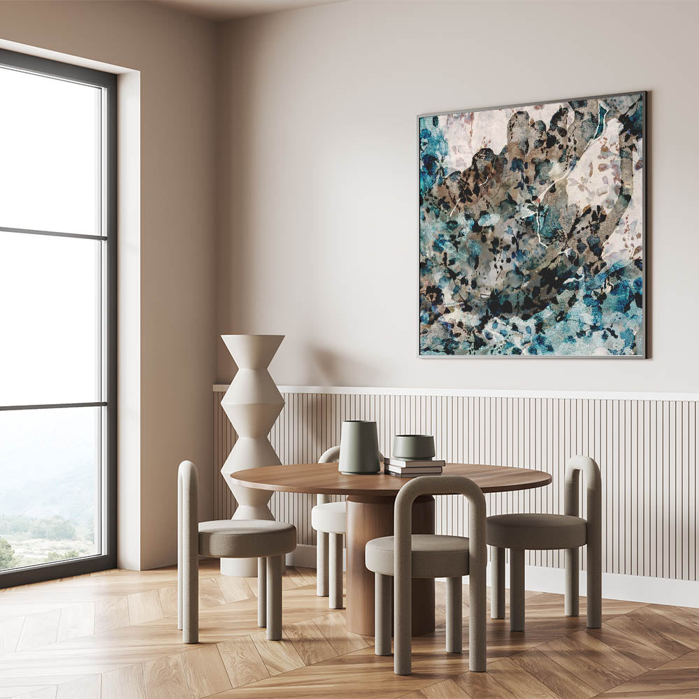 This piece from the Earthen Harmony Abstracts collection is an intricate blend of movement, color, and organic texture. Soft teal, layered beige, and charcoal tones form an abstract floral-inspired pattern with depth and emotion. Its neutral abstract design adds sophistication without overpowering your space. Perfect for those seeking minimalist wall decor with expressive modern detail.