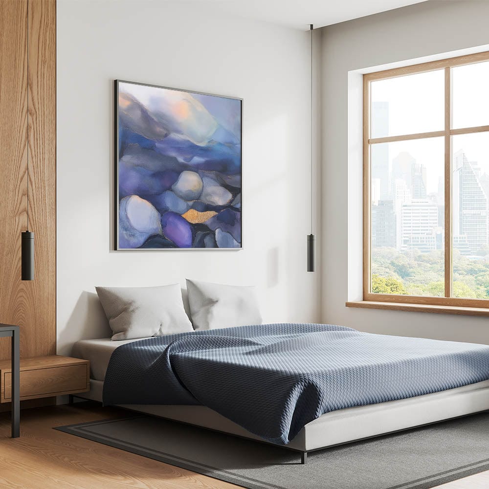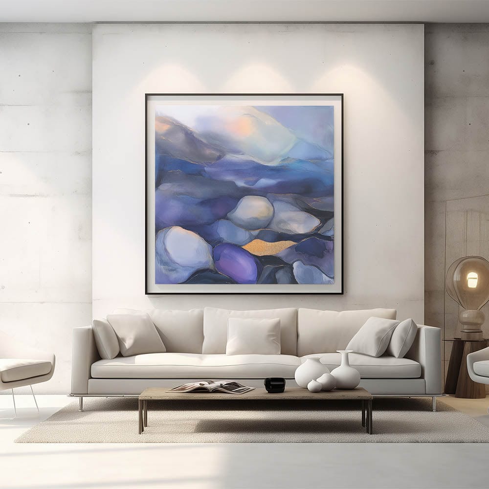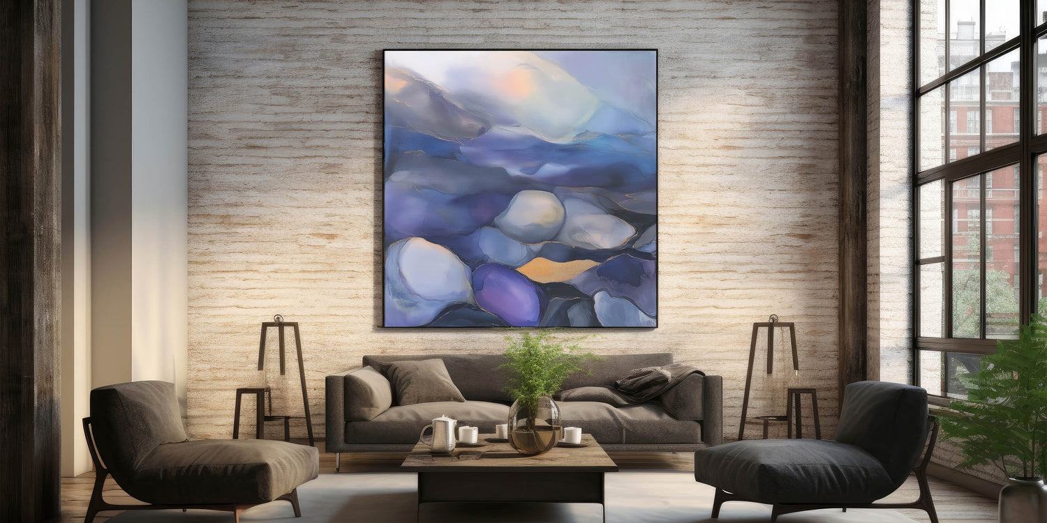 Immerse your space in calm sophistication with this fluid abstract wall art, featuring layered hues of violet, navy blue, and soft gray with warm golden accents. Inspired by stone textures and dreamlike landscapes, this artwork evokes depth, serenity, and movement, making it perfect for tranquil modern interiors.