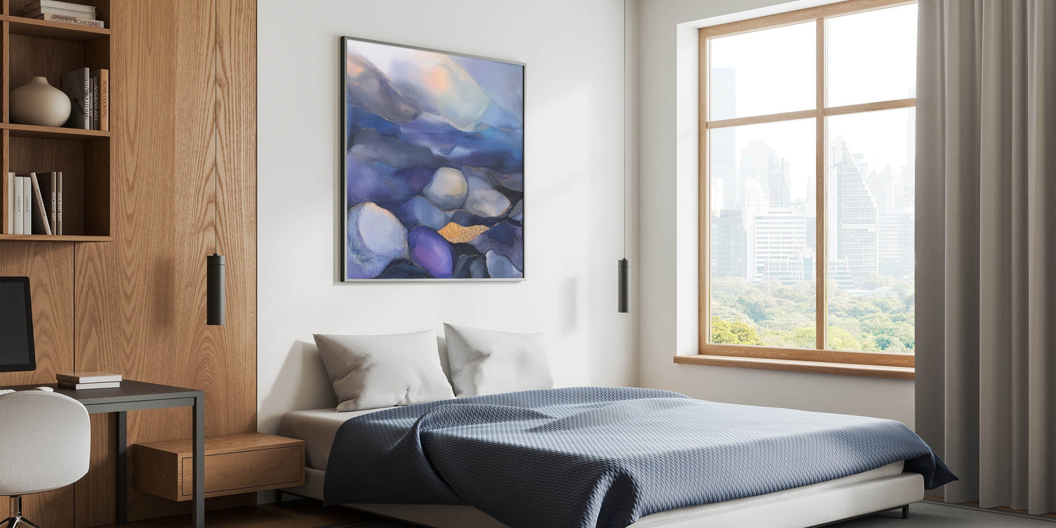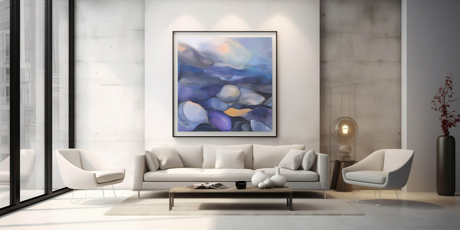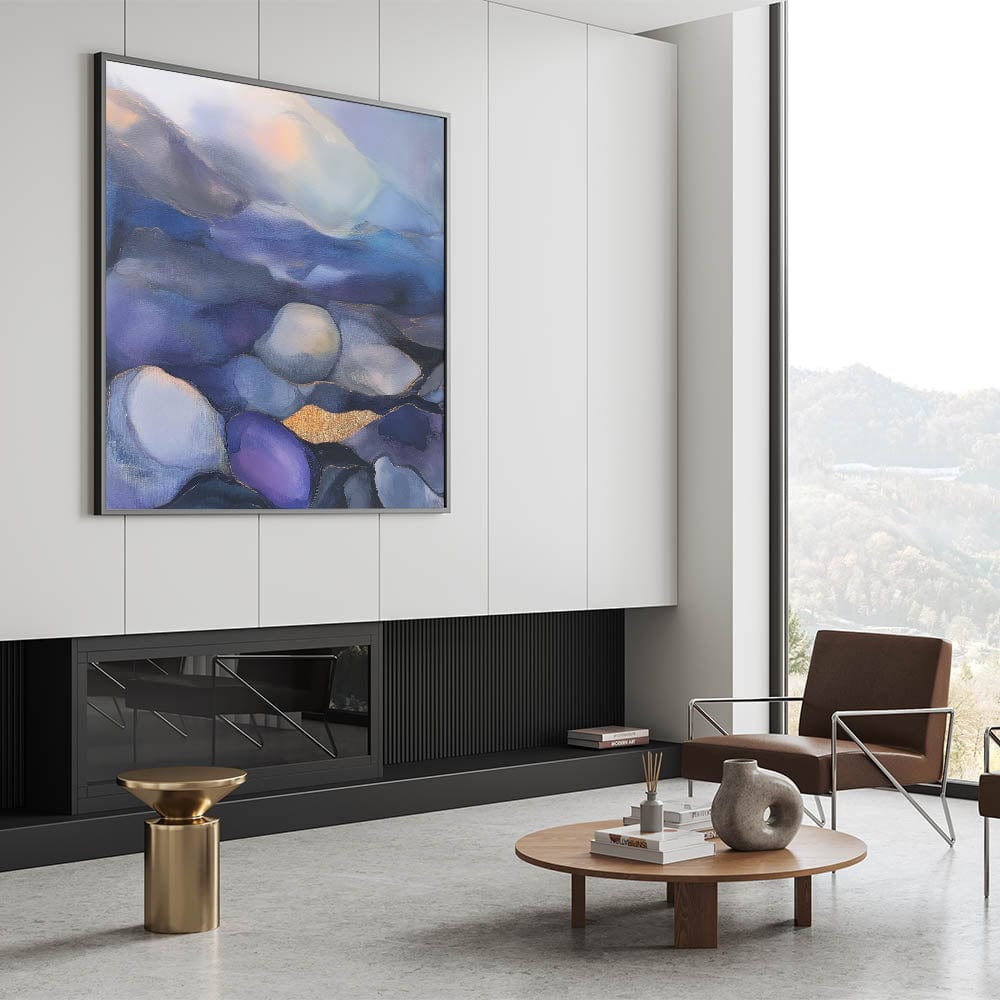 Immerse your space in calm sophistication with this fluid abstract wall art, featuring layered hues of violet, navy blue, and soft gray with warm golden accents. Inspired by stone textures and dreamlike landscapes, this artwork evokes depth, serenity, and movement, making it perfect for tranquil modern interiors.