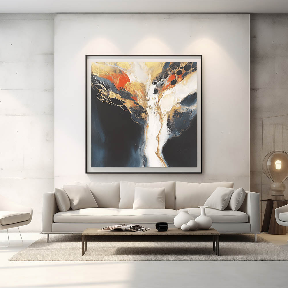 This geometric abstract wall decor brings a bold and refined energy to your interior. Vivid strokes of gold, red, and black blend with creamy whites and soft blues. The composition feels fluid yet structured—ideal for modern, minimalist, or artistic spaces. A visual statement of contemporary elegance.