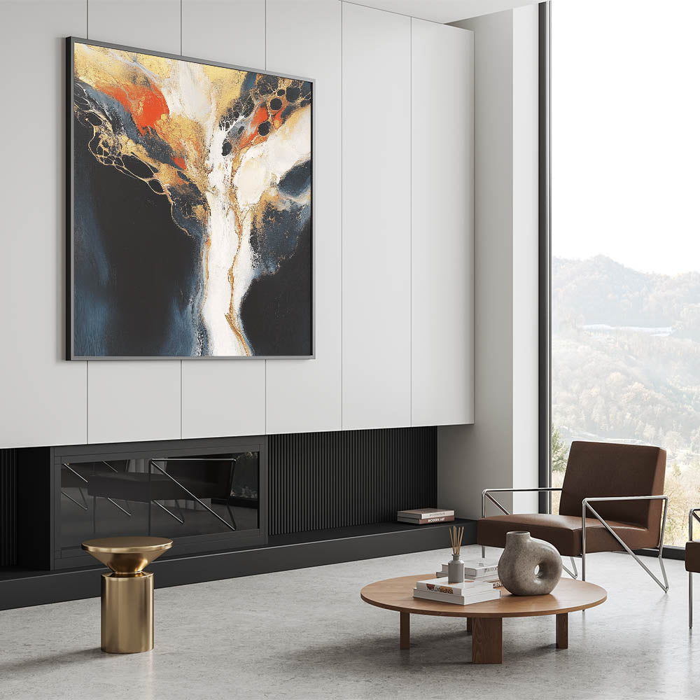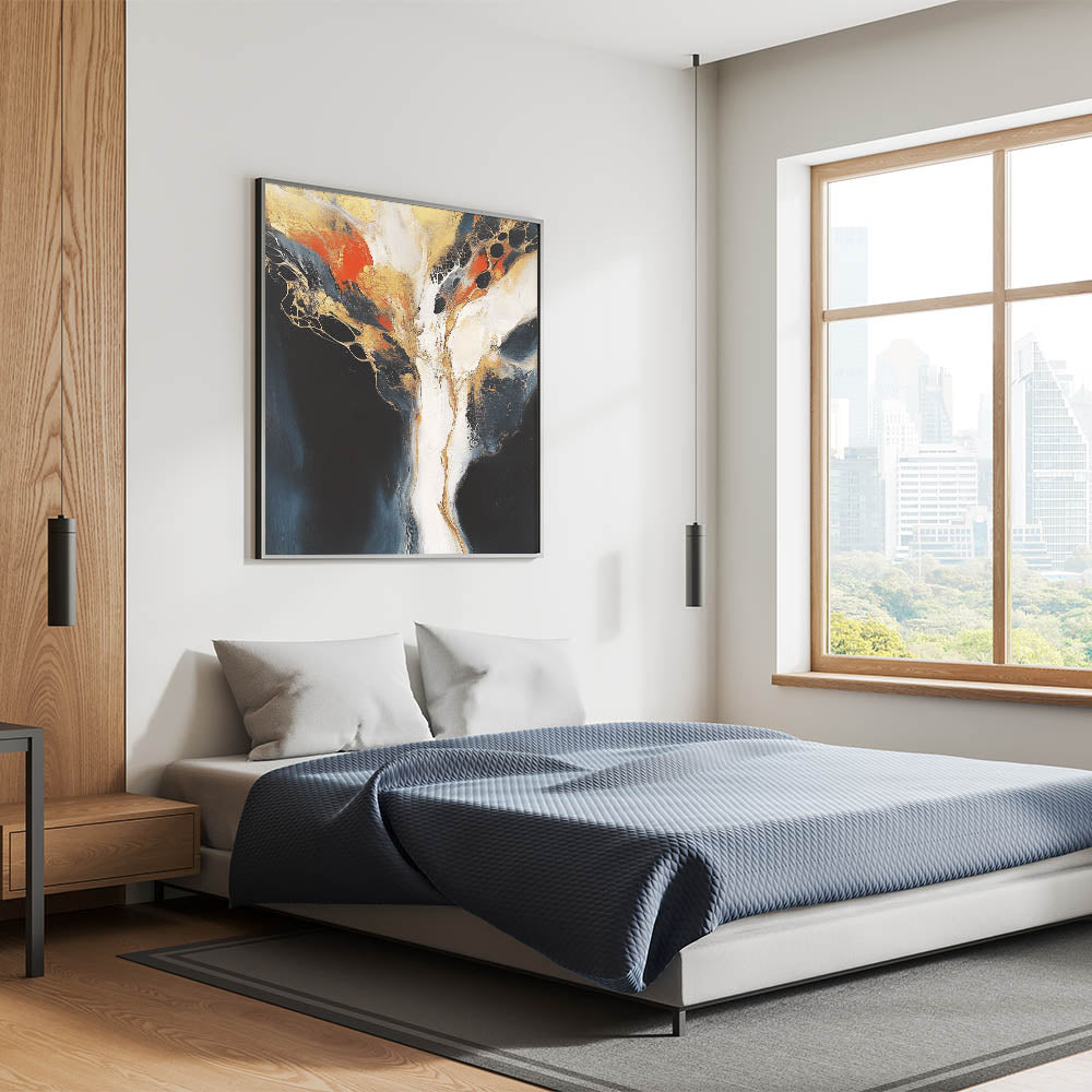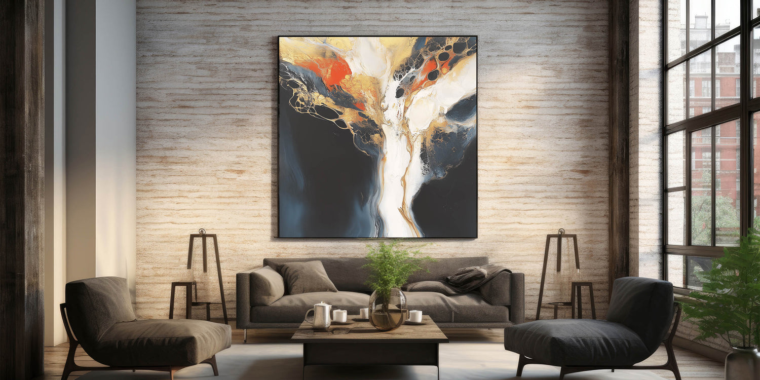 Add movement and modern flair to your space with this stunning abstract canvas. Its rich contrast and layered depth offer sophistication and energy. This contemporary abstract canvas turns any wall into a refined design feature. A perfect match for bold and modern aesthetics.
