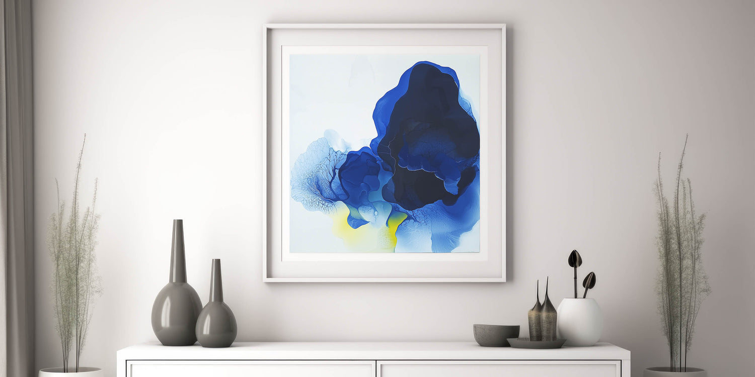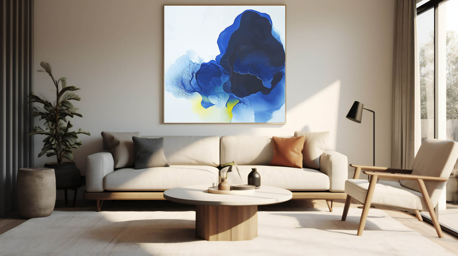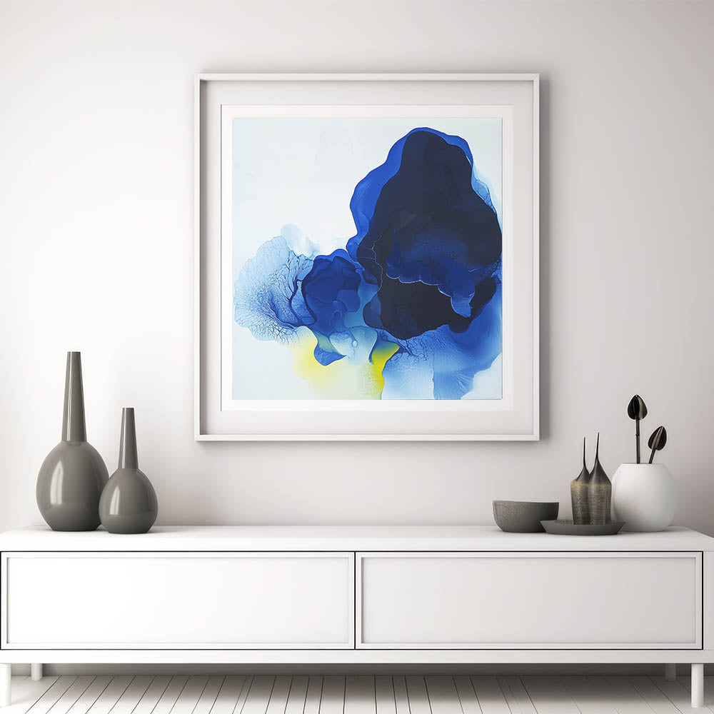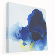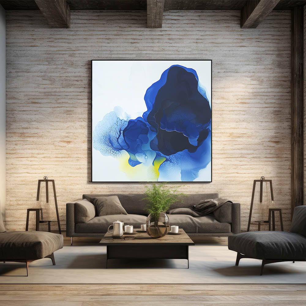Make a dramatic and elegant statement with this flowing piece of large abstract wall art. Deep navy and royal blue blooms spread across the canvas with organic fluidity, highlighted by translucent layers of pale blue and a subtle touch of yellow. The movement and contrast create an artwork that feels both airy and bold—perfect for modern interiors that embrace color and depth.