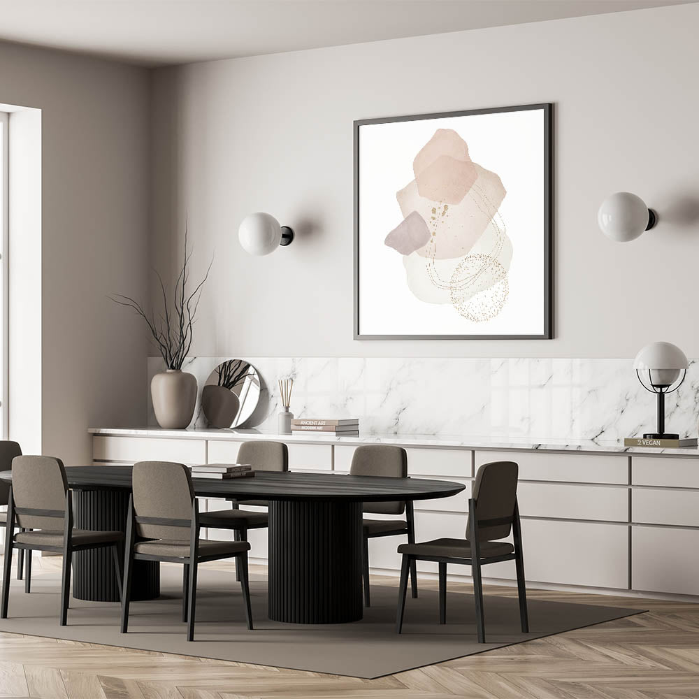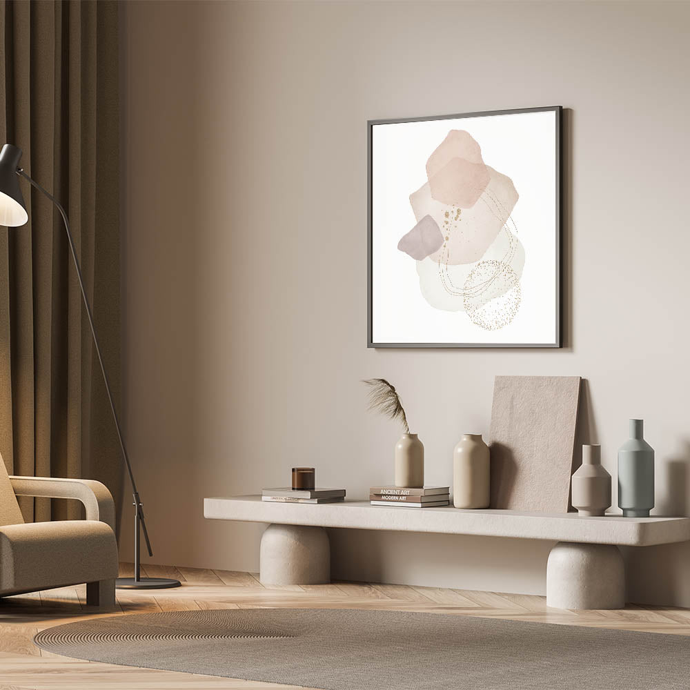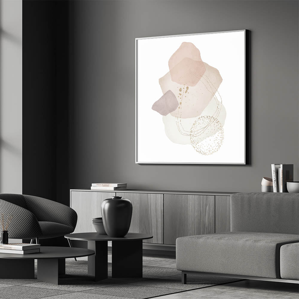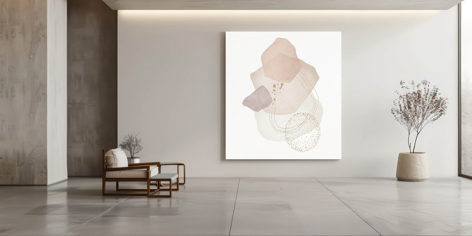 Add a soft, serene touch to your home with this elegant geometric minimalist abstract wall art. Featuring gentle layers of blush pink, beige, and cream tones with delicate golden detailing, this artwork embodies calm, balance, and sophistication. The flowing lines and dotted textures create visual interest while maintaining a minimalist, airy aesthetic.