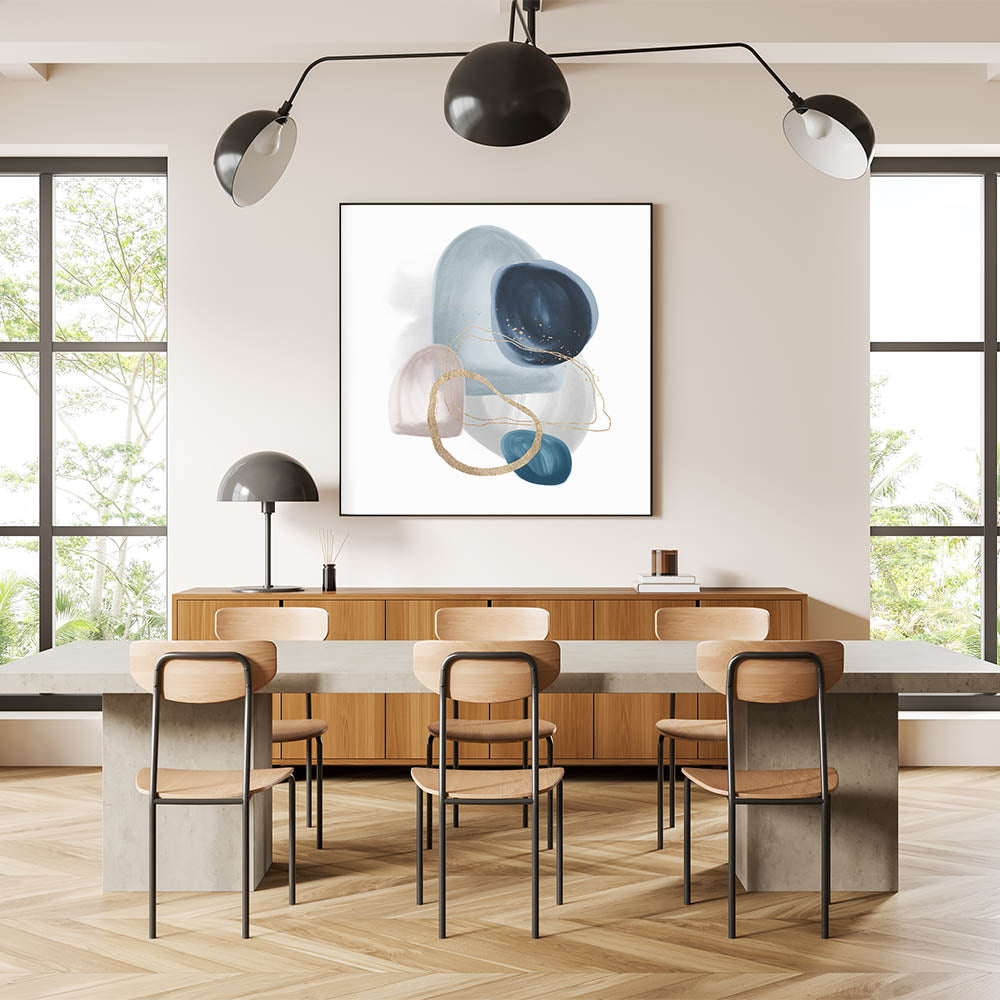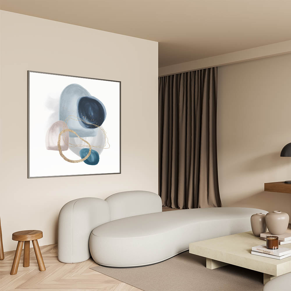 Add serenity and sophistication to your space with this geometric minimalist abstract wall art. This design blends soft navy, teal, gray-blue, and beige tones, complemented by graceful gold accents. Its layered organic shapes and fluid composition make it an elegant addition to modern interiors, bringing a sense of calm and effortless style.
