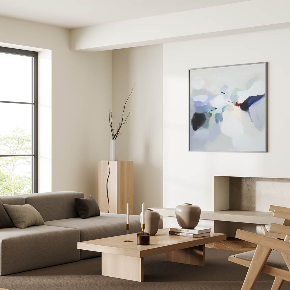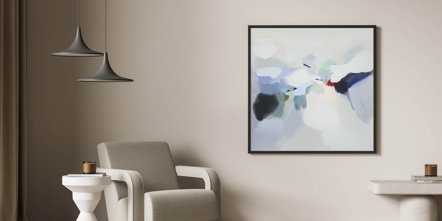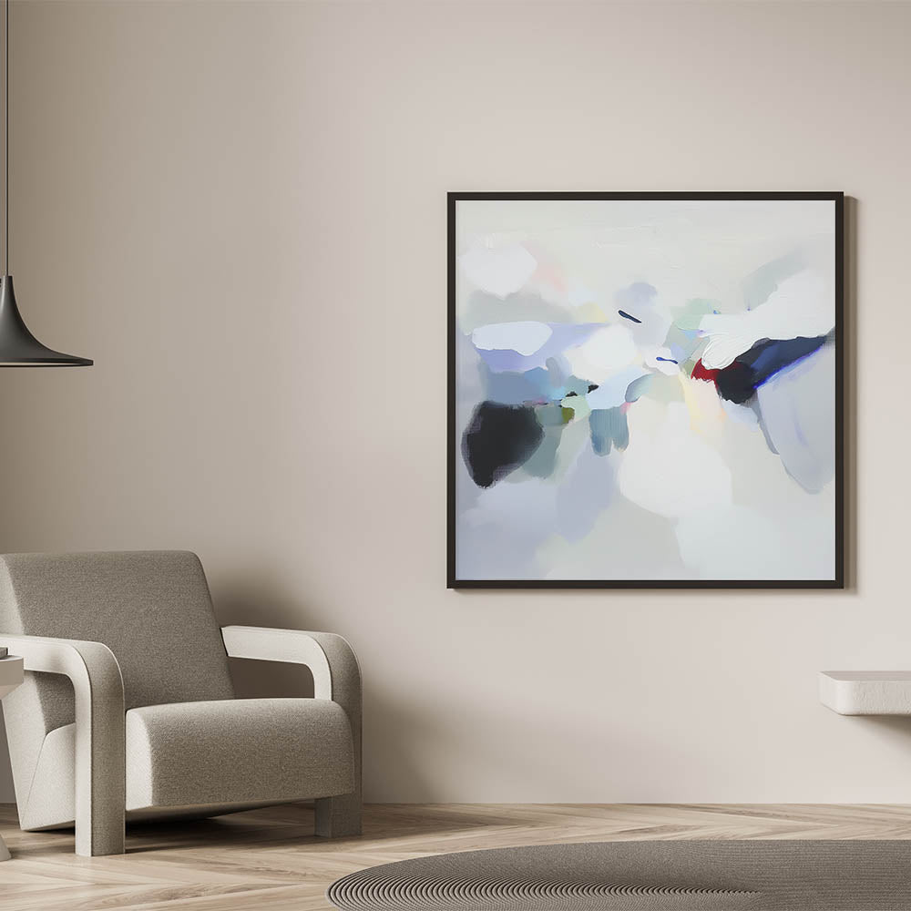 Bring balance and stillness to your space with this serene piece of minimalist abstract wall art. Light gray and off-white shapes drift through the canvas, accented by subtle tones of soft blue, navy, and an unexpected pop of red and black. The delicate transitions create a floating, dreamlike feeling perfect for contemporary or Scandinavian-inspired interiors.