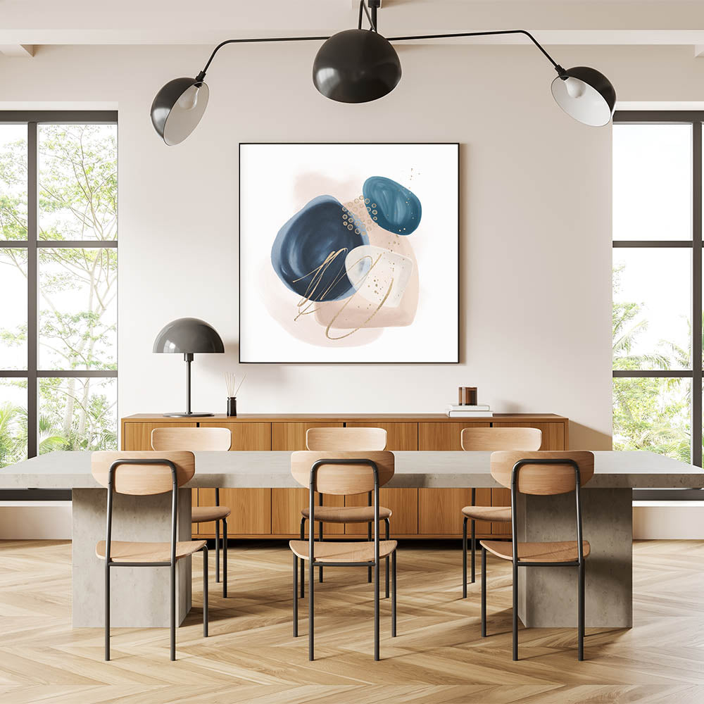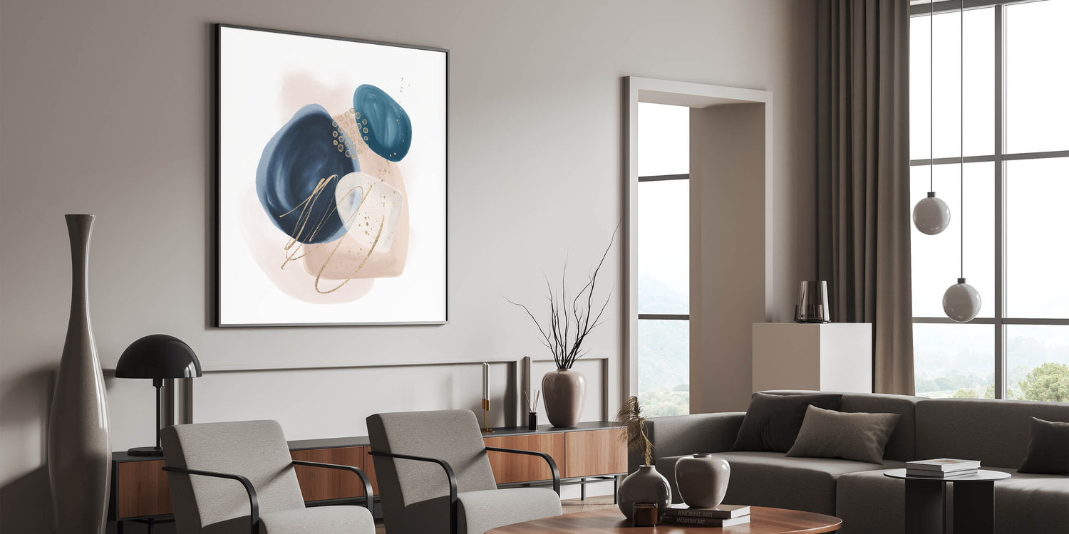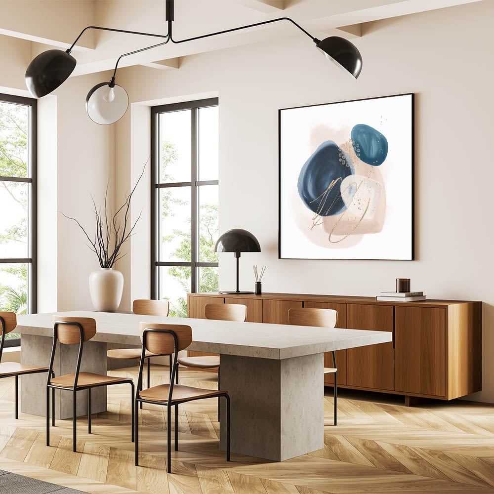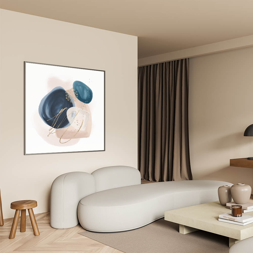Add sophistication and contrast to your interior with this striking geometric minimalist abstract wall art. Featuring rich navy blue, vibrant teal, and soft blush beige shapes with delicate gold detailing, this composition blends modern artistry with timeless elegance. The organic forms and clean layout make it a stunning focal point for both minimalist and contemporary spaces.