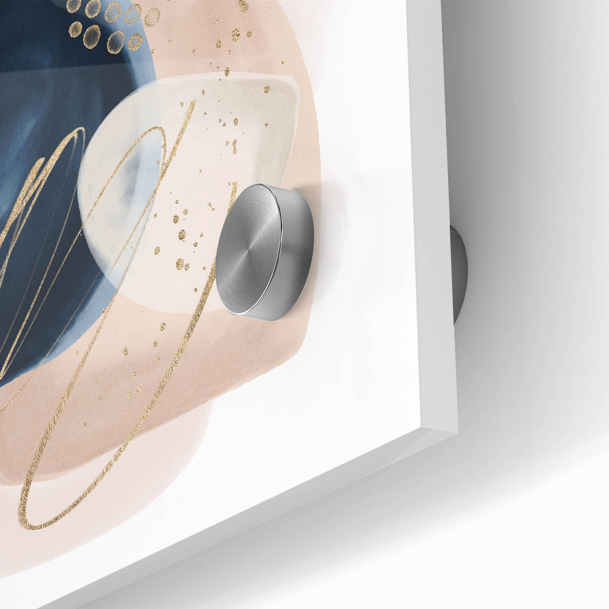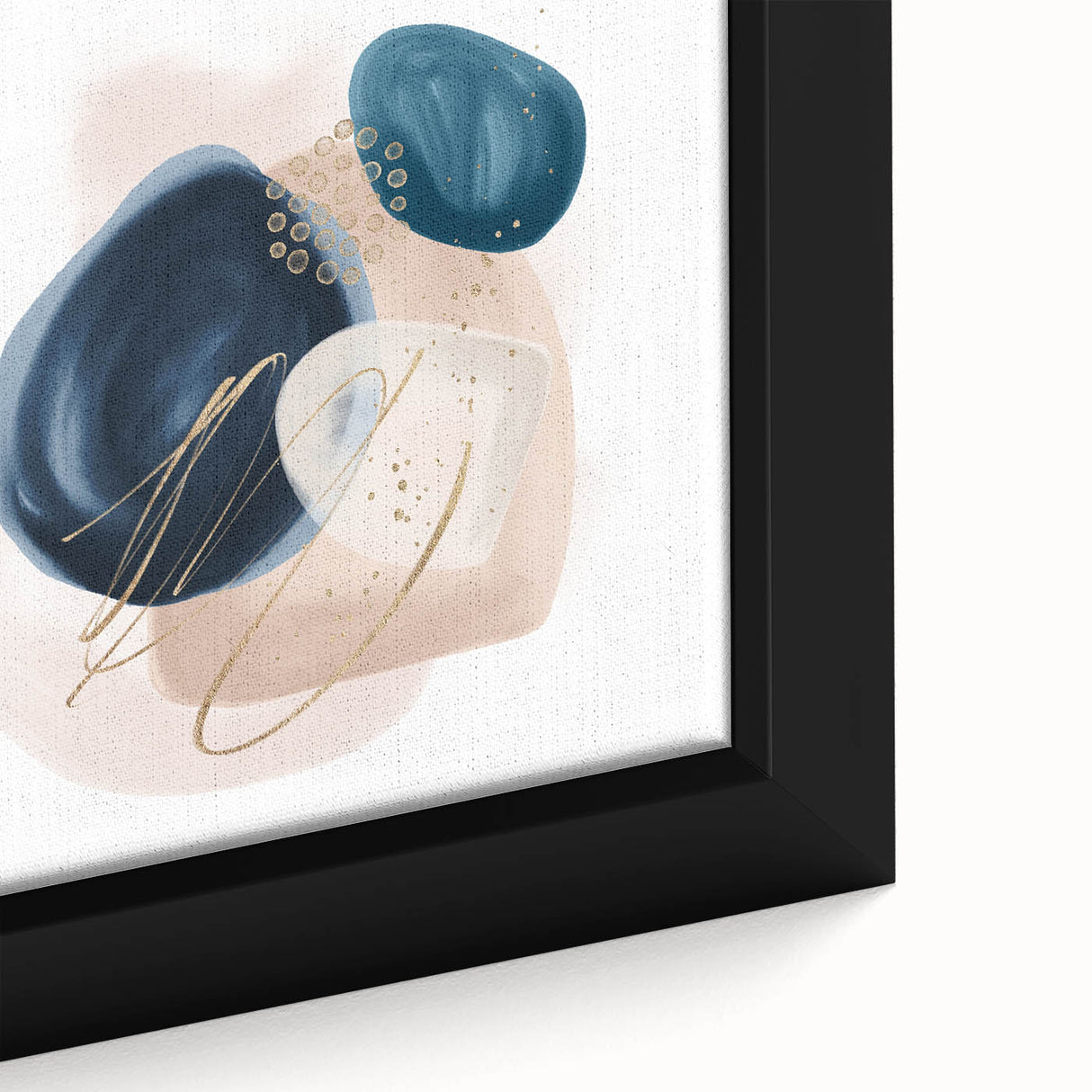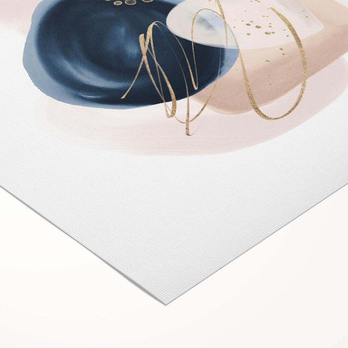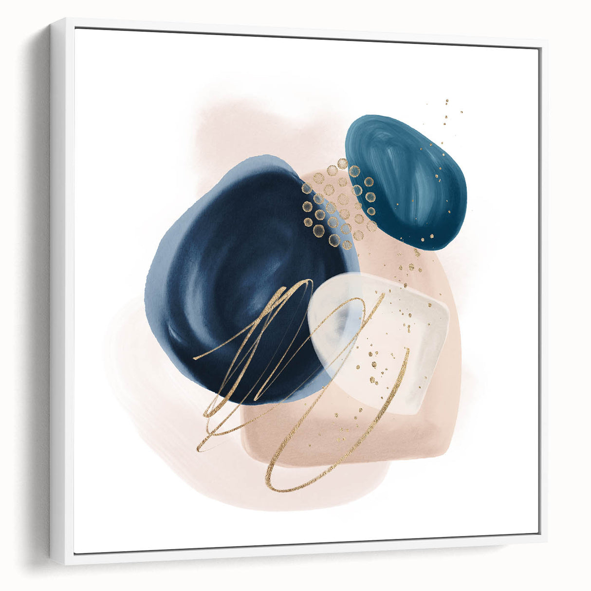 Add sophistication and contrast to your interior with this striking geometric minimalist abstract wall art. Featuring rich navy blue, vibrant teal, and soft blush beige shapes with delicate gold detailing, this composition blends modern artistry with timeless elegance. The organic forms and clean layout make it a stunning focal point for both minimalist and contemporary spaces.