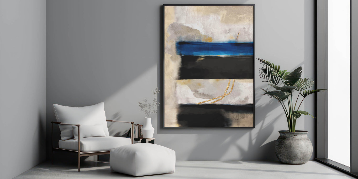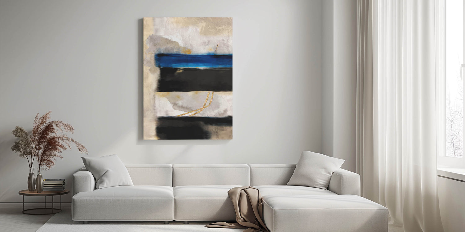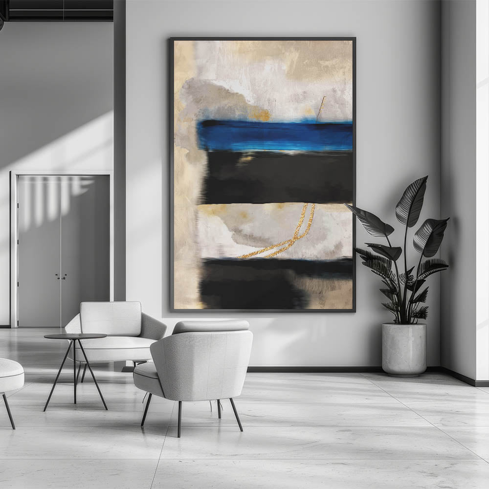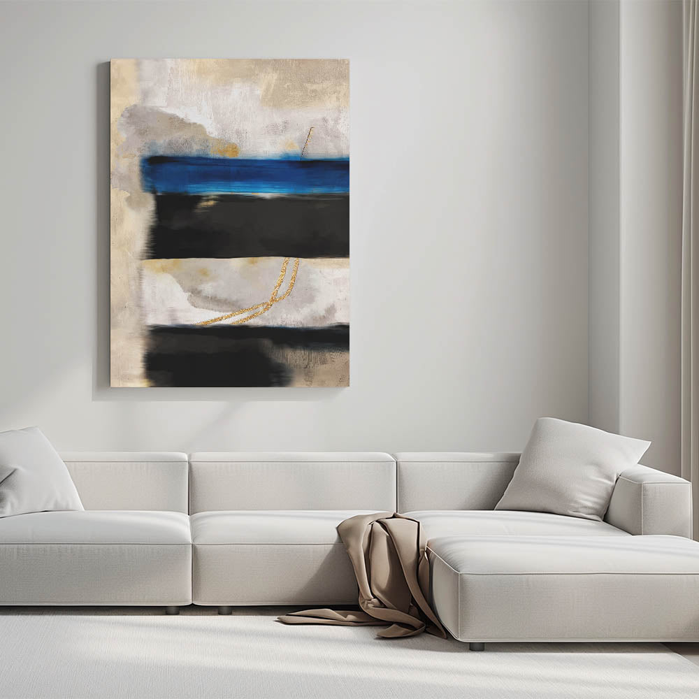 Balance bold contrast and refined simplicity with this Modern Abstract Canvas Print from the Timeless Textures collection. Deep black strokes and a vibrant royal blue layer across a textured beige and cream background, punctuated with delicate golden lines. This piece brings power and elegance to modern interiors.