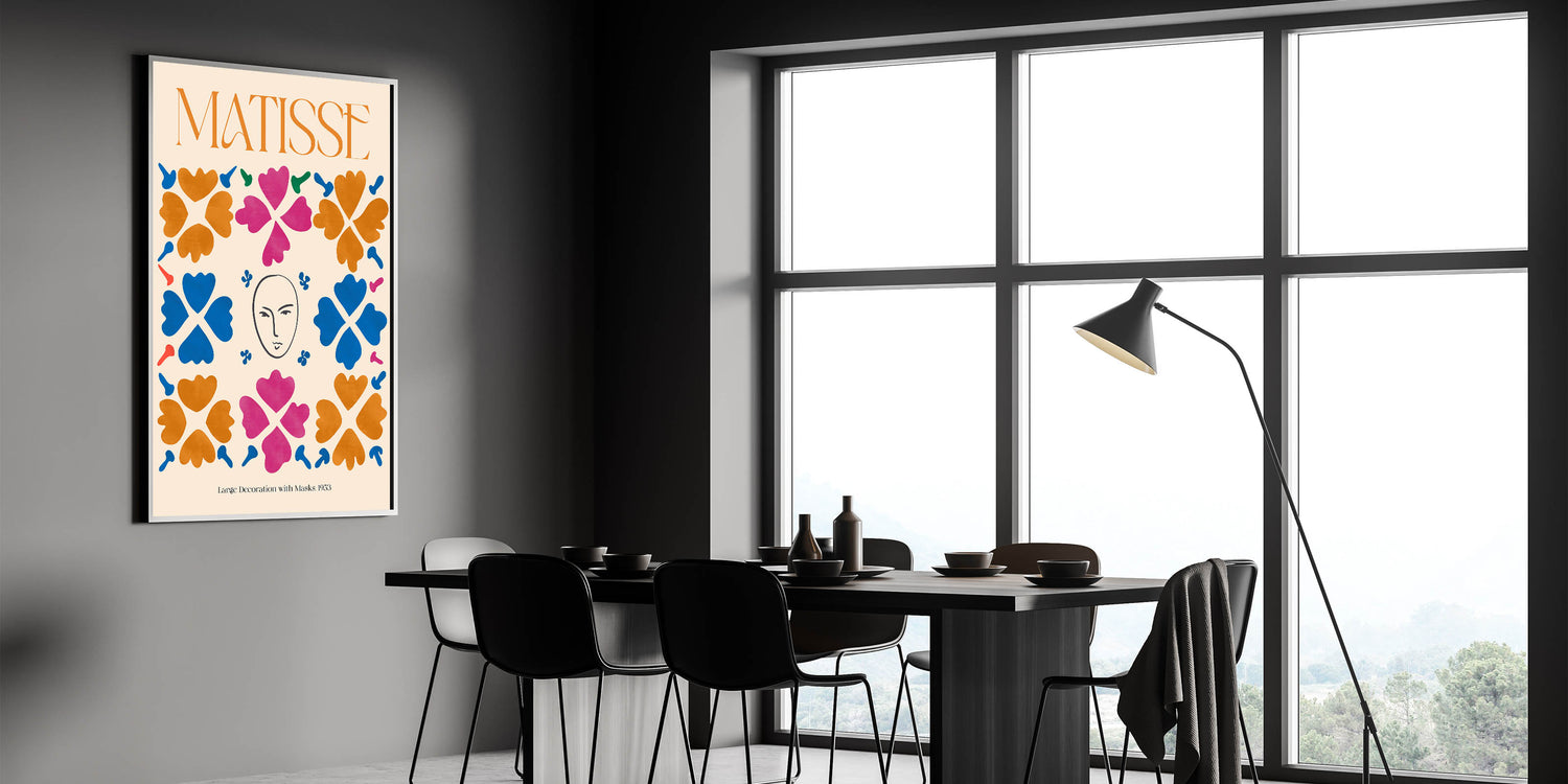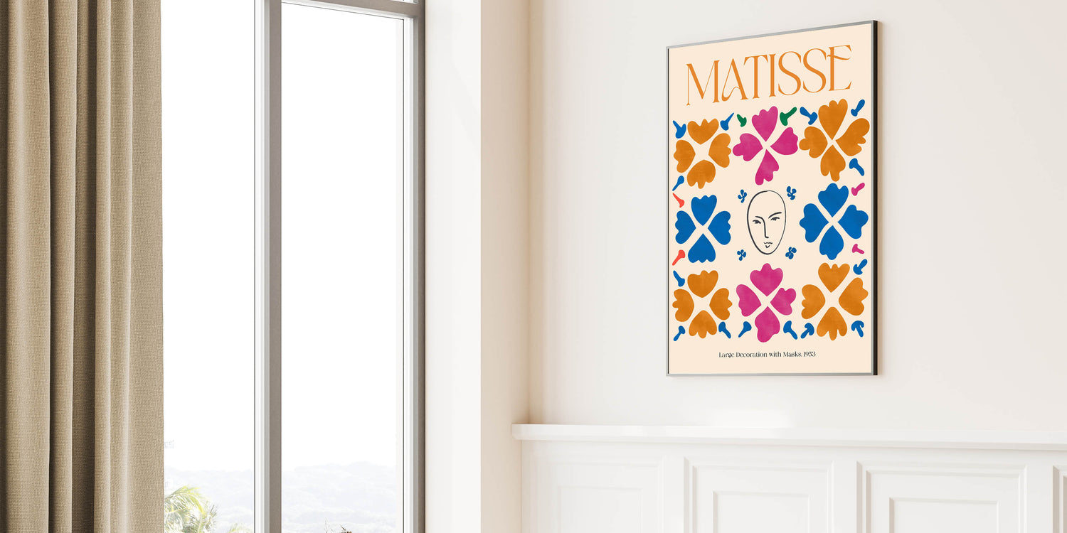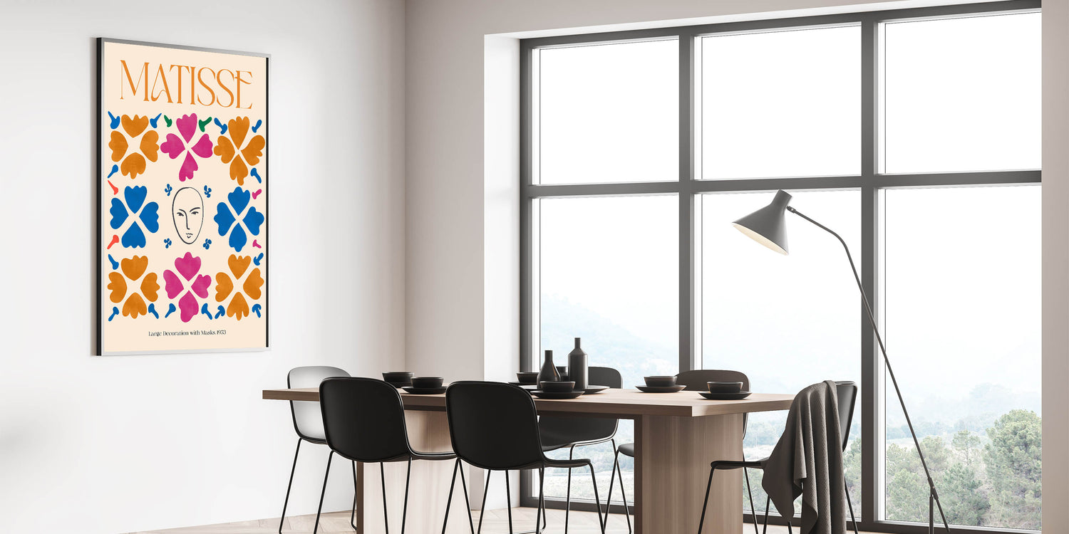 Bring a touch of sophistication to your space with this stunning contemporary art print, "Large Decoration with Masks." Inspired by the works of Henri Matisse, this piece features bold abstract shapes and vivid colors, making it an eye-catching addition to any modern home. The design integrates playful motifs and a minimalist face sketch, creating a balanced composition that complements various interior styles.
