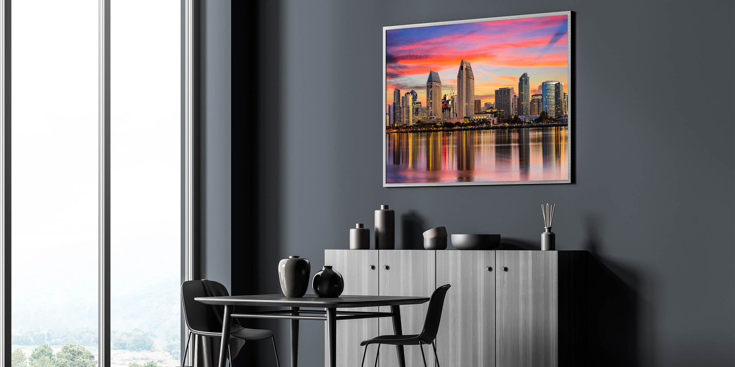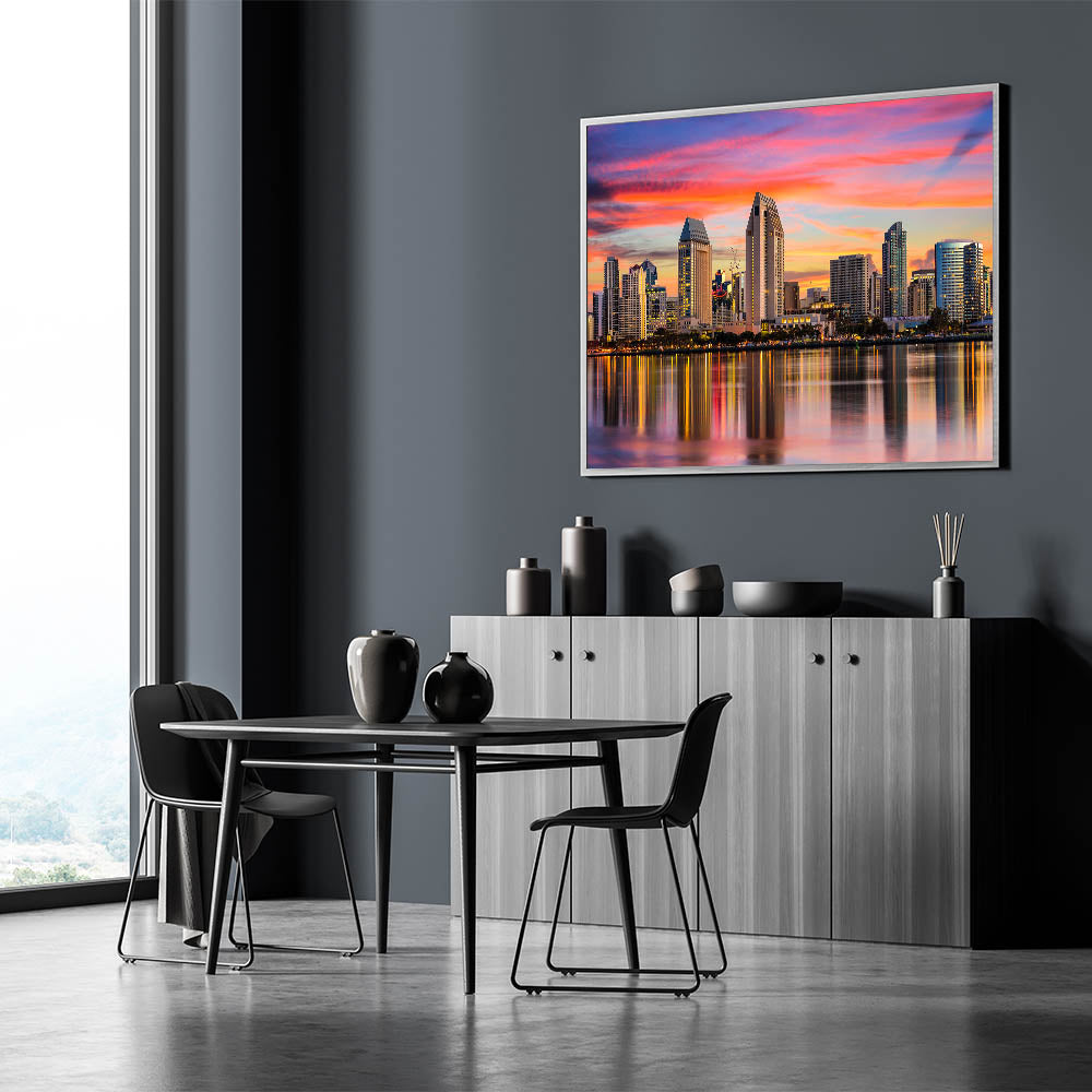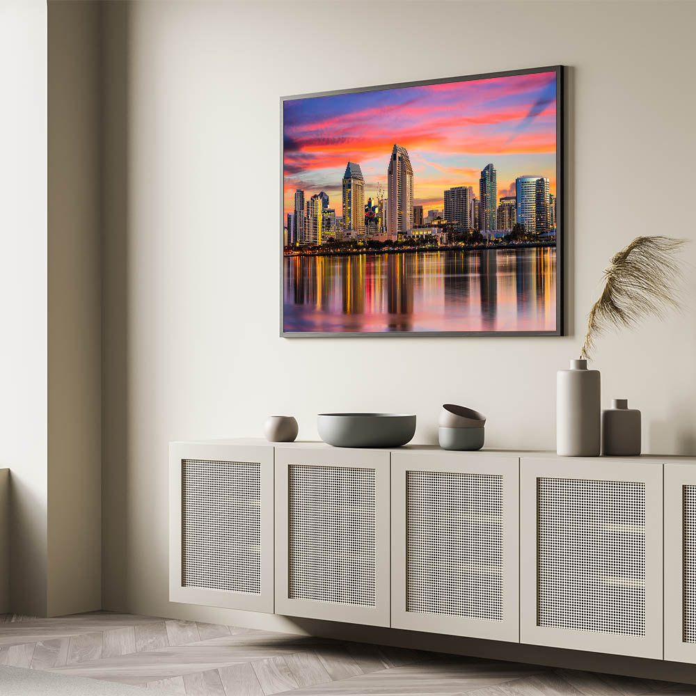 Add a modern touch of California’s beauty to your decor with this vibrant Coronado skyline wall art. Capturing the illuminated cityscape at sunset, this stunning print brings the dynamic energy of Coronado Island to life. The colorful skies blend seamlessly with the mirrored reflections on the water, creating a breathtaking visual experience. Perfect for lovers of urban and coastal scenery, this piece makes a bold statement in any room.