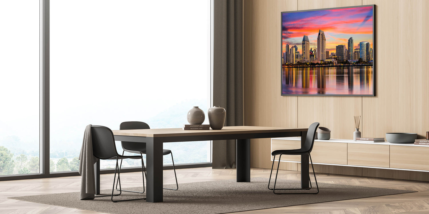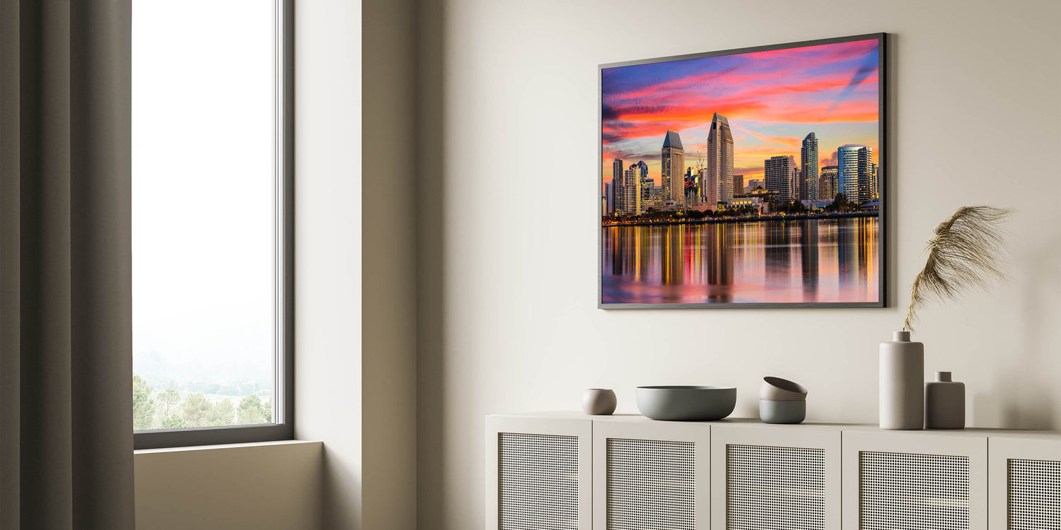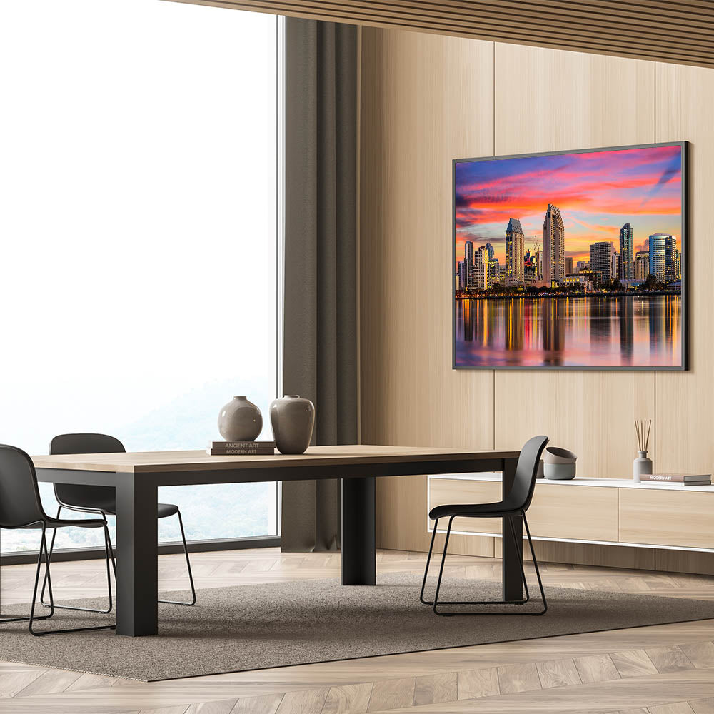Add a modern touch of California’s beauty to your decor with this vibrant Coronado skyline wall art. Capturing the illuminated cityscape at sunset, this stunning print brings the dynamic energy of Coronado Island to life. The colorful skies blend seamlessly with the mirrored reflections on the water, creating a breathtaking visual experience. Perfect for lovers of urban and coastal scenery, this piece makes a bold statement in any room.