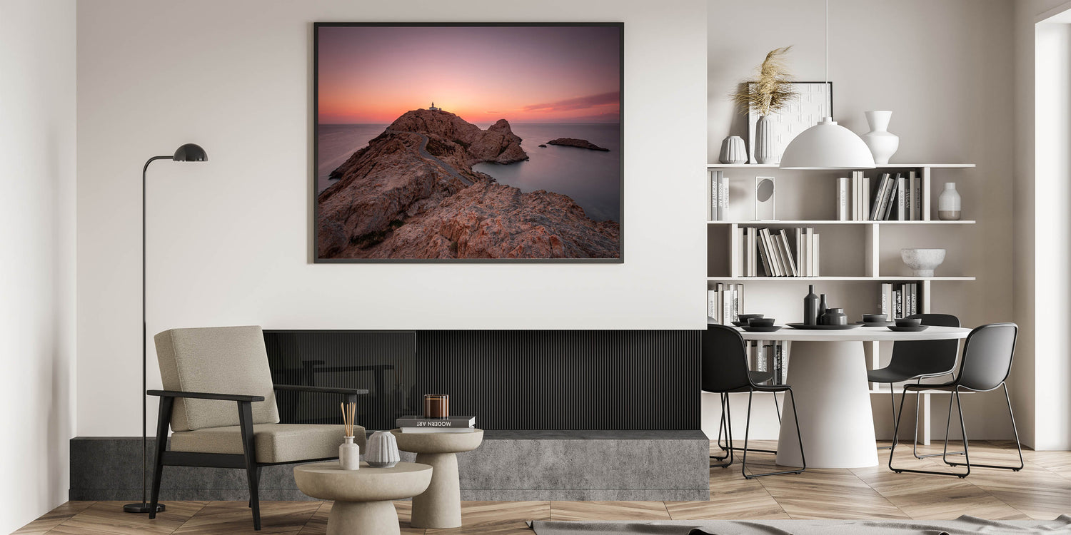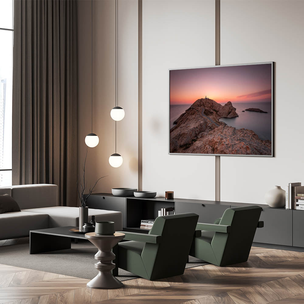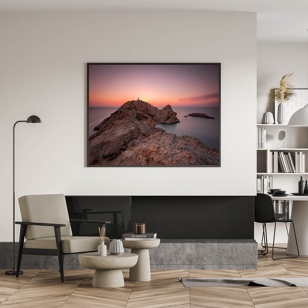Capture the dramatic beauty of Corsica’s coastline with this stunning wall art. This piece features a solitary lighthouse perched on a rocky peninsula, framed by a breathtaking sunset. The soft hues of the sky, combined with the rugged terrain, create a serene and timeless scene that will add a sense of calm and majesty to any room.