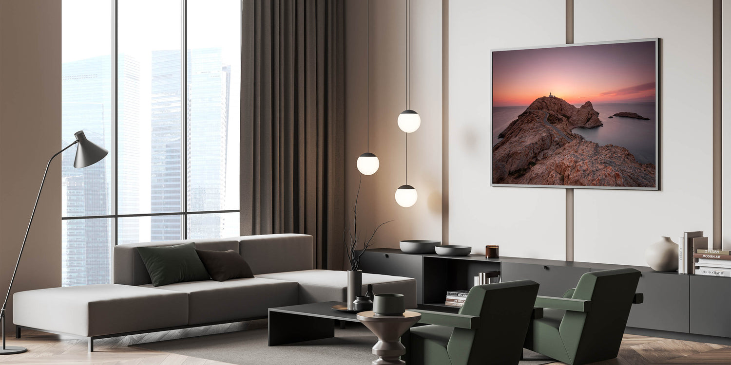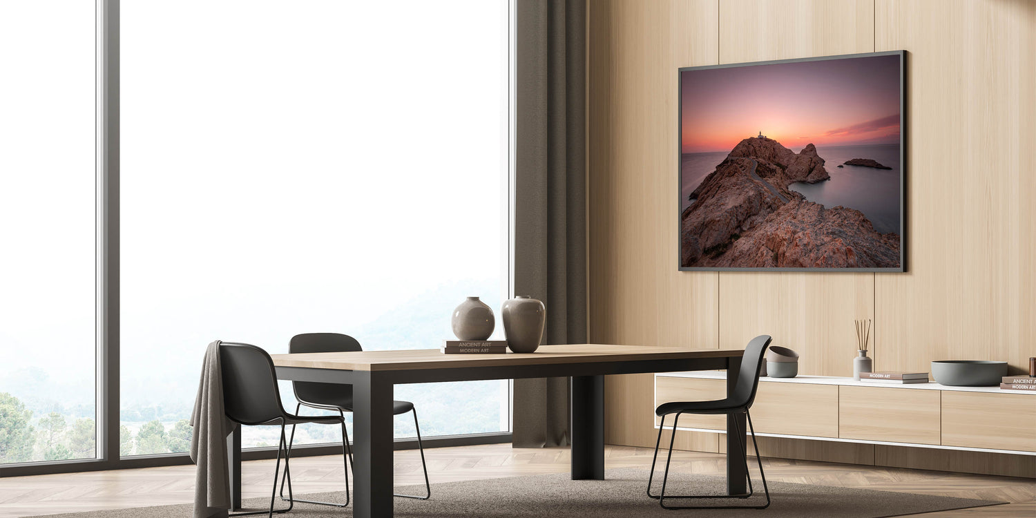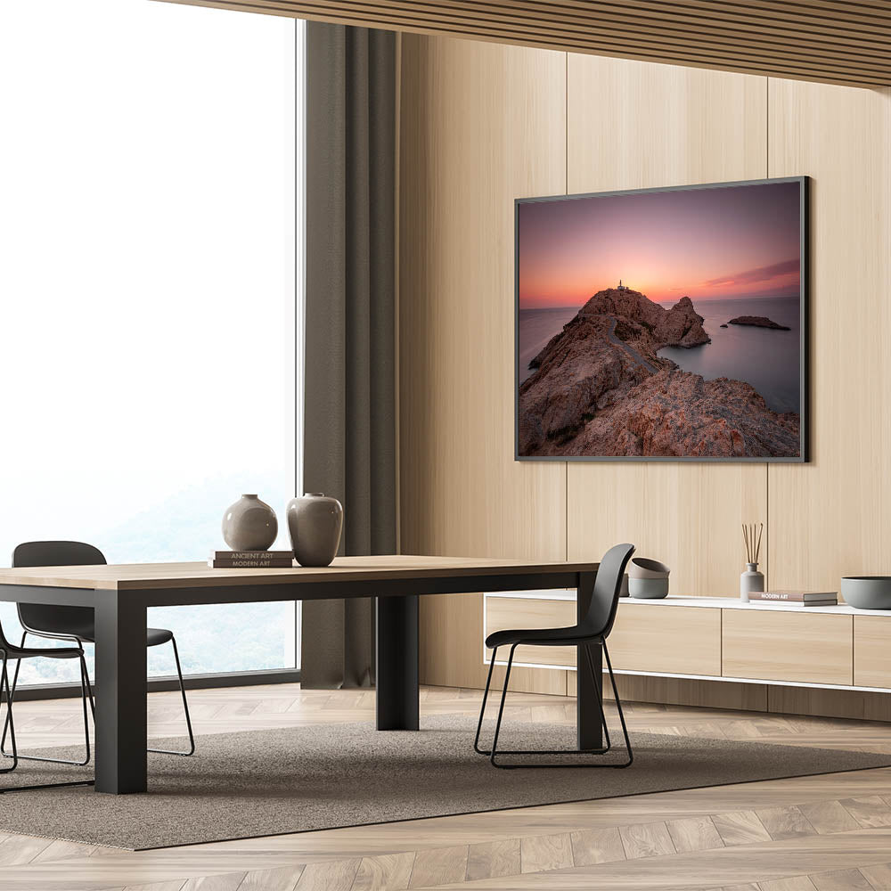 Capture the dramatic beauty of Corsica’s coastline with this stunning wall art. This piece features a solitary lighthouse perched on a rocky peninsula, framed by a breathtaking sunset. The soft hues of the sky, combined with the rugged terrain, create a serene and timeless scene that will add a sense of calm and majesty to any room.
