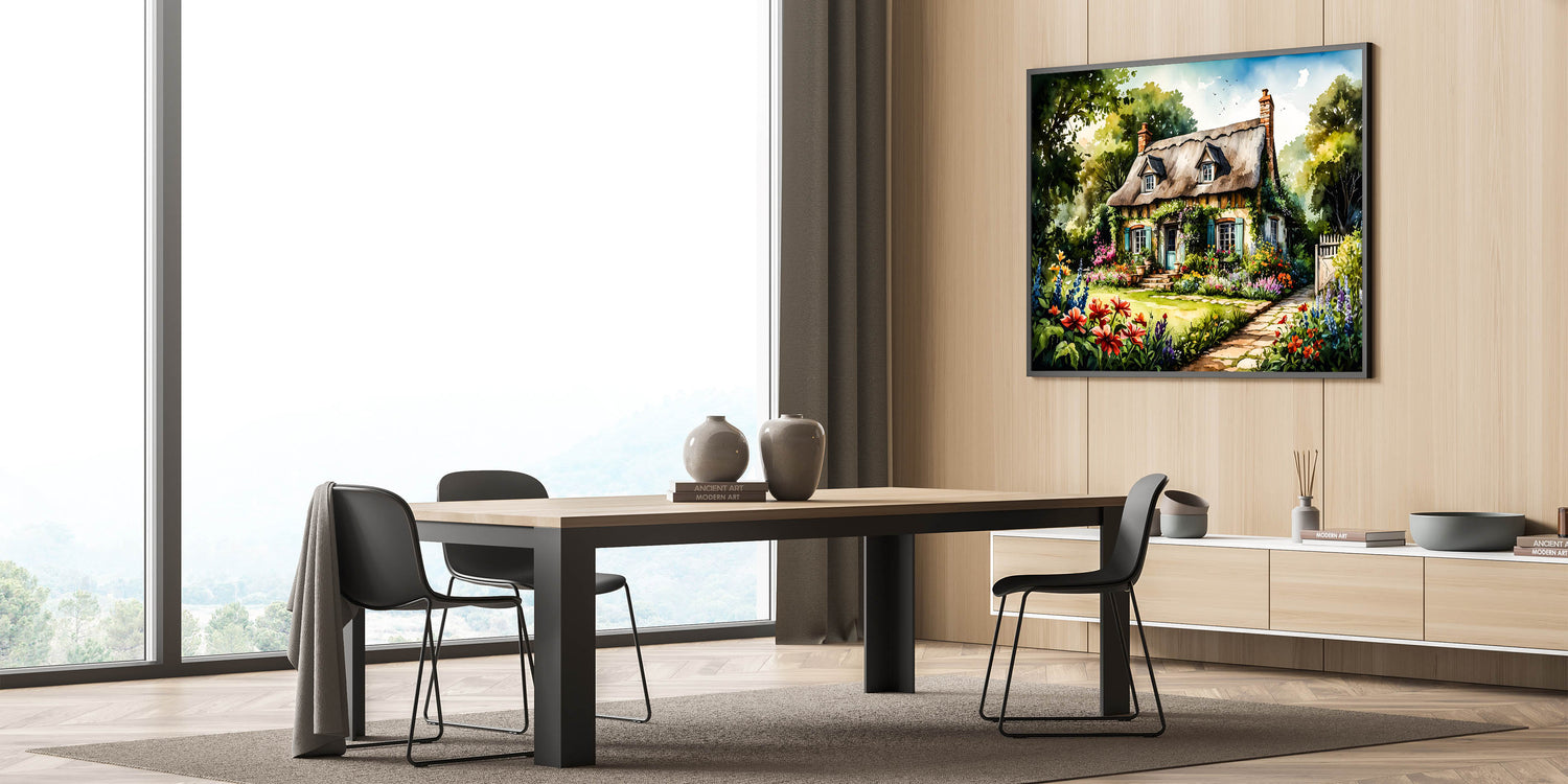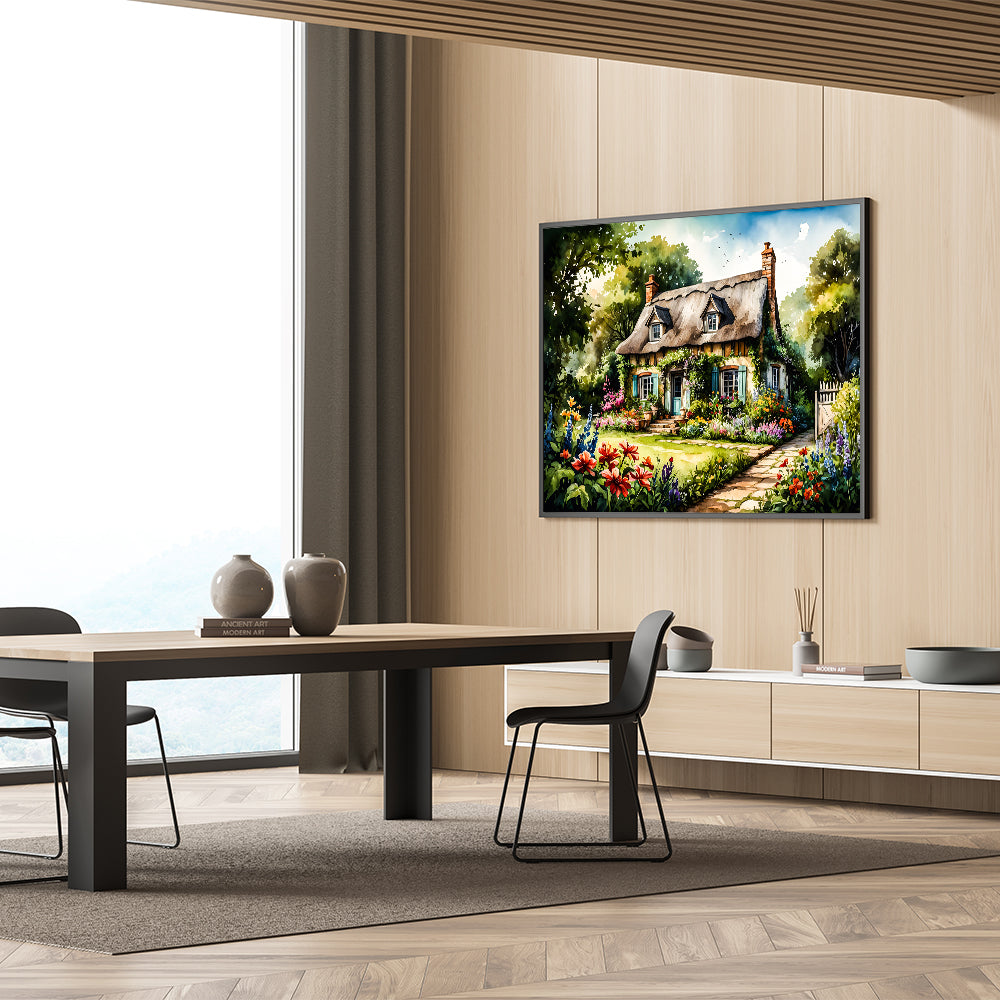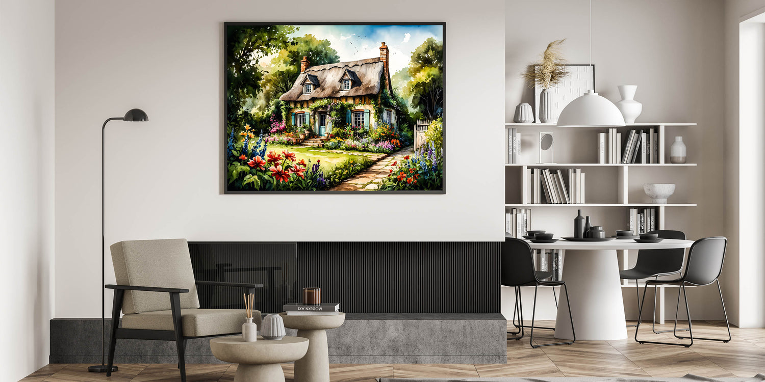 Transform your living space with this Enchanting Cottage Garden Wall Art, a perfect depiction of a charming cottage surrounded by a lush, vibrant garden. The artwork showcases a picturesque thatched-roof cottage, nestled amidst an explosion of colorful flowers and greenery. The detailed illustration captures the essence of an idyllic countryside retreat, making it an ideal piece for bringing the beauty and tranquility of nature into your home.