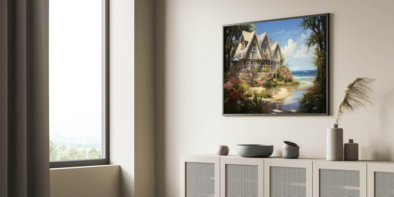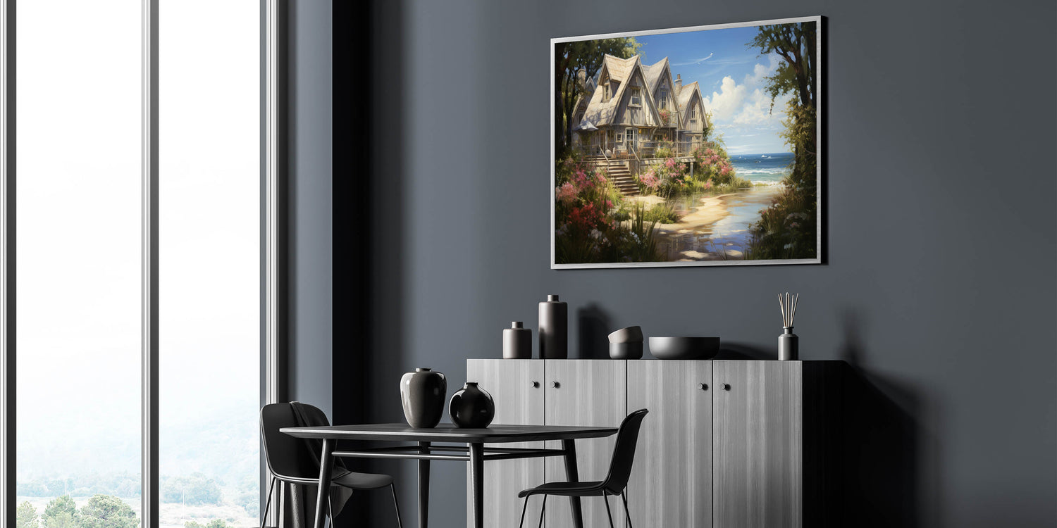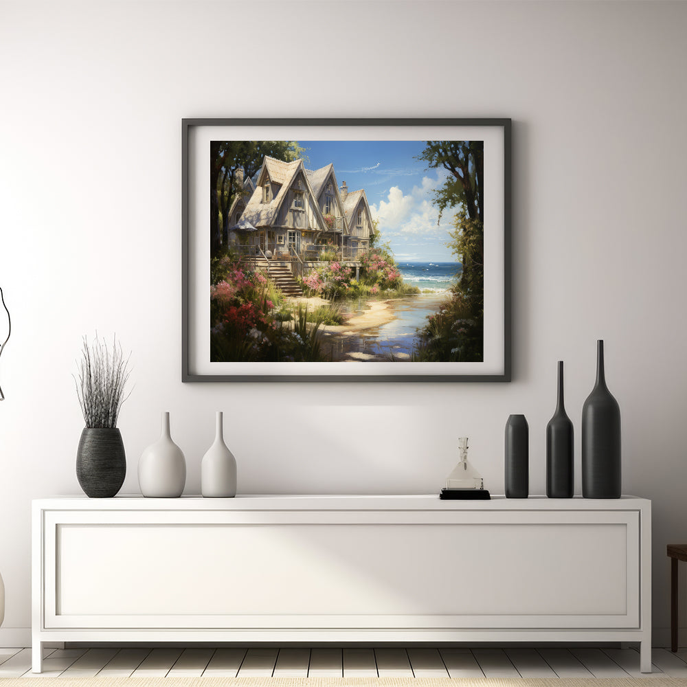Enhance your home decor with this exquisite Rustic Coastal Cottage Wall Art, capturing the essence of serene seaside living. This artwork portrays a charming row of cottages nestled by the coast, surrounded by lush greenery and vibrant flowers. The detailed depiction of the cottages with their sloped roofs and cozy balconies offers a tranquil retreat, making it a perfect piece to bring the peacefulness of the countryside into your space.