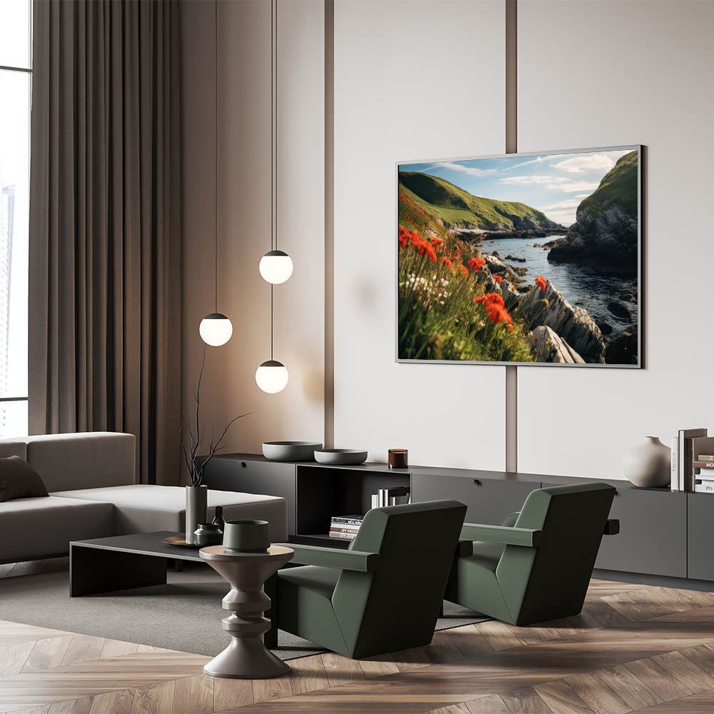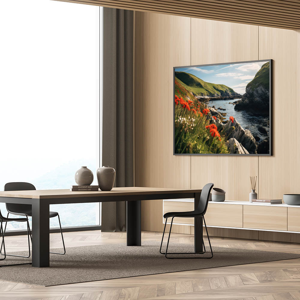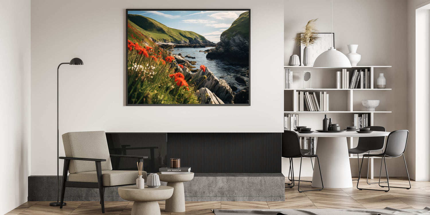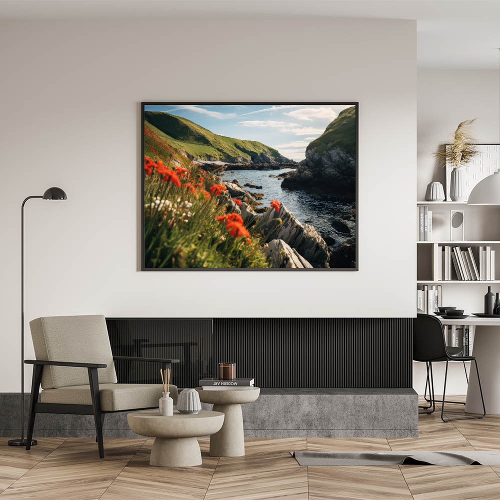Capture the serene beauty of the coastal countryside with this stunning wall art featuring vibrant wildflowers against a backdrop of rugged rocks and tranquil waters. The vivid red flowers in the foreground contrast beautifully with the lush green hills and the deep blue of the ocean, creating a scene that is both calming and invigorating. This artwork brings the freshness of the seaside and the charm of the countryside into your home, making it a perfect addition to any space.