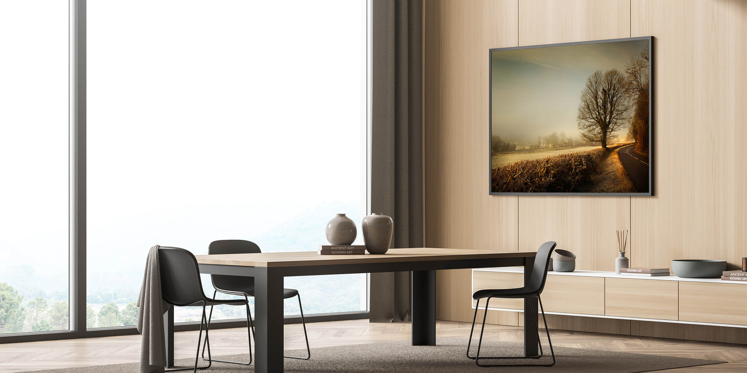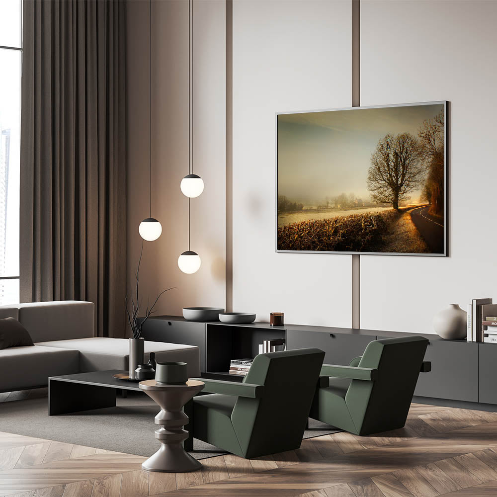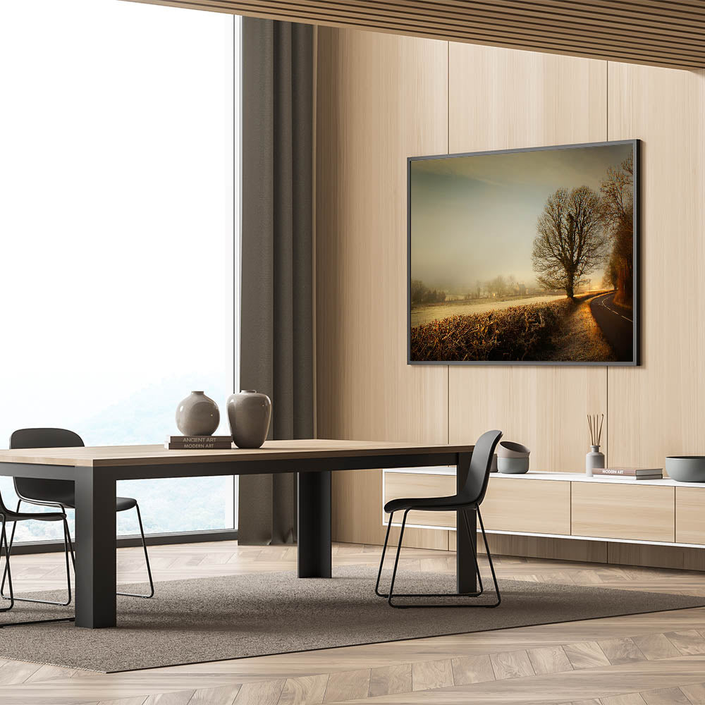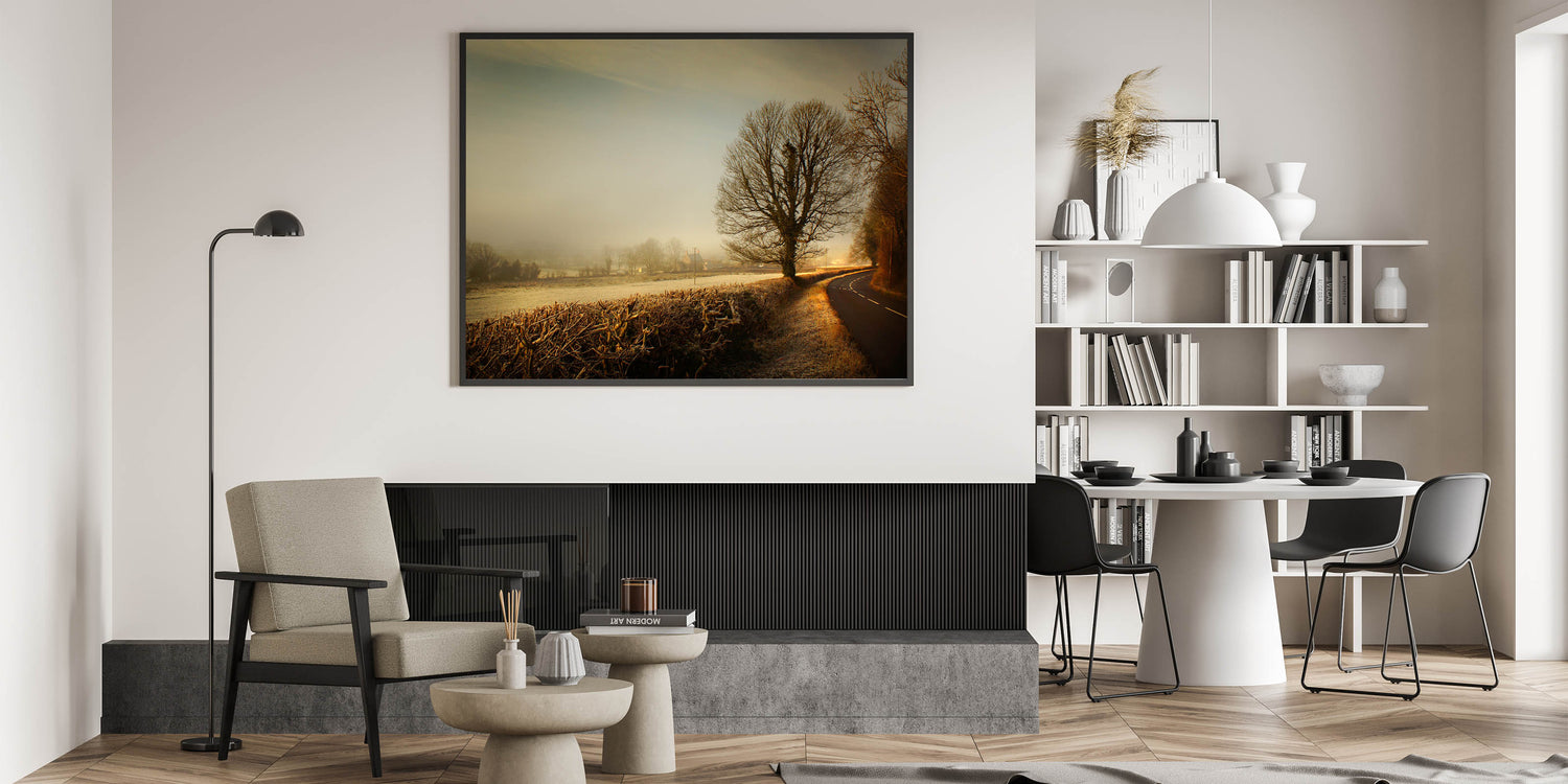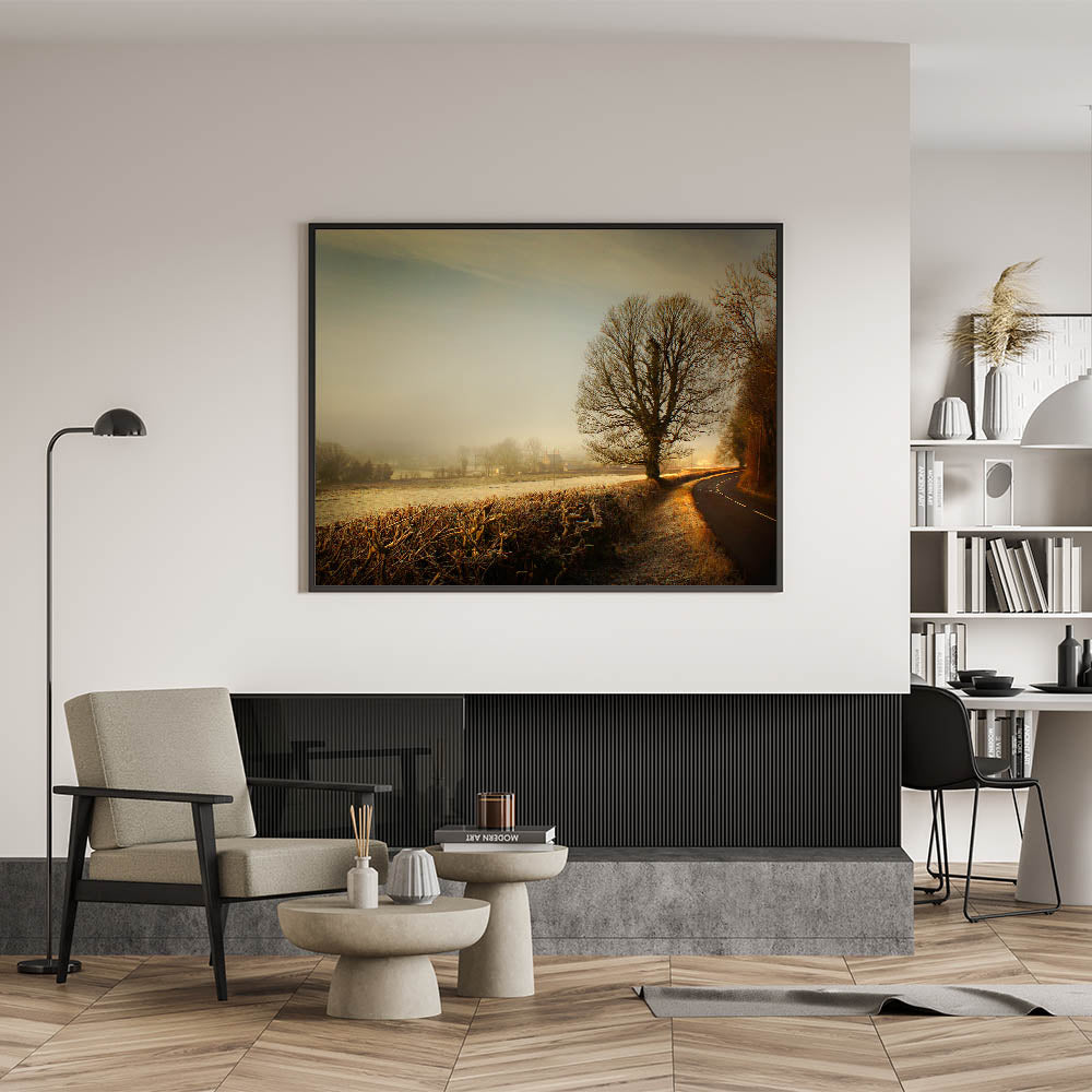 Bring the calm and peaceful ambiance of a country road into your home with this beautiful countryside wall art. This print features a misty morning scene along a quiet country road, bordered by bare trees and frost-covered fields. The soft golden light of the early sun casts a warm glow, adding depth and tranquility to the landscape. Perfect for those who appreciate the serene beauty of the countryside, this artwork will create a soothing and inviting atmosphere in any room.