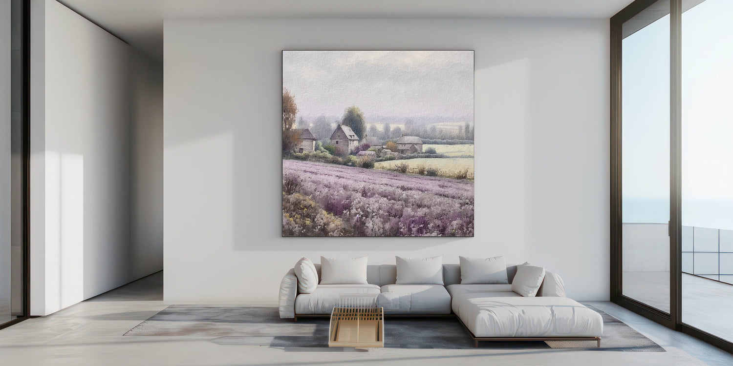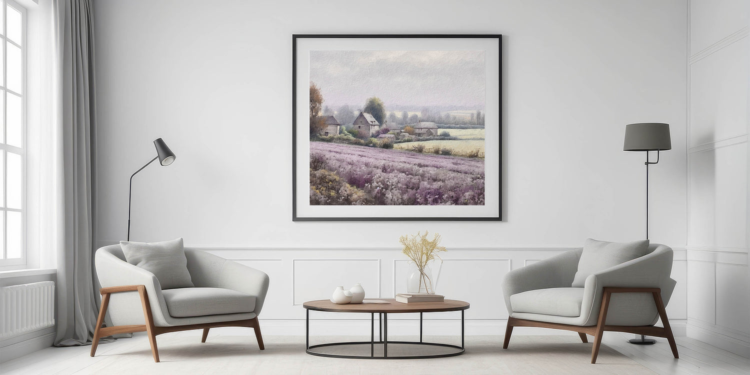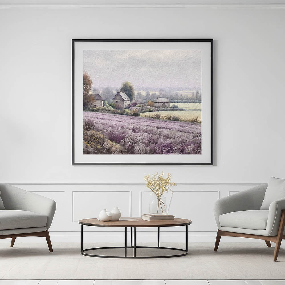 This countryside print is ideal for those who love the calming essence of lavender fields and the simplicity of rural farmhouses. Perfect for your living room, bedroom, or hallway, this piece brings a serene and cozy atmosphere to any space.