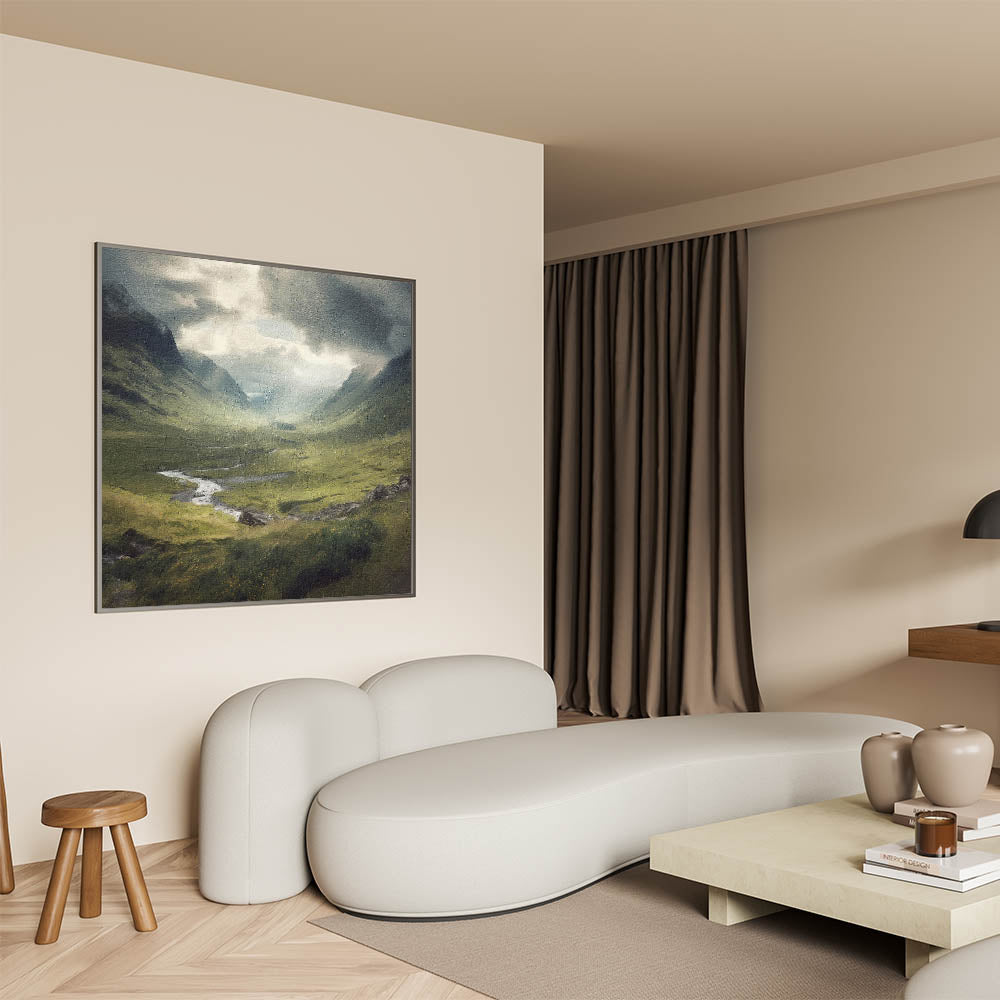 Embrace the breathtaking beauty of nature with this stunning wall art of a dramatic mountain valley. Capturing the power and serenity of a river winding through a vast, green landscape, this piece is perfect for those who appreciate the grandeur of rugged terrain. The interplay of light and shadow across the mountains and valley creates a mesmerizing scene, ideal for adding depth and beauty to any room.