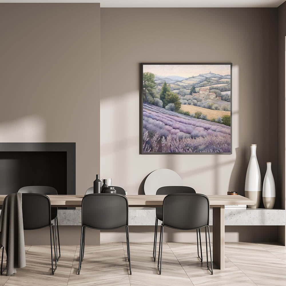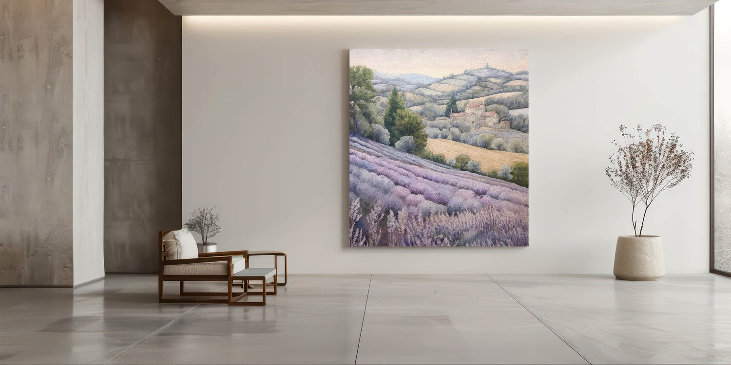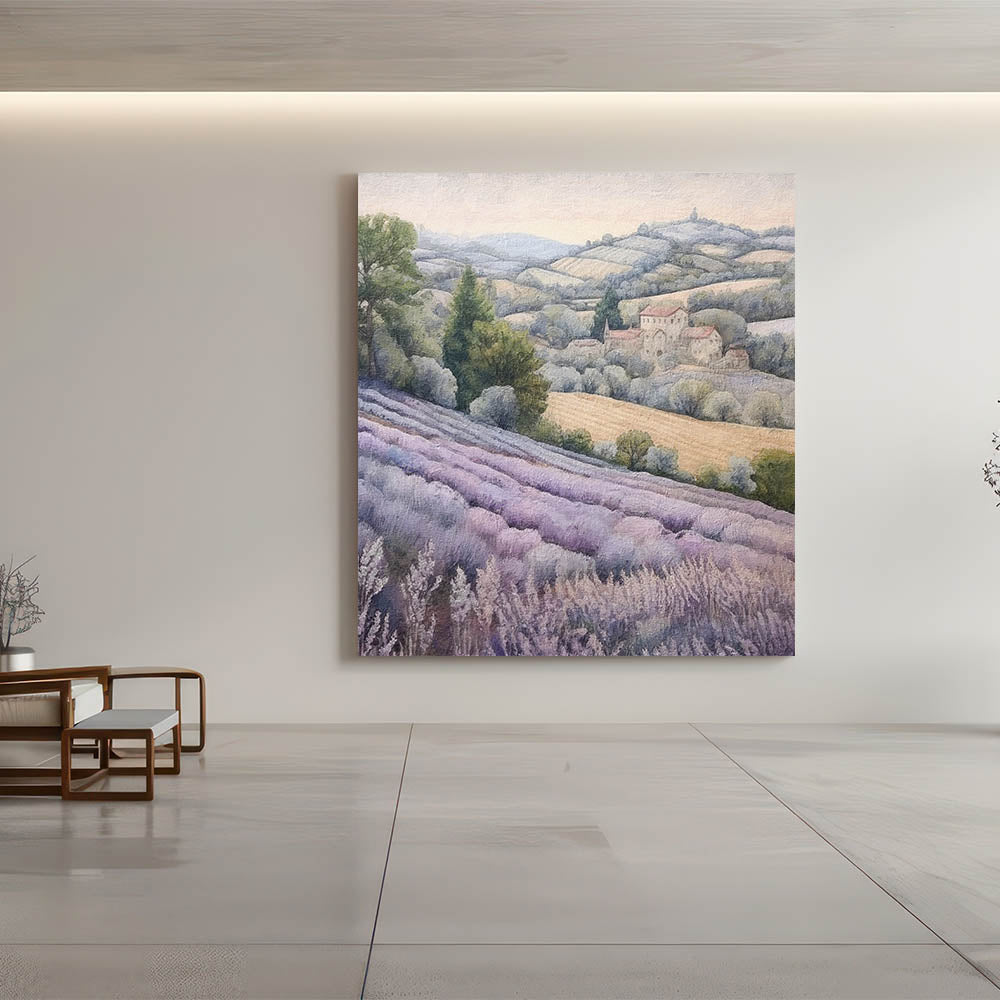 Bring the serene charm of a lavender-filled countryside into your living room, bedroom, or hallway with this artwork. Its soft pastel tones and picturesque composition make it a beautiful addition to any room where relaxation and natural beauty are valued.