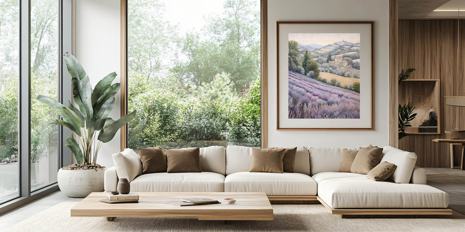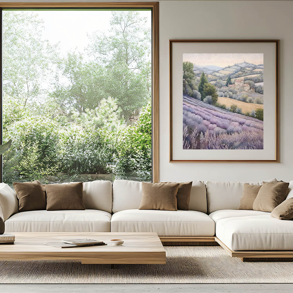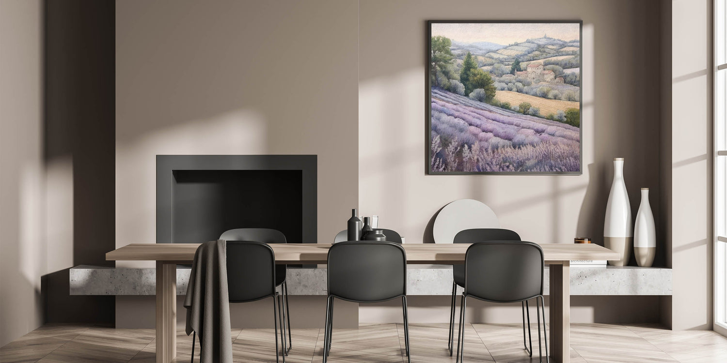 Bring the serene charm of a lavender-filled countryside into your living room, bedroom, or hallway with this artwork. Its soft pastel tones and picturesque composition make it a beautiful addition to any room where relaxation and natural beauty are valued.