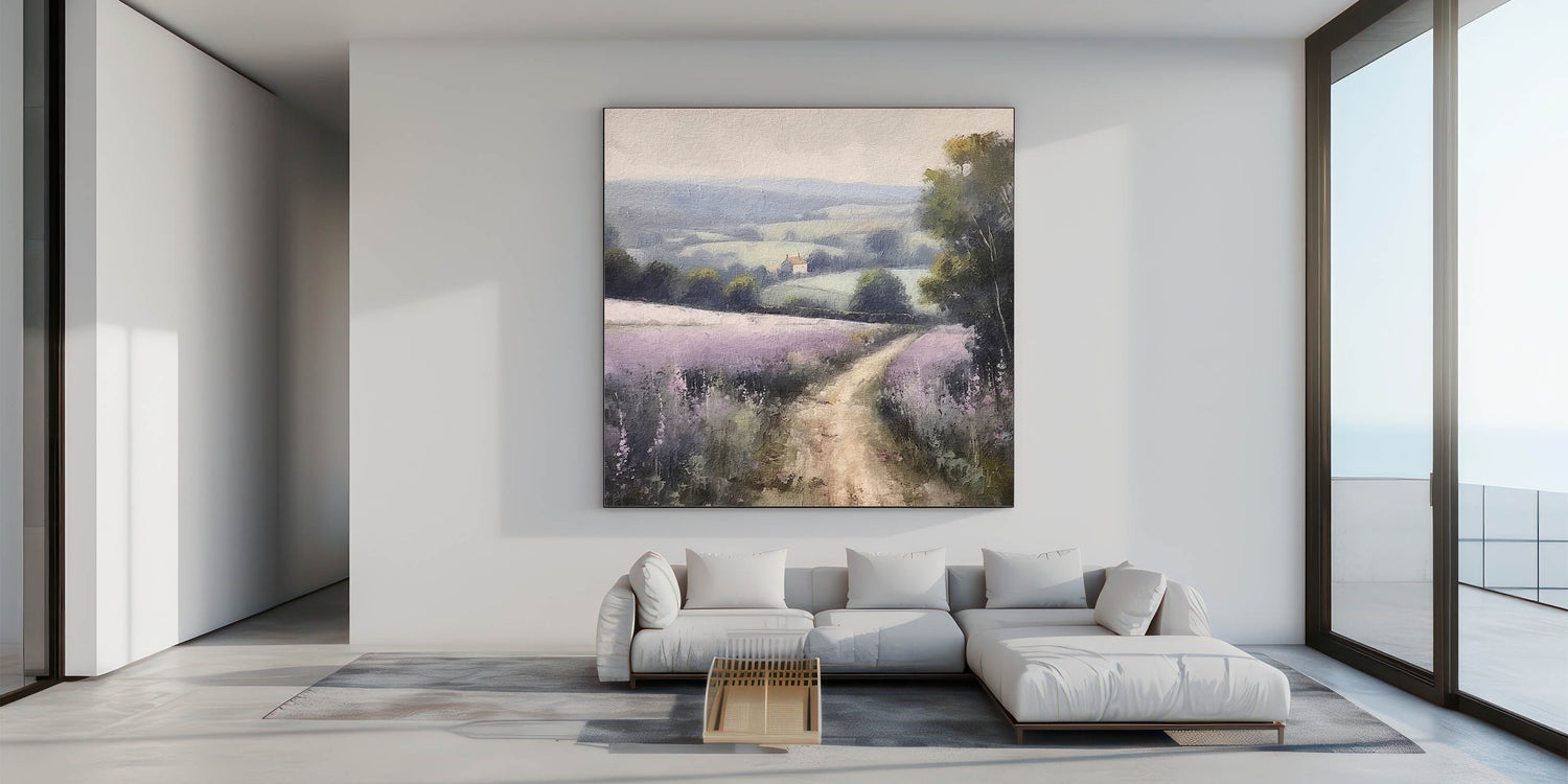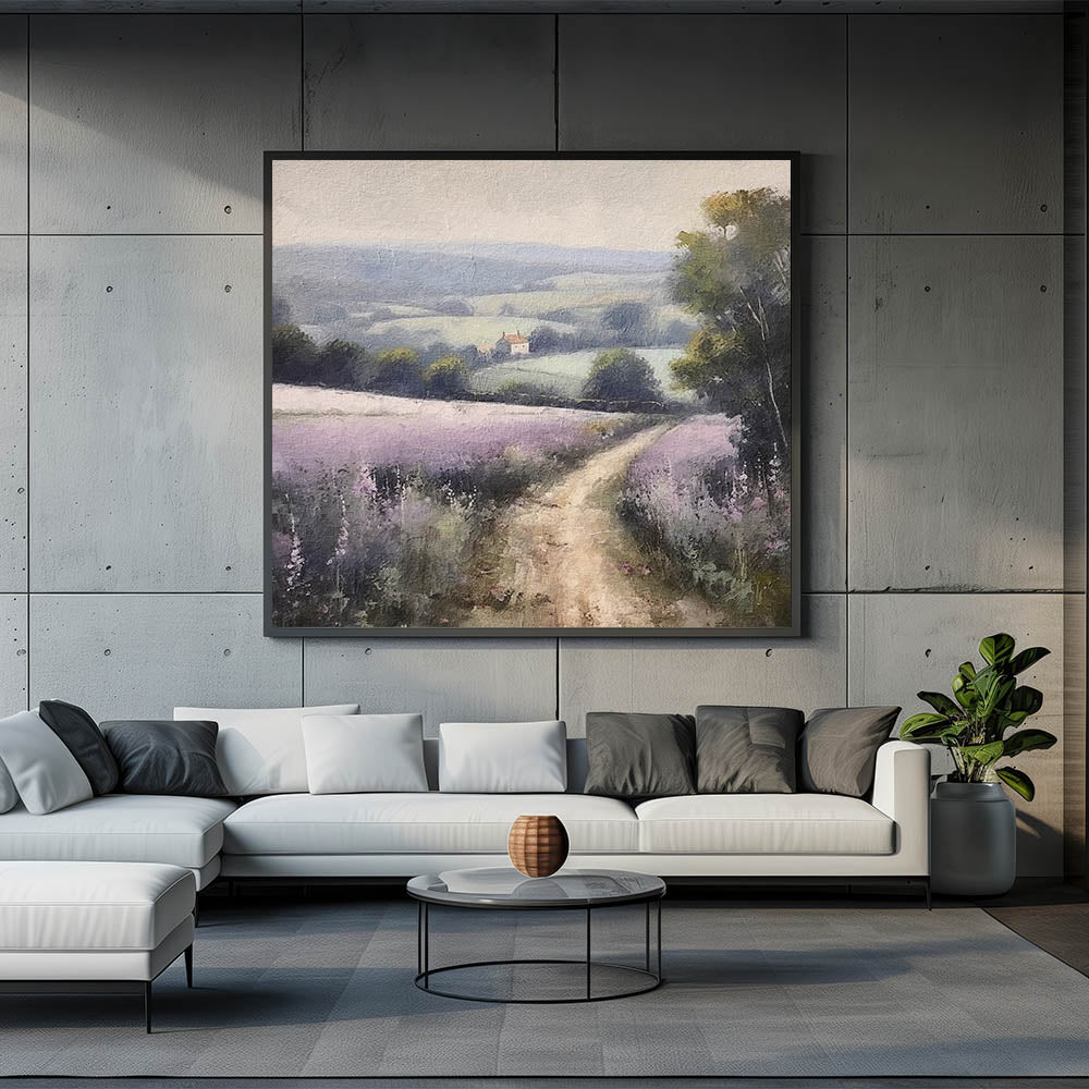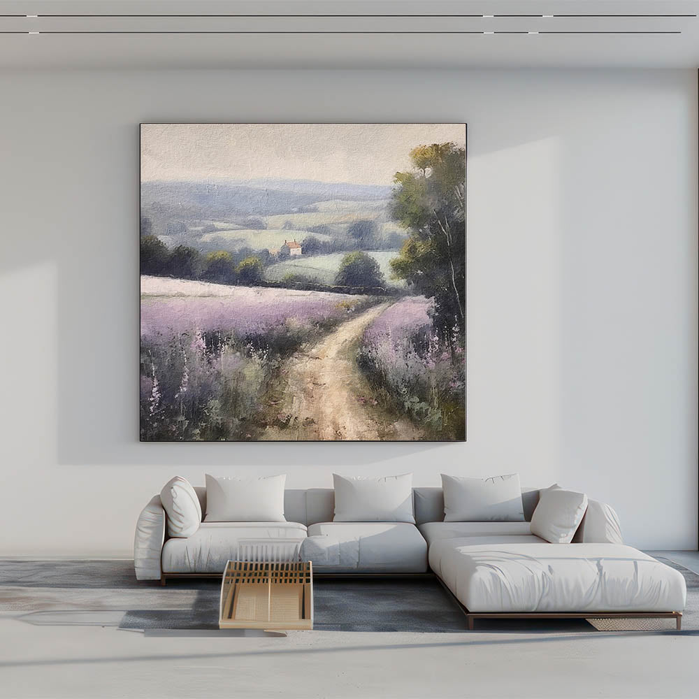 Step into the tranquility of rural life with this serene wall art featuring a path through lush lavender fields leading to a distant farmhouse. This piece captures the peaceful essence of the countryside, with gentle colors and soft textures that bring a sense of calm and nostalgia. Perfect for rustic or nature-inspired decor, this artwork creates an inviting atmosphere in any room.