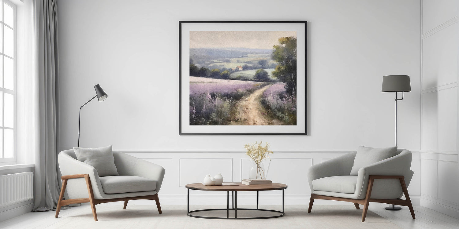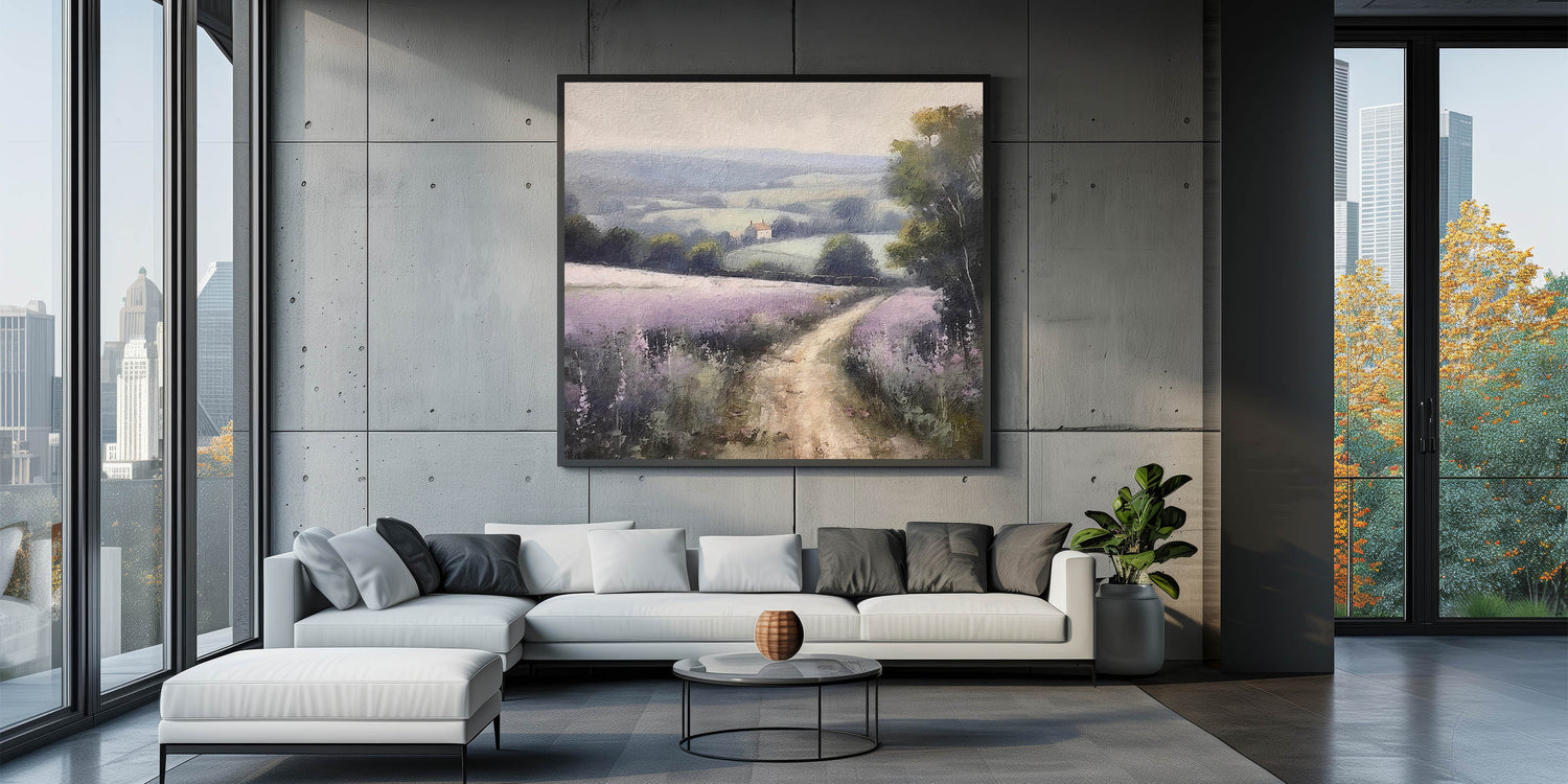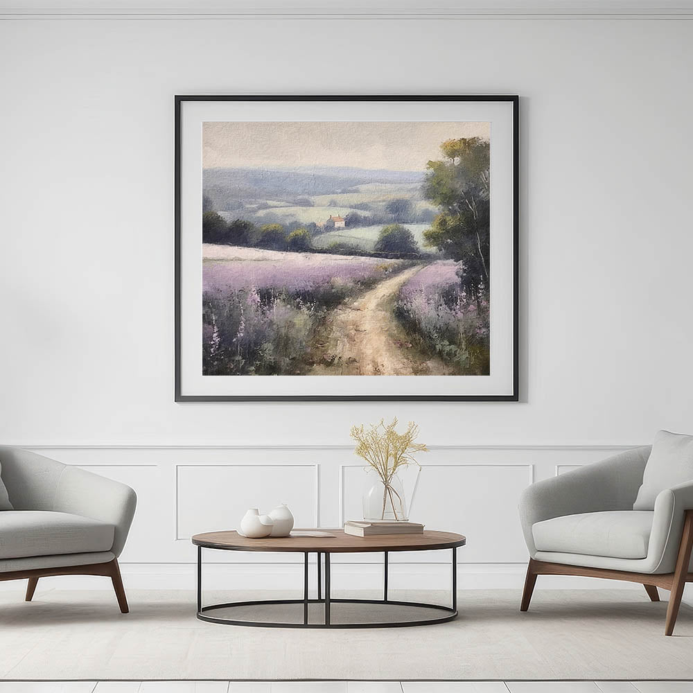 Step into the tranquility of rural life with this serene wall art featuring a path through lush lavender fields leading to a distant farmhouse. This piece captures the peaceful essence of the countryside, with gentle colors and soft textures that bring a sense of calm and nostalgia. Perfect for rustic or nature-inspired decor, this artwork creates an inviting atmosphere in any room.