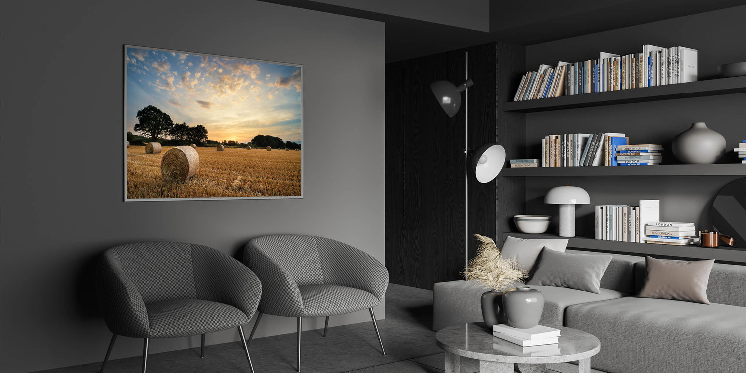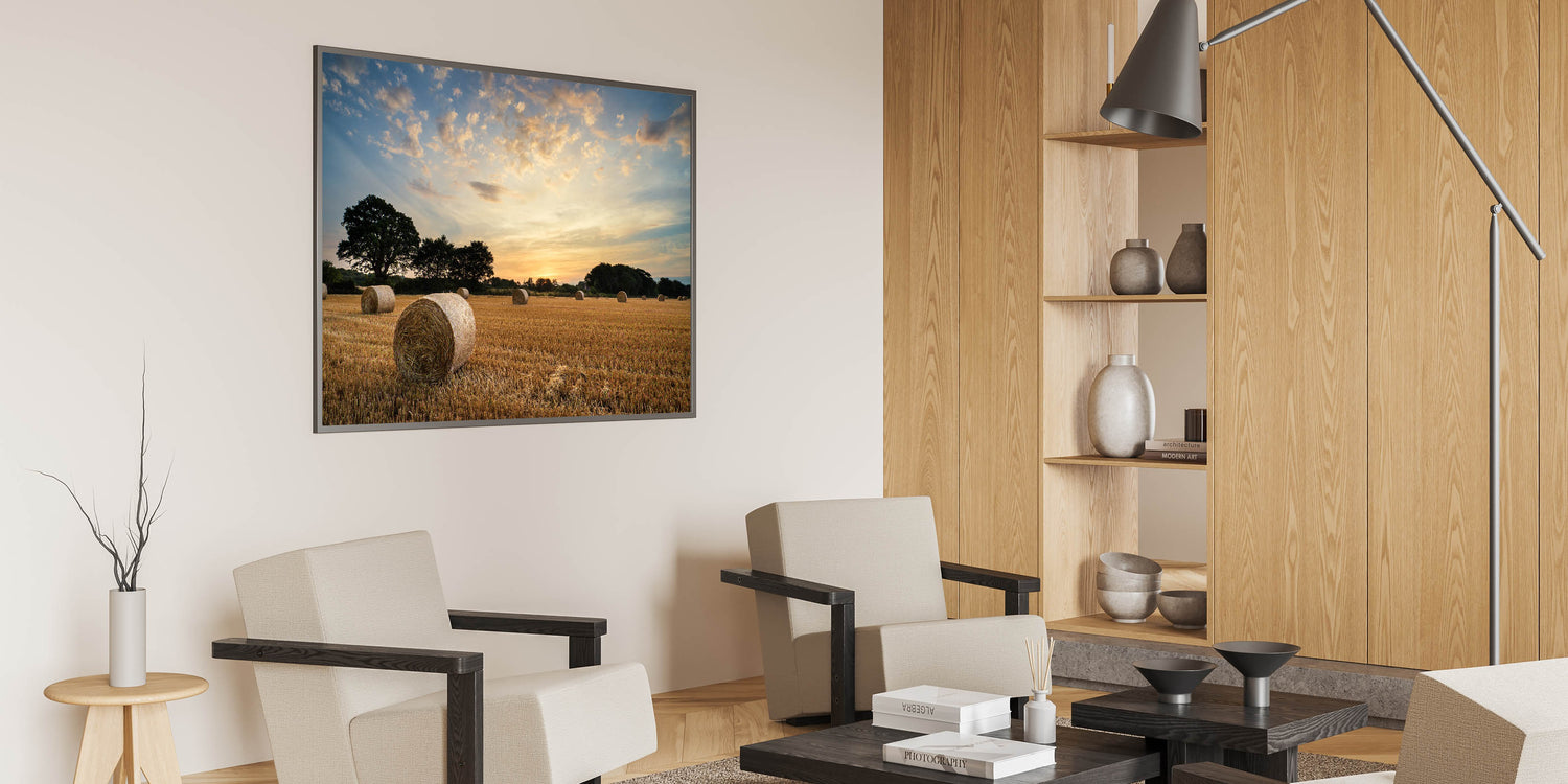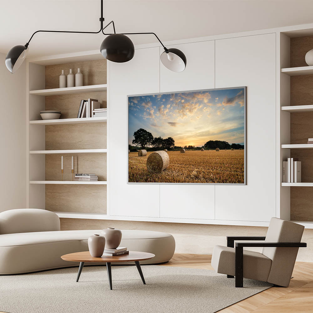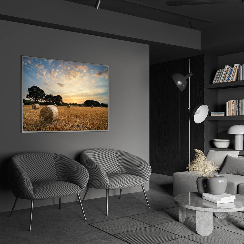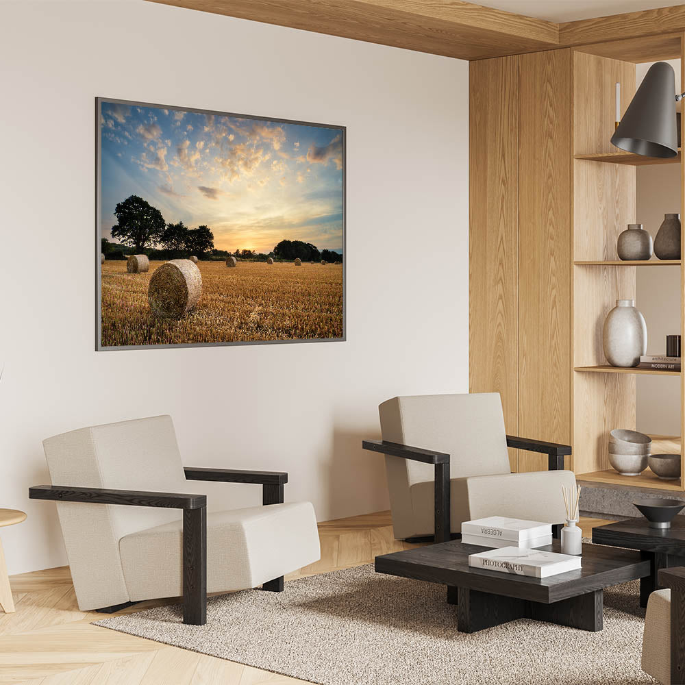 Bring the peaceful charm of the countryside into your home with this Rural Landscape Canvas, featuring a tranquil scene of hay bales scattered across an open field under a glowing sunset. The soft golden hues of the sun dipping below the horizon, combined with the earthy tones of the hay bales, create a calming and warm atmosphere that perfectly captures the essence of rural life. This artwork is an ideal addition to any space that seeks to evoke the serenity and simplicity of nature.