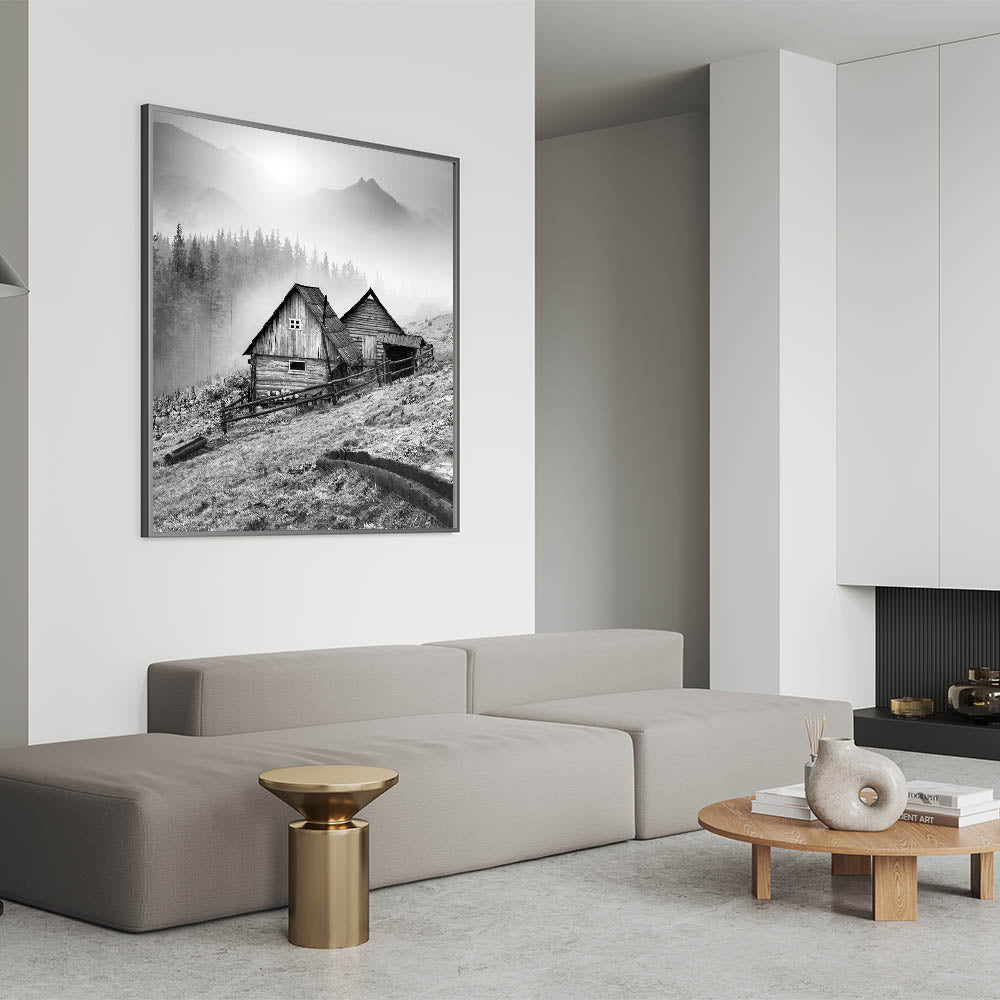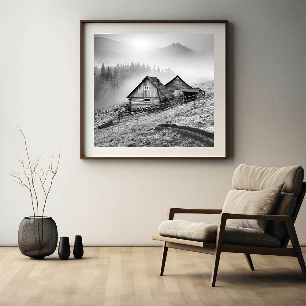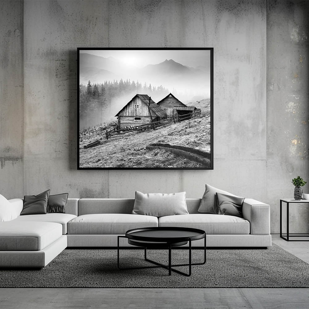 Transform your living space with this captivating piece of rustic countryside wall art. Featuring a serene black-and-white image of a charming wooden farmhouse nestled in a misty, mountainous landscape, this artwork brings the tranquil beauty of rural life into your home. Perfect for those who appreciate the peaceful simplicity of the countryside, this print captures the essence of pastoral life with its detailed depiction of nature and architecture.