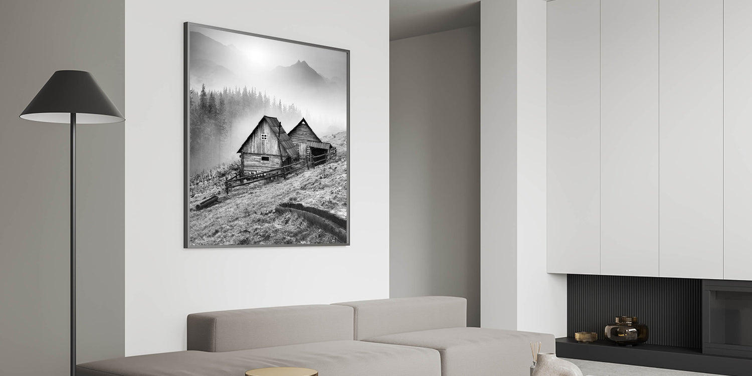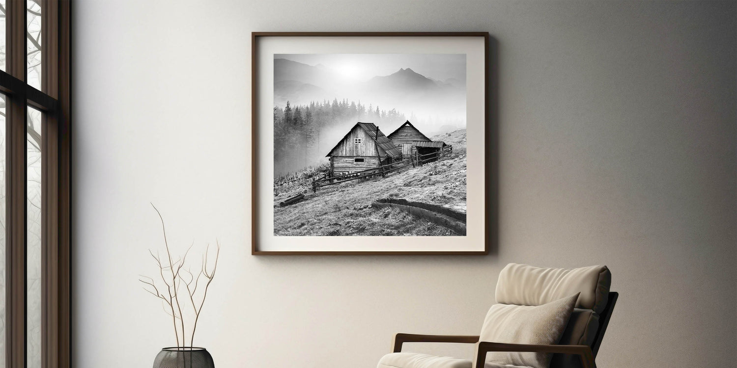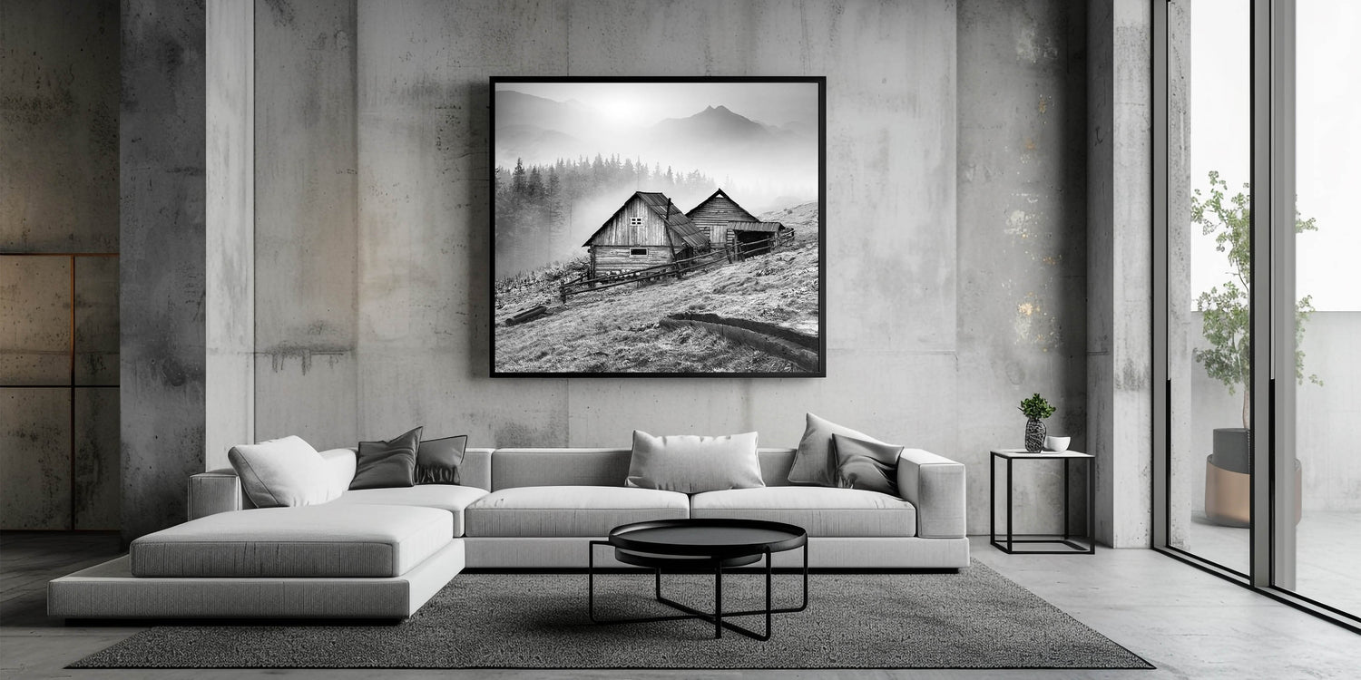 Transform your living space with this captivating piece of rustic countryside wall art. Featuring a serene black-and-white image of a charming wooden farmhouse nestled in a misty, mountainous landscape, this artwork brings the tranquil beauty of rural life into your home. Perfect for those who appreciate the peaceful simplicity of the countryside, this print captures the essence of pastoral life with its detailed depiction of nature and architecture.