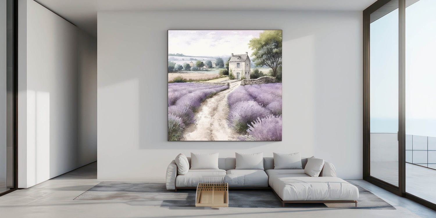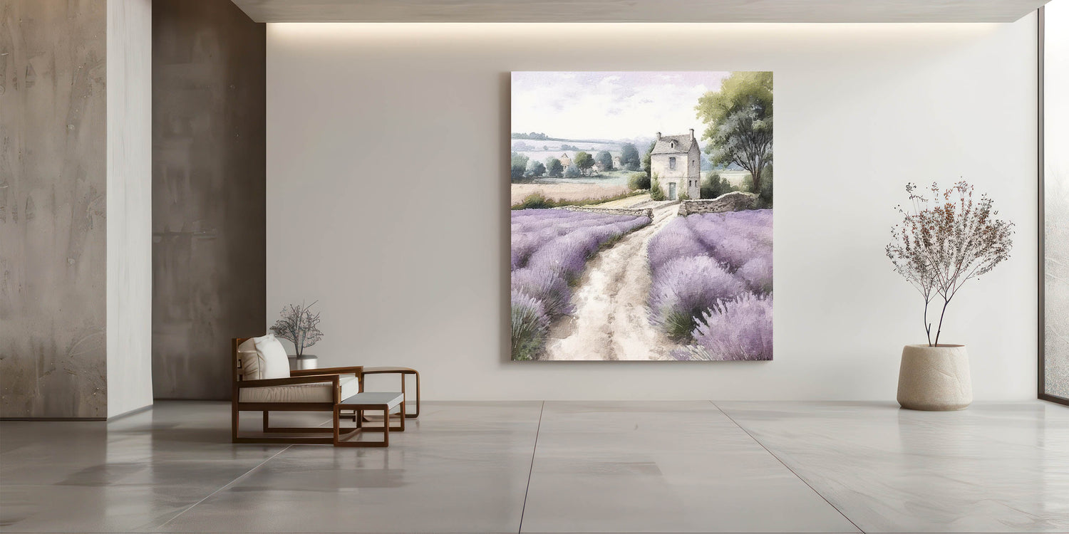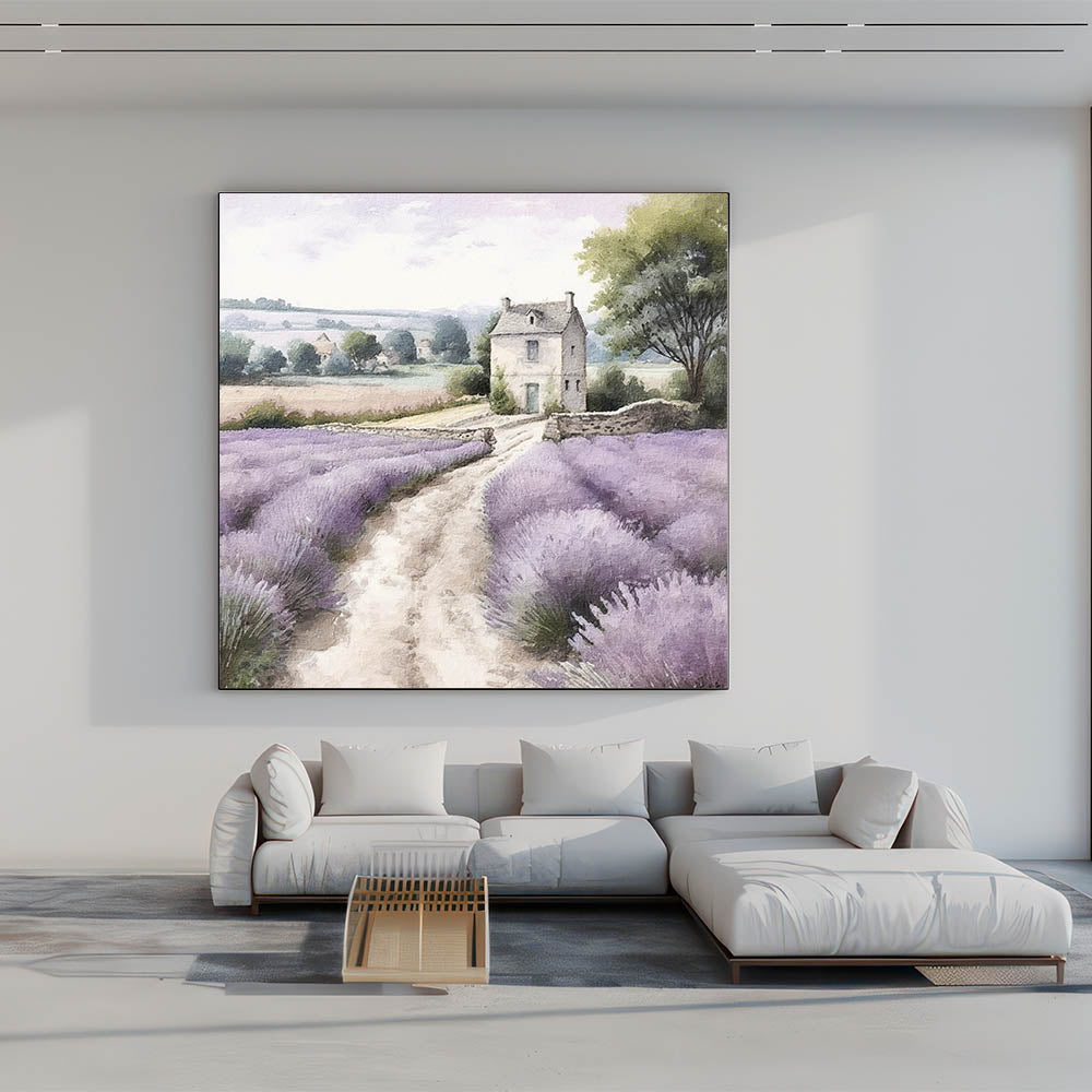 Capture the beauty of country living with this stunning countryside wall art. This print features a breathtaking lavender field leading to a charming farmhouse, making it an ideal piece for adding rustic charm to your home. The soft lavender hues and peaceful rural setting evoke a sense of serenity and timeless beauty.
