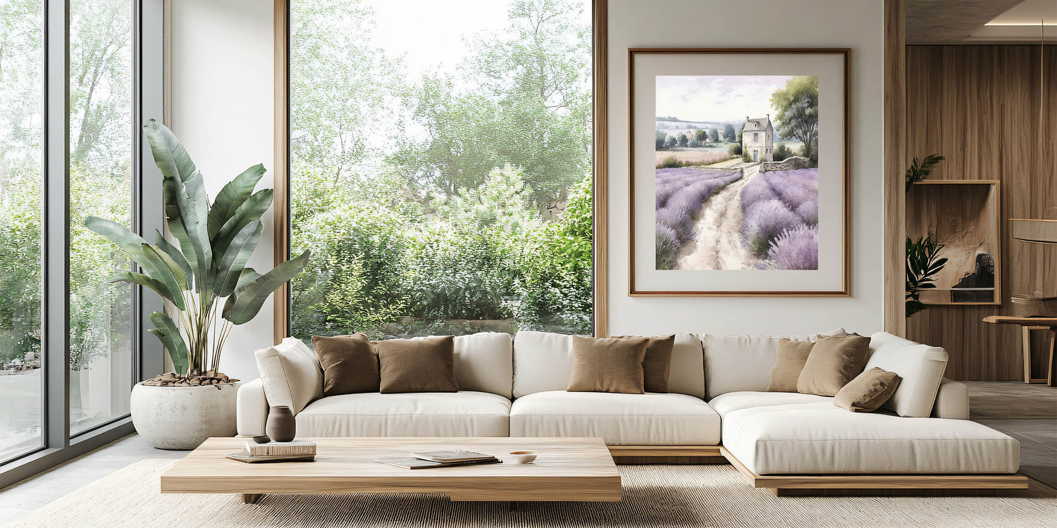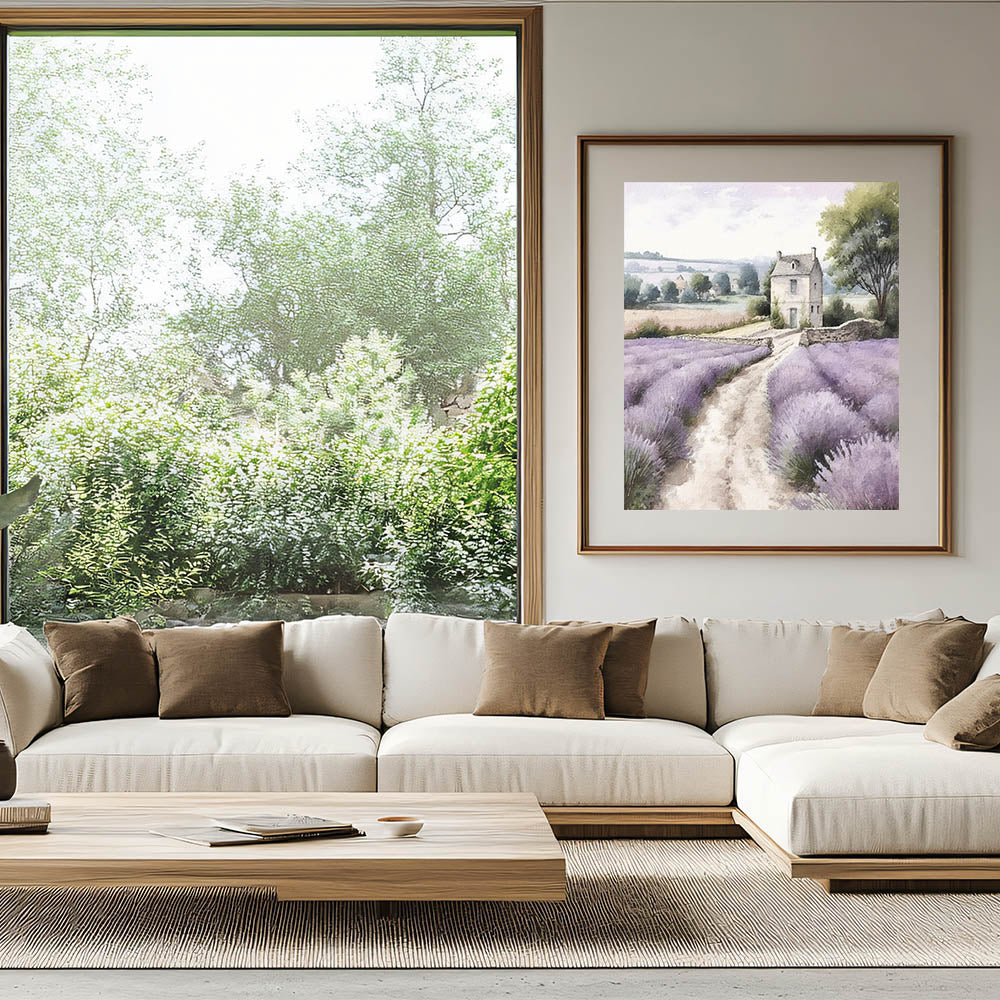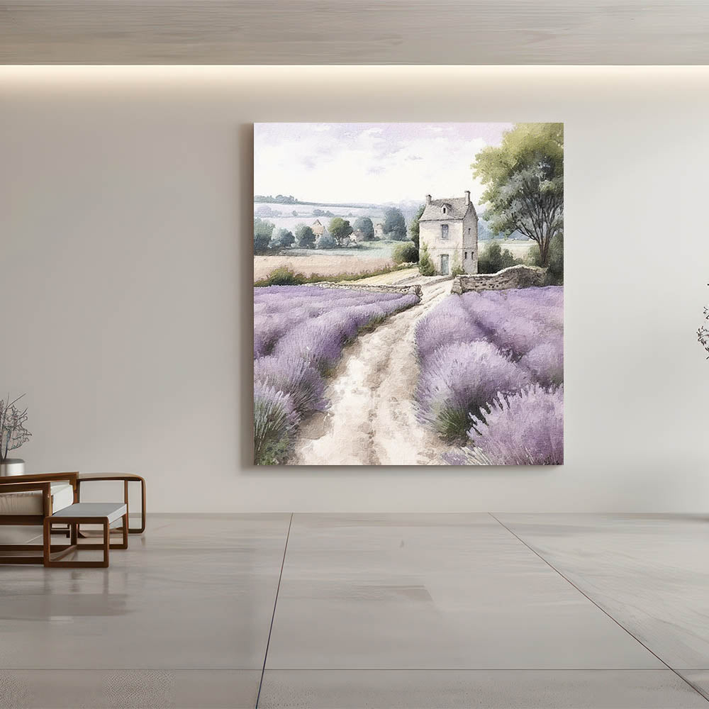 This countryside art print is perfect for bringing the tranquility of nature into your living room, bedroom, or hallway. The elegant combination of soft lavender and the rustic farmhouse makes it a standout piece in any home decor, especially for those who love the charm of rural landscapes.
